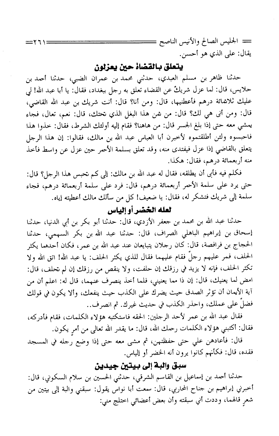 حَدَّثَنَا ظَاهر بْن مُسْلِم الْعَبْدِيّ، حَدَّثَنِي مُحَمَّد بْن عِمْرَانَ الضَّبِّيّ، حَدَّثَنَا أَحْمَد بْن حلايس، قَالَ: لما عُزل شريكٌ عَنِ الْقَضَاء تعلَّق بِهِ رَجُلٌ ببغدادَ، فَقَالَ: يَا أَبَا عَبْد اللَّه! لي عَلَيْك ثلثمِائة دِرْهَم فأعْطِنَاهَا، قَالَ: وَمن أَنا؟ قَالَ: أَنْت شريك بْن عَبْد اللَّه القَاضِي، قَالَ: وَمن أَنَّى هِيَ لَك؟ قَالَ: من ثمن هَذَا الْبَغْل الَّذِي تَحْتك، قَالَ: نعم، تَعَال، فجَاء يمشي مَعَه حَتَّى إِذا بلغ الْجِسْر قَالَ: من هَاهُنَا؟ فَقَامَ إِلَيْهِ أولَئِك الشُّرَط، فَقَالَ: خُذُوا هَذَا فاحبسوه وَلَئِن أطلقتموه لأخبرنَّ أَبَا الْعَبَّاس عَبْد اللَّه بْن مَالك، فَقَالُوا: إِن هَذَا الرَّجُل يتَعَلَّق بِالْقَاضِي إِذا عُزِل فيفتدي مِنْهُ، وَقَدْ تعلق بسلمة الْأَحْمَر حِين عزل عَنْ وَاسِط فَأخذ مِنْهُ أَرْبَعمِائَة دِرْهَم، فَقَالَ: هَكَذَا.