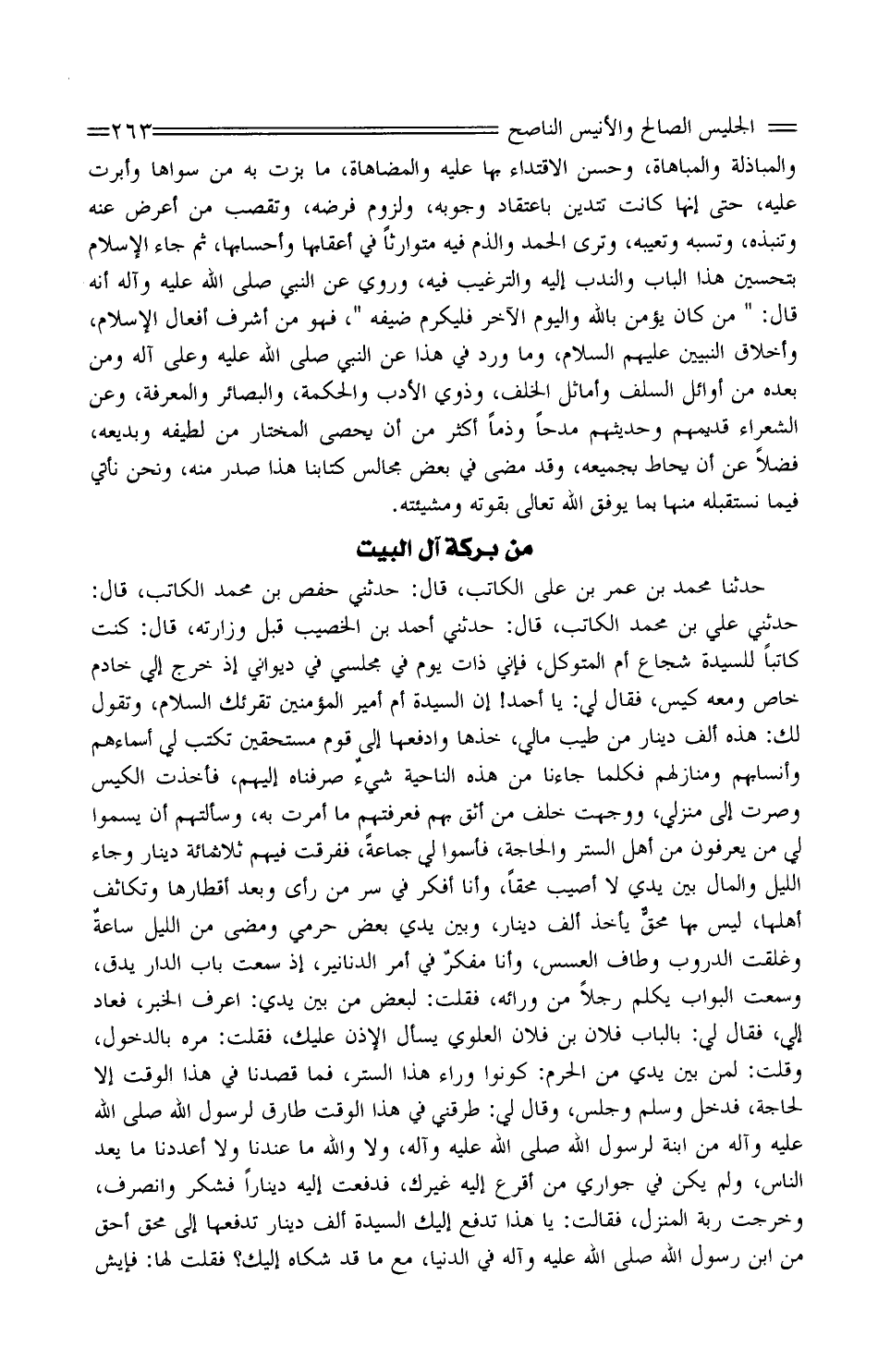 حَدَّثَنَا مُحَمَّد بْن عُمَر بْن عَلِيّ الْكَاتِب، قَالَ: حَدَّثَنِي حَفْص بْن مُحَمَّد الْكَاتِب، قَالَ: حَدَّثَنِي عَلِيّ بْن مُحَمَّد الْكَاتِب، قَالَ: حَدَّثَنِي حمد بْن الخصيب قبل وزارته، قَالَ: كُنْت كَاتبا للسيدة شُجَاع أمّ المتَوَكل، فَإِنِّي ذَات يوْم فِي مجلسي فِي ديواني إِذْ خرج إليّ خَادِم خَاص وَمَعَهُ كيس، فَقَالَ لي: يَا أَحْمَد! إِن السيدة أم أَمِير الْمُؤْمِنِين تقرئك السَّلام، وَتقول لَك: هَذِهِ ألف دِينَار من طيِّب مَالِي، خُذْها وادفعها إِلَى قوم مستحقين تكتبُ لي أَسْمَاءَهُم وأنسابهم ومنازلهم فَكلما جَاءَنَا من هَذِهِ النَّاحِيَة شيءٌ صَرَفْناه إِلَيْهِم، فَأخذت الْكيس وصرت إِلَى منزلي، ووجهت خلف من أَثِق بهم فعرفتهم مَا أمرت بِهِ، وسألتهم أَن يُسموا لي من يعْرفُونَ من أَهْل السّتْر وَالْحَاجة، فأسْمَوْا لي جمَاعَة، ففرقت فيهم ثلثمِائة دِينَار وَجَاء اللَّيْل وَالْمَال بَيْنَ يَدي لَا أُصِيب مُحِقًّا، وَأَنا أفكر فِي سُرَّ من رَأَى وبُعْد أقطارها وتكاثف أَهلهَا، لَيْسَ بهَا محقٌ يَأْخُذ ألف دِينَار، وبَيْنَ يَدي بعضُ حُرَمي وَمضى من اللَّيْل ساعةٌ وغُلِّقت الدُّرُوبُ وَطَاف العَسَسُ، وَأَنا مفكرٌ فِي أَمر الدَّنَانِير، إِذْ سَمِعْتُ بَاب الدَّار يدقُّ، وسَمِعْتُ البواب يكلم رَجُلا من وَرَائه، فَقلت: لبَعض مَنْ بَيْنَ يديّ: اعرف الْخَبَر، فَعَاد إليّ، فَقَالَ لي: بِالْبَابِ فُلان بْن فُلان العَلَويّ يسألُ الْإِذْن عَلَيْك، فَقلت: مُرْه بِالدُّخُولِ، وَقلت: لمن بَيْنَ يَدي من الْحُرم: كونُوا وَرَاء هَذَا السّتْر، فَمَا قَصَدَنا فِي هَذَا الْوَقْت إِلا لحَاجَة، فَدخل وَسلم وَجلسَ، وقَالَ لي: طَرَقَني فِي هَذَا الْوَقْت طَارق لرَسُول اللَّه صلّى اللَّه عَلَيْه وَآله من ابْنة لرَسُول اللَّه صلّى اللَّه عَلَيْه وَآله، وَلا واللَّه مَا عندنَا وَلا أعْدَدنا مَا يَعُدّ النّاس، وَلَم يَكُنْ فِي جواري من أَقرع إِلَيْهِ غَيْرك، فَدفعت إِلَيْهِ دِينَارا فَشكر وَانْصَرف، وخرجتْ ربَّةُ الْمنزل، فَقَالَت: يَا هَذَا تدفع إِلَيْك السيدةُ ألفَ دِينَار تدفعُها إِلَى مُحِقٍّ أحقّ من ابْن رَسُولَ اللَّهِ صَلَّى اللَّهُ عَلَيْهِ وَآله فِي الدُّنْيَا، مَعَ مَا قَدْ شكاه إِلَيْك؟ فَقلت لَهَا: فإيش