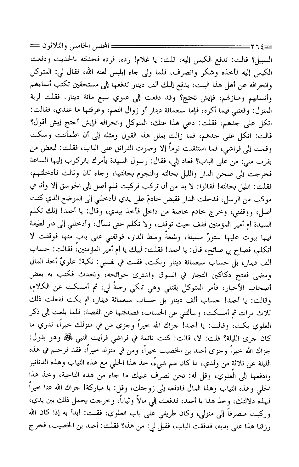 السَّبِيل؟ قَالَتْ: تدفع الْكيس إِلَيْهِ، قُلْتُ: يَا غُلام! رُدَّه، فردّه فحدّثته بِالْحَدِيثِ وَدفعت الْكيس إِلَيْهِ فَأَخذه وشكر وَانْصَرف، فَلَمَّا ولَّى جَاءَ إبليسُ لَعنه اللَّه، فَقَالَ لي: المتوكلُ وانحرافه عَنْ أَهْل هَذَا الْبَيْت، يُدفع إِلَيْك ألفُ دِينَار تدفعها إِلَى مستحقين تكْتب أَسْمَاءَهُم وأنسابهم ومنازلهم، فإيش تحتج؟ وَقَدْ دفعتَ إِلَى عَلَويٍّ سبعَ مائَة دِينَار. فَقلت لربة الْمنزل: وقعتيني فِيمَا أكره، فإمَّا سَبْعمِائة دِينَار أَوْ زَوَال النعم، وعرَّفتُها مَا عِنْدِي، فَقَالَت: اتكل عَلَى جَدِّهم، فَقلت: دَعِي هَذَا عَنْكِ، المتَوَكل وانحرافه فإيش أحتج إيش أَقُول؟ قَالَتْ: اتكل عَلَى جَدّهم، فَمَا زَالَت بِمثل هَذَا القَوْل وَمثله إِلَى أَن اطمأننت وَسكت وَقمت إِلَى فِرَاشِي، فَمَا استثقلتُ نومًا إِلا وَصَوت الْفُرَانِقِ عَلَى الْبَاب، فَقلت: لبَعض من يَقْرُب مني: مَنْ عَلَى الْبَاب؟ فَعَاد إِلَيّ، فَقَالَ: رَسُول السيدة يَأْمُرك بالركوب إِلَيْهَا السَّاعَة فَخرجت إِلَى صحن الدَّار وَاللَّيْل بحالته والنجوم بحالتها، وَجَاء ثَان وثالث فأدخلتهم، فَقلت: اللَّيْل بحالته! فَقَالُوا: لابد من أَن تركب فركبت فَلم أصل إِلَى الْجَوْسَقِ إِلا وَأَنا فِي موكب من الرُّسُل، فَدخلت الدَّار فَقبض خادمٌ عَليّ يَدي فَأَدْخلنِي إِلَى الْموضع الَّذِي كُنْت أصل، ووقفني، وَخرج خَادِم خَاصَّة من دَاخل فَأخذ بيَدي، وقَالَ: يَا أَحْمَد! إِنَّك تُكلِّم السيدة أم أَمِير الْمُؤْمِنِين فقف حَيْثُ توقف، وَلا تَكَلَّم حَتَّى تُسْأَل، وأدخلني إِلَى دَار لَطِيفَة فِيهَا بيُوت عَلَيْهَا ستورٌ مُسْبَلة، وشمعةٌ وسط الدَّار، فوقَفَنِي عَلَى بابٍ مِنْهَا فوقفت لَا أَتكَلّم، فصاح بِي صائح، قَالَ: يَا أَحْمَد! فَقلت: لبيْك يَا أم أَمِير الْمُؤْمِنِين، فَقَالَت: حسابُ ألف دِينَار، بل حِسَاب سَبْعمِائة دِينَار وبكت، فَقلت فِي نَفسِي: نكبة! علويٌ أَخَذَ المَال وَمضى فَفتح دكاكين التُّجَّار فِي السُّوق وَاشْترى حَوَائِجه، وتحدث فَكتب بِهِ بعض أَصْحَاب الْأَخْبَار، فَأمر المتوكِّل بقتلي وَهِي تبْكي رَحْمَة لي، ثُمّ أمسكتْ عَنِ الْكَلَام، وقَالَتْ: يَا أَحْمَد! حِسَاب ألف دِينَار بل حِسَاب سَبْعمِائة دِينَار، ثُمّ بَكت فَفعلت ذَلِكَ ثَلَاث مَرَّات ثُمّ أمسكتْ، وسَأَلَتْني عَنِ الْحساب، فصدَقْتُها عَنِ الْقِصَّة، فَلَمَّا بلغتُ إِلَى ذكر العَلَويّ بكتْ، وَقَالَت: يَا أَحْمَد! جَزَاك اللَّه خيرا وجزى من فِي مَنْزِلك خيرا، تَدْرِي مَا كَانَ جرى اللَّيْلَة؟ قُلْتُ: لَا، قَالَتْ: كُنْت نَائِمَة فِي فِرَاشِي فَرَأَيْت النَّبيّ صَلَّى اللهُ عَلَيْهِ وَسَلَّمَ وَهُوَ يَقُولُ: جَزَاك اللَّه خيرا وجزى أَحْمَد بْن الخصيب خيرا، وَمن فِي منزله خيرا، فقد فَرَّجتم فِي هَذِهِ الليلةَ عَنْ ثلاثةٍ من وَلَدِي، مَا كَانَ لَهُم شيءٌ، خُذْ هَذَا الْحلِيّ مَعَ هَذِهِ الثِّيَاب وَهَذِه الدَّنَانِير وادفعها إِلَى العَلَويّ، وَقل لَهُ: نَحْنُ نصرف عَلَيْك مَا جَاءَ من هَذِهِ النَّاحِيَة، وَخذ هَذَا الحليَّ وَهَذِه الثِّيَاب وَهَذَا المَال فادفعه إِلَى