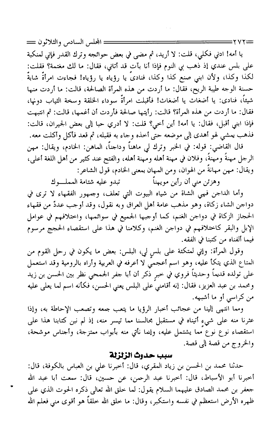 يَا أُمّه! أُدْني فكُلي، قُلْتُ: لَا أُرِيد، ثُمّ مضى فِي بعض حَوَائِجه وَترك الْقدر فَإِنِّي لمنكبَّة عَلَى بُلِيس عِنْدِي إِذْ ذهب بِي النّوم فَإِذا أَنَا بآتٍ قَدْ أَتَانِي، فَقَالَ: مَالك مُغتَمَّة؟ فَقلت: لكذا وَكَذَا، وَلِأَن ابْني صنع كَذَا وَكَذَا، فَنَادَى يَا رُؤْيَاهُ يَا رُؤْيَاهُ! فَجَاءَت امرأةٌ شابةٌ حَسَنَة الْوَجْه طيبَة الرّيح، فَقَالَ: مَا أردتِ من هَذِهِ الْمَرْأَة الصَّالِحَة، قَالَتْ: مَا أردْت مِنْهَا شَيْئا، فَنَادَى: يَا أضْغَاثُ يَا أضْغَاثُ! فَأَقْبَلت امرأةٌ سَوْدَاء الْخلقَة وسخةُ الثِّيَاب دونهَا، فَقَالَ: مَا أردتِ من هَذِهِ الْمَرْأَة؟ قَالَتْ: رَأَيْتهَا صَالِحَة فَأَرَدْت أَن أغُمَّها، قَالَتْ: ثُمّ انْتَبَهت فَإِذا ابْني أقبل، فَقَالَ: يَا أُمّه! أَيْنَ أَخي؟ قُلْتُ: لَا أَدْرِي حَبَا إِلَى بعض الْجِيرَان، قَالَتْ: فَذهب يمشي لَهو أهْدى إِلَى مَوْضِعه حَتَّى أَخذه وَجَاء بِهِ فَقبله، ثُمّ قعد فَأكل وأكلت مَعَه.