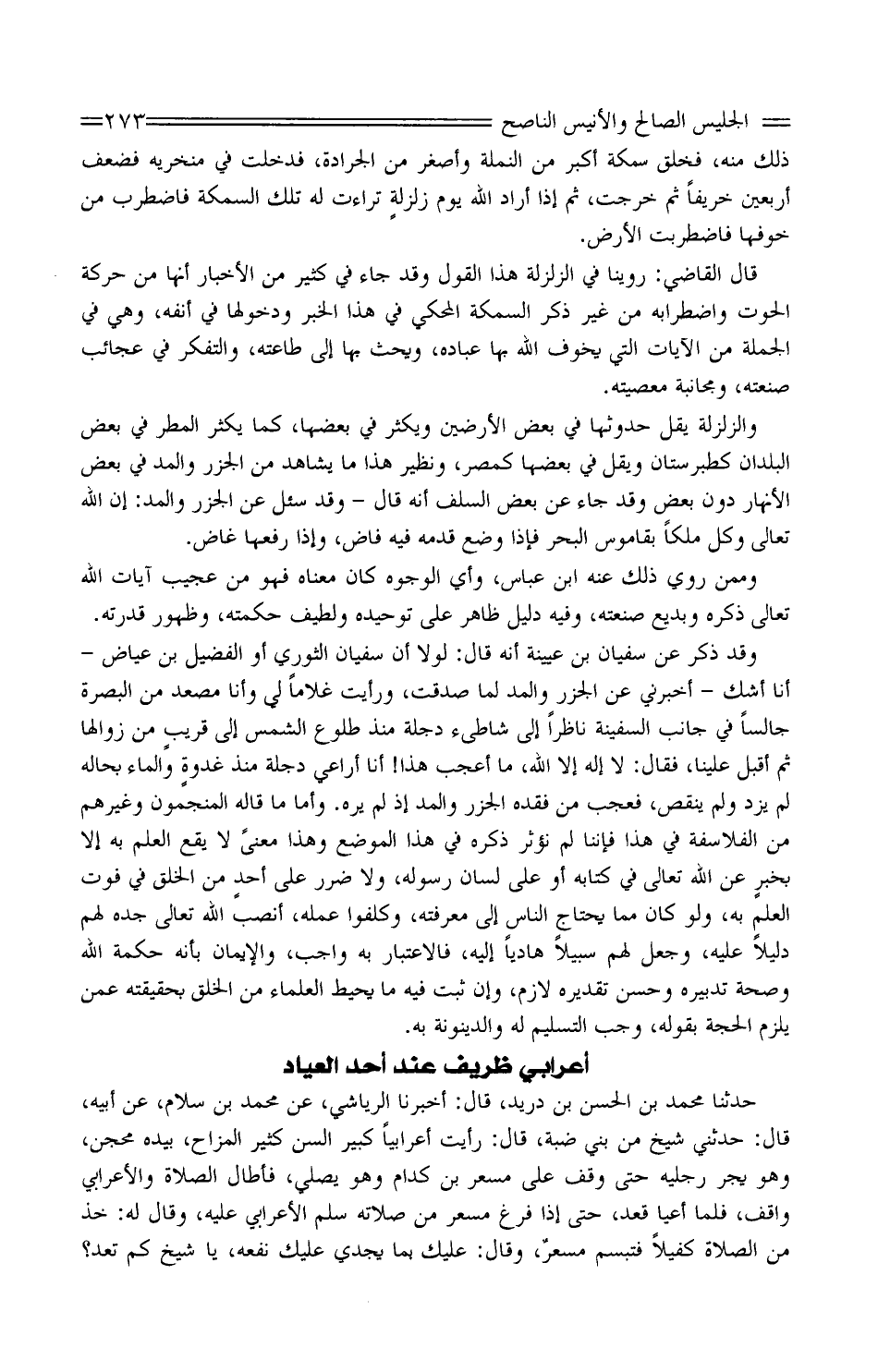 وَقَدْ ذكر عَنْ سُفْيَان بْن عُيَيْنة أَنَّهُ قَالَ: لَوْلَا أَن سُفْيَان الثَّوْرِي أَو الْفُضَيْل بْن عِياض - أَنَا أَشُكُّ - أَخْبَرَنِي عَنِ الجَزْرِ وَالْمدّ لما صدقت، وَرَأَيْت غُلَاما لي وَأَنا مُصْعَد من الْبَصْرَة جَالِسا فِي جَانب السَّفِينَة نَاظرا إِلَى شاطىء دجلة مُنْذُ طُلُوع الشَّمْس إِلَى قريبٍ من زَوَالهَا ثُمّ أقبل علينا، فَقَالَ: لَا إِلَه إِلا اللَّه، مَا أعجب هَذَا! أَنَا أراعي دجلة مُنْذُ غدوةٍ وَالْمَاء بِحَالهِ لَمْ يزدْ وَلَم يَنْقُص، فَعجب من فَقْدِه الجزر والمدَّ إِذْ لم يره ن. وأمّا مَا قَالَه المنجمون وَغَيْرُهُمْ من الفلاسفة فِي هَذَا فإننا لَمْ نؤثر ذكره فِي هَذَا الْموضع وَهَذَا معنى لَا يَقع الْعلم بِهِ إِلا بخبرٍ عَنِ اللَّه تَعَالَى فِي كِتَابه أَوْ عَلَى لِسَان رَسُوله، وَلا ضَرَر عَلَى أحدٍ من الْخلق فِي فَوت الْعلم بِهِ، وَلَو كَانَ مِمَّا يحْتَاج الناسُ إِلَى مَعْرفَته، وكُلِّفُوا عمله، انصب اللَّه تَعَالَى جَدُّه لَهُم دَلِيلا عَلَيْه، وَجَعَل لَهُم سَبِيلا هاديًا إِلَيْهِ، فالاعتبار بِهِ وَاجِب، والإِيمَان بِأَنَّهُ حِكْمَة اللَّه وَصِحَّة تَدْبيره وَحسن تَقْدِيره لَازم، وَإِن ثَبت فِيهِ مَا يُحِيط الْعلمَاء من الْخلق بحقيقته عَمَّن يلْزم احجة بقوله، وَجب التَّسْلِيم لَهُ والدَّيْنُونة بِهِ.