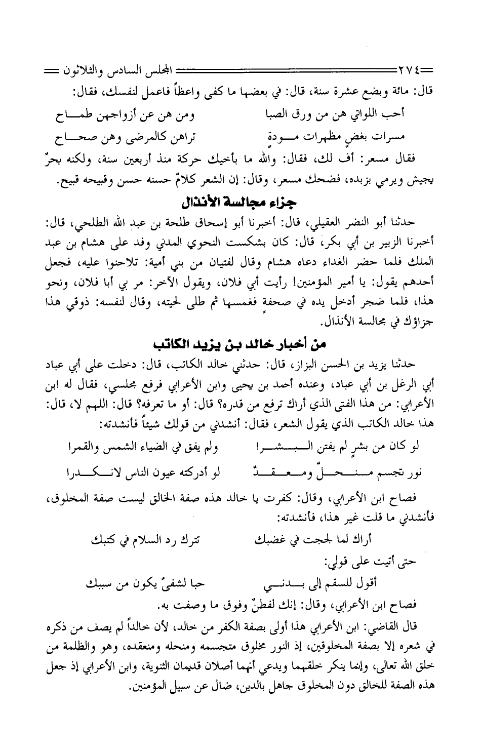 فصاح ابْن الْأَعرَابِي، وقَالَ: كفرت يَا خَالِد هَذِهِ صفة الْخَالِق لَيست صفة الْمَخْلُوق، فأنشدني مَا قُلْتُ غَيْر هَذَا، فَأَنْشَدته: