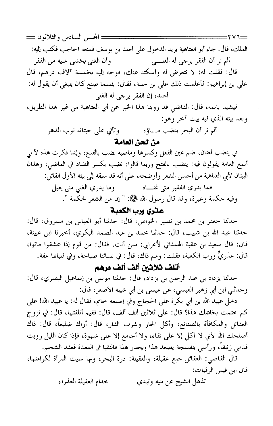 حَدَّثَنَا جَعْفَر بْن مُحَمَّد بن نصير لخواص، قَالَ: حَدَّثَنَا أَبُو الْعَبَّاس ابْن مَسْرُوق، قَالَ: حَدَّثَنَا عَبْد اللَّه بْن شبيب، قَالَ: حَدَّثَنَا مُحَمَّد بْن عَبْد الصَّمد الْبكْرِيّ، أَخْبَرَنَا ابْن عُيَيْنة، قَالَ: قَالَ سَعِيد بْن عُقْبة الهَمْدانِّي لأعرابي: مِمَّنْ أَنْت، فَقَالَ: من قوم إِذا عشقوا مَاتُوا، قَالَ: عذريٌ وربِّ الْكَعْبَة، فَقلت: ومم ذَاك، قَالَ: فِي نسائنا صباحة، وَفِي فتياننا عفَّة.