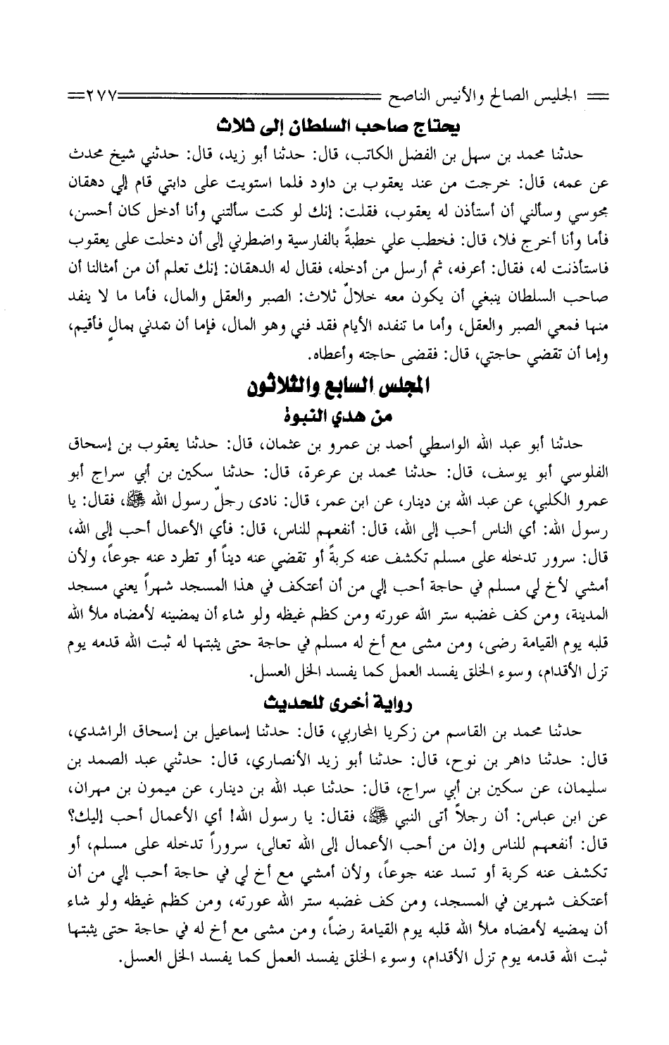حَدَّثَنَا مُحَمَّدُ بن الْقَاسِم من زَكَرِيَّا الْمُحَارِبِيُّ، قَالَ: حَدَّثَنَا إِسْمَاعِيلُ ابْن إِسْحَاقَ الرَّاشِدِيُّ، قَالَ: حَدَّثَنَا دَاهِرُ بْنُ نُوحٍ، قَالَ: حَدَّثَنَا أَبُو زَيْدٍ الأَنْصَارِيُّ، قَالَ: حَدَّثَنِي عَبْدُ الصَّمَدِ بْنُ سُلَيْمَانَ، عَنْ سُكَيْنِ بْنِ أَبِي سِرَاجٍ، قَالَ: حَدَّثَنَا عَبْدِ اللَّهِ بْنِ دِينَارٍ، عَنِ مَيْمُونِ بْنِ مِهْرَانَ، عَنِ ابْنِ عَبَّاسٍ: أَنَّ رَجُلا أَتَى النَّبِيَّ صَلَّى اللَّهُ عَلَيْهِ وَسَلَّمَ، فَقَالَ: يَا رَسُولَ اللَّهِ! أَيُّ الأَعْمَالِ أَحَبُّ إِلَيْكَ؟ قَالَ: أَنْفَعُهُمْ لِلنَّاسِ وَإِنَّ مِنْ أَحَبِّ الأَعْمَالِ إِلَى اللَّهِ تَعَالَى، سُرُورًا تُدْخِلُهُ عَلَى مُسْلِمٍ، أَوْ تَكْشِفُ عَنْهُ كُرْبَةً أَوْ تَسُدُّ عَنْهُ جُوعًا، وَلأَنْ أَمْشِيَ مَعَ أَخٍ لِي فِي حَاجَةٍ أَحَبُّ إِلَيَّ مِنْ أَنْ أَعْتَكِفَ شَهْرَيْنِ فِي الْمَسْجِدِ، وَمَنْ كَفَّ غَضَبَهُ سَتَرَ اللَّهُ عَوْرَتَهُ، وَمَنْ كَظَمَ غَيْظَهُ وَلَوْ شَاءَ أَنْ يُمْضِيَهُ لأَمْضَاهُ مَلأَ اللَّهُ قَلْبَهُ يَوْمَ الْقِيَامَةِ رِضًا، وَمَنْ مَشَى مَعَ أَخٍ لَهُ فِي حَاجَةٍ حَتَّى يُثْبِتَهَا ثَبَّتَ اللَّهُ قَدَمَهُ يَوْمَ تَزِلُّ الأَقْدَامُ، وَسُوءُ الْخُلُقِ يُفْسِدُ الْعَمَلَ كَمَا يُفْسِدُ الْخَلُّ الْعَسَلَ.