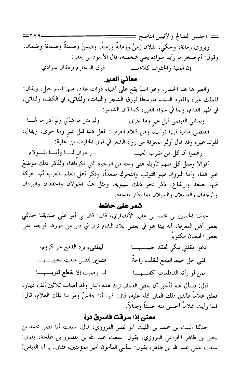 والعَيْر هَا هُنَا الْحمار، وَهُوَ اسمٌ يقعُ عَلَى أَشْيَاء ذَوَات عددٍ. مِنْهَا اسْم جبل، ويُقَالُ: للملَك عَيْرٌ، وللعُودِ الْمُمتدِّ متوسطًا لورق الشَّجر والنبات، وللناتىء فِي الْكَفّ، وللناتىء فِي ظهر الْقدَم، وَلما فِي سَواد الْعين، كَمَا قَالَ الشَّاعِر: