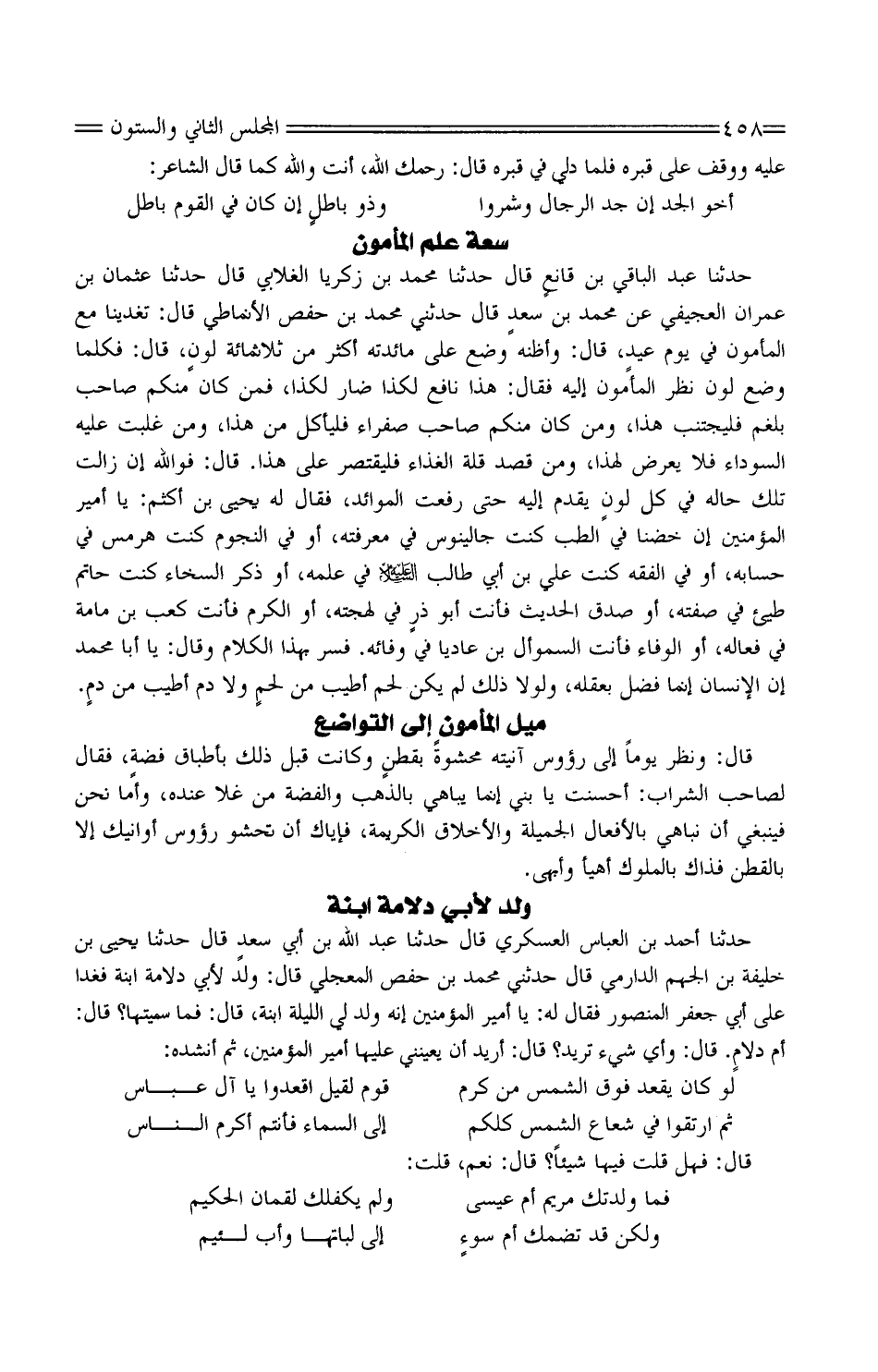 حَدثنَا عبد الْبَاقِي بْن قانعٍ قَالَ حَدَّثَنَا مُحَمَّد بْن زَكَرِيّا الغَلابِي قَالَ حَدَّثَنَا عُثْمَان بْن عمرَان العجيفي عَن مُحَمَّد بْن سعدٍ قَالَ حَدَّثَنِي مُحَمَّد بْن حَفْص الْأنمَاطِي قَالَ: تغدينا مَعَ الْمَأْمُون فِي يَوْم عيدٍ، قَالَ: وَأَظنهُ وضع على مائدته أَكثر من ثَلَاثمِائَة لونٍ، قَالَ: فَكلما وضع لون نظر الْمَأْمُون إِلَيْهِ فَقَالَ: هَذَا نَافِع لكذا ضار لكذا، فَمن كَانَ مِنْكُم صَاحب بلغم فليجتنب هَذَا، وَمن كَانَ مِنْكُم صَاحب بلغم فليجتنب هَذَا، وَمن كَانَ مِنْكُم صَاحب صفراء فَليَأْكُل من هَذَا، وَمن غلبت عَلَيْهِ السَّوْدَاء فَلَا يعرض لهَذَا، وَمن قصد قلَّة الْغذَاء فليقتصر على هَذَا. قَالَ: فو الله إِن زَالَت تِلْكَ حَاله فِي كل لونٍ يقدم إِلَيْهِ حَتَّى رفعت الموائد، فَقَالَ لَهُ يحيى بْن أَكْثَم: يَا أَمِير الْمُؤمنِينَ إِن خضنا فِي الطِّبّ كنت جالينوس فِي مَعْرفَته، أَو فِي النُّجُوم كنت هرمس فِي حسابه، أَو فِي الْفِقْه كنت عَليّ بْن أبي طَالِب عَلَيْهِ السّلام فِي علمه، أَو ذكر السخاء كنت حَاتِم طَيء فِي صفته، أَو صدق الحَدِيث فَأَنت أَبُو ذرٍ فِي لهجته، أَو الْكَرم فَأَنت كَعْب بْن مامة فِي فعاله، أَو الْوَفَاء فَأَنت السموأل ابْن عاديا فِي وفائه. فسر بِهَذَا الْكَلَام وَقَالَ: يَا أَبَا مُحَمَّد إِن الْإِنْسَان إِنَّمَا فضل بعقله، وَلَوْلَا ذَلِك لم يكن لحم أطيب من لحمٍ وَلَا دم أطيب من دمٍ.