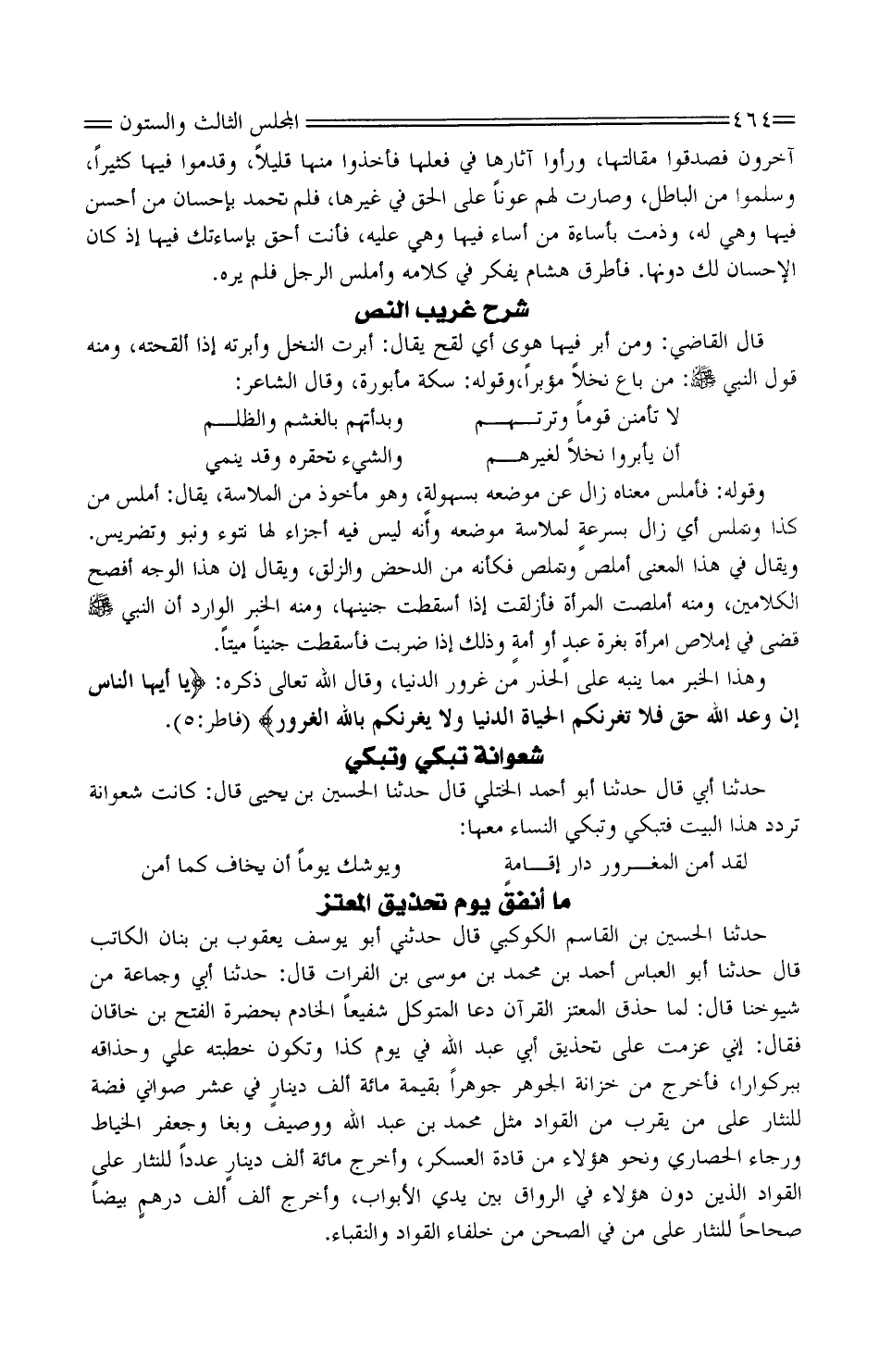 حَدثنَا أَبِي قَالَ حَدَّثَنَا أَبُو أَحْمَد الْخُتلِي قَالَ حَدَّثَنَا الْحُسَيْن بْن يحيى قَالَ: كَانَت شعوانة تردد هَذَا الْبَيْت فتبكي وتبكي النِّسَاء مَعهَا: