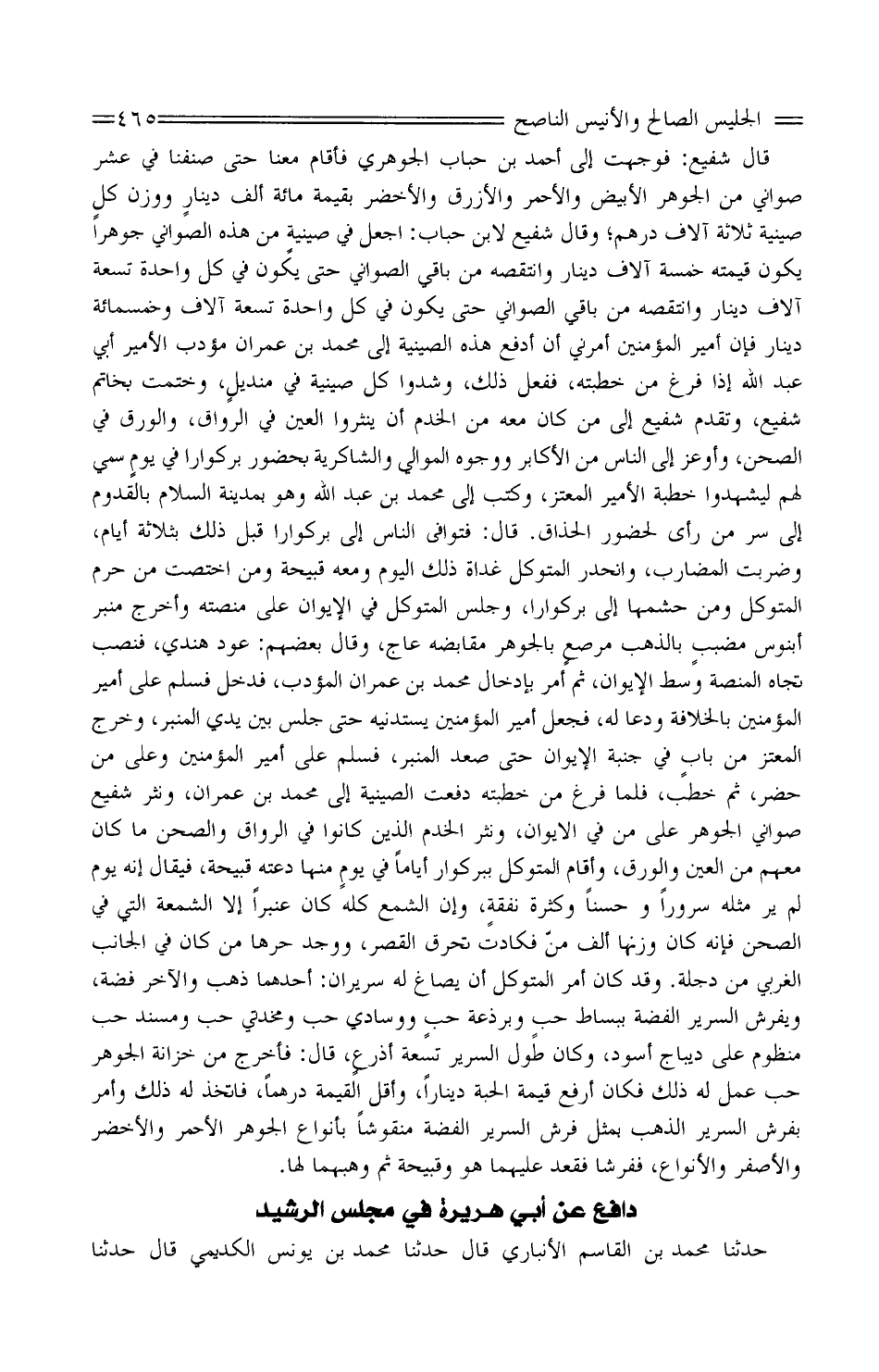 قَالَ شَفِيع: فوجهت إِلَى أَحْمَد بْن حباب الْجَوْهَرِي فَأَقَامَ مَعنا حَتَّى صنفنا فِي عشر صواني من الْجَوْهَر الْأَبْيَض والأحمر والأزرق والأخضر بِقِيمَة مائَة ألف دينارٍ وَوزن كل صينية ثَلَاثَة أُلَّاف دِرْهَم؛ وَقَالَ شَفِيع لِابْنِ حباب: اجْعَل فِي صينيةٍ من هَذِه الصواني جوهرًا يكون قِيمَته خَمْسَة آلَاف دِينَار وانتقصه من بَاقِي الصواني حَتَّى يكون فِي كل وَاحِدَة تِسْعَة آلَاف دِينَار وانتقصه من بَاقِي الصواني حَتَّى يكون فِي كل وَاحِدَة تِسْعَة آلَاف وَخَمْسمِائة دِينَار فَإِن أَمِير الْمُؤمنِينَ أَمرنِي أَن أدفَع هَذِه الصينية إِلَى مُحَمَّد بْن عمرَان مؤدب الْأَمِير أَبِي عَبد اللَّه إِذا فرغ من خطبَته، فَفعل ذَلِك، وشدوا كل صينية فِي منديلٍ، وختمت بِخَاتم شَفِيع، وَتقدم شَفِيع إِلَى من كَانَ مَعَه من الخدم أَن ينثروا الْعين فِي الرواق، وَالْوَرق فِي الصحن، وأوعز إِلَى النَّاس من الأكابر ووجوه الموَالِي والشاكرية بِحُضُور بركوارا فِي يومٍ سمي لَهُم ليشهدوا خطْبَة الْأَمِير المعتز، وَكتب إِلَى مُحَمَّد بْن عَبد اللَّه وَهُوَ بِمَدِينَة السَّلَام بالقدوم إِلَى سر من رأى لحضور الحذاق. قَالَ: فتوافي النَّاس إِلَى بركوارا قبل ذَلِك بِثَلَاثَة أَيَّام، وَضربت الْمضَارب، وَانْحَدَرَ المتَوَكل غَدَاة ذَلِك الْيَوْم وَمَعَهُ قبيحة وَمن اخْتصّت من حرم المتَوَكل وَمن حشمها إِلَى بركوارا، وَجلسَ المتَوَكل فِي الإيوان على منصته وَأخرج مِنْبَر أبنوس مضببٍ بِالذَّهَب مرصعٍ بالجوهر مقابضة عاج، وَقَالَ بَعضهم: عود هندي، فنصب تجاه المنصة وسط الإيوان، ثُمَّ أَمر بِإِدْخَال مُحَمَّد بْن عمرَان الْمُؤَدب، فَدخل فَسلم على أَمِير الْمُؤمنِينَ بالخلافة ودعا لَهُ، فَجعل أَمِير الْمُؤمنِينَ يستدنيه حَتَّى جلس بَين يَدي الْمِنْبَر، وَخرج المعتز من بابٍ فِي جنبة الإيوان حَتَّى صعد الْمِنْبَر، فَسلم على أَمِير الْمُؤمنِينَ وعَلى من حضر، ثُمَّ خطب، فَلَمَّا فرغ من خطبَته دفعت الصينية إِلَى مُحَمَّد بْن عمرَان، ونثر شَفِيع صواني الْجَوْهَر على من فِي الإيوان، ونثر الخدم الَّذين كَانُوا فِي الرواق والصحن مَا كَانَ مَعَهم من الْعين وَالْوَرق، وَأقَام المتَوَكل ببركوار أَيَّامًا فِي يومٍ مِنْهَا دَعَتْهُ قبيحة، فَيُقَال إِنَّه يَوْم لم ير مثله سُرُورًا وحسنا وَكَثْرَة نفقةٍ، وَإِن الشمع كُله كَانَ عنبرًا إِلَّا الشمعة الَّتِي فِي الصحن فَإِنَّهُ كَانَ وَزنهَا ألف من فَكَادَتْ تحرق الْقصر، وَوجد حرهَا من كَانَ فِي الْجَانِب الغربي من دجلة. وَقد كَانَ أَمر المتَوَكل أَن يصاغ لَهُ سريران: أَحدهمَا ذهب وَالْآخر فضَّة، ويفرش السرير الْفضة ببساط حبٍ وبرذعة حبٍ ووسادي حب ومخدتي حبٍ ومسند حبٍ منظوم على ديباج أسود، وَكَانَ طول السرير تِسْعَة أذرعٍ، قَالَ: فَأخْرج من خزانَة الْجَوْهَر حب عمل لَهُ ذَلِك فَكَانَ أرفع قيمَة الْحبَّة دِينَارا، وَأَقل الْقيمَة درهما، فأتخذ لَهُ ذَلِك وَأمر بفرش السرير الذَّهَب بِمثل فرش السرير الْفضة مَنْقُوشًا بأنواع الْجَوْهَر الْأَحْمَر والأخضر والأصفر والأنواع، ففرشا فَقعدَ عَلَيْهِمَا هُوَ وقبيحة ثُمَّ وهبهما لَهَا.