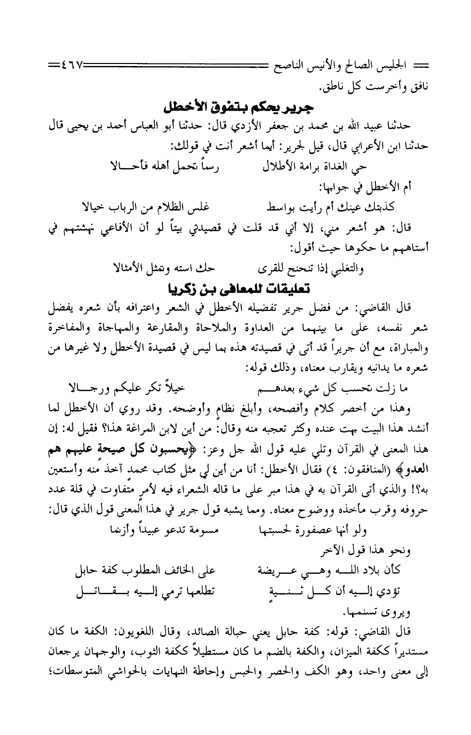 تعليقات للمعافى بْن زَكَرِيَّا قَالَ القَاضِي: من فضل جرير تفضيله الأخطل فِي الشّعْر واعترافه بِأَن شعره يفضل شعر نَفسه، على مَا بَينهمَا من الْعَدَاوَة والملاحاة والمقارعة والمهاجاة والمفاخرة والمباراة، مَعَ أَن جَرِيرًا قد أَتَى فِي قصيدته هَذِه بِمَا لَيْسَ فِي قصيدة الأخطل وَلَا غَيرهَا من شعره مَا يدانيه وَيُقَارب مَعْنَاهُ، وَذَلِكَ قَوْله: