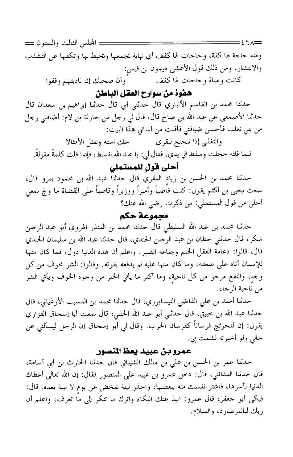 حَدَّثَنَا مُحَمَّد بْن عَبد اللَّه السليطي قَالَ حَدَّثَنَا مُحَمَّد بْن الْمُنْذر الْهَرَوِيّ أَبُو عبد الرَّحْمَن شكر، قَالَ حَدَّثَنِي حطَّان بْن عبد الرَّحْمَن الجندي، قَالَ حَدَّثَنَا عَبد اللَّه بْن سُلَيْمَان الجندي قَالَ، قَالُوا: دعامة الْعقل الْحلم وَجَمَاعَة الصَّبْر. وَأعلم أَن هَذِه الدُّنْيَا دوَل، فَمَا كَانَ مِنْهَا للْإنْسَان أَتَاهُ على ضعفه، وَمَا كَانَ مِنْهَا عَلَيْهِ لم يَدْفَعهُ بقوته. وَقَالُوا: الشَّرّ مخوف من كل وجهٍ، والنفع مرجو من كل ناحيةٍ، وَمَا أَكثر مَا يَأْتِي الْخَيْر من وُجُوه الْخَوْف وَيَأْتِي الشَّرّ من نَاحيَة الرَّجَاء.