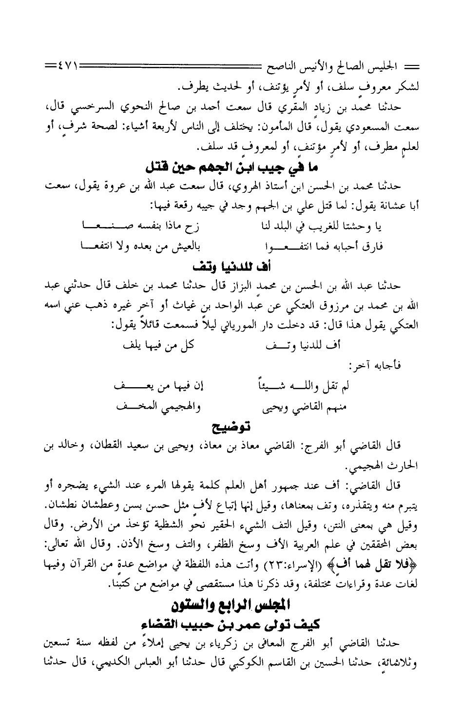 حَدَّثَنَا الْقَاضِي أَبُو الْفَرَجِ الْمُعَافَى بْنُ زَكَرِيَّاءَ بْنِ يَحْيَى إِمْلاءً مِنْ لَفْظِهِ سَنَةَ تِسْعِينَ وثلاثمائةٍ، حَدَّثَنَا الْحُسَيْنُ بْنُ الْقَاسِمِ الْكَوْكَبِيُّ قَالَ حَدَّثَنَا أَبُو الْعَبَّاسِ الْكُدَيْمِيُّ، قَالَ حَدَّثَنَا