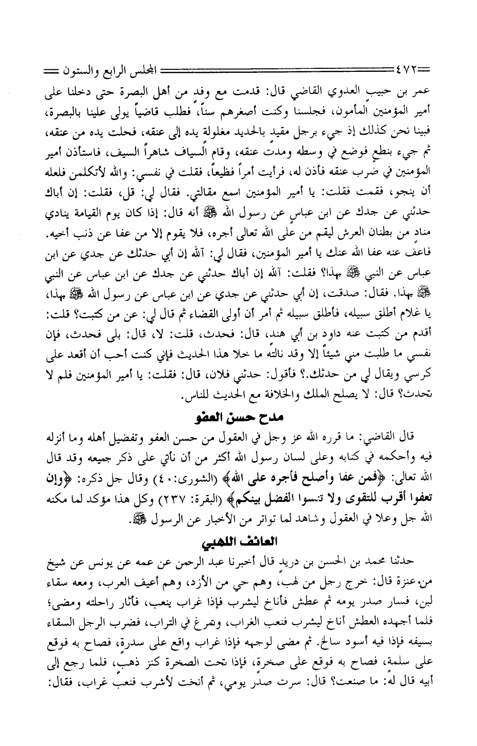عُمَرُ بْنُ حبيبٍ الْعَدَوِيُّ الْقَاضِي قَالَ: قَدِمْتُ مَعَ وفدٍ مِنْ أَهْلِ الْبَصْرَةِ حَتَّى دَخَلْنَا عَلَى أَمِيرِ الْمُؤْمِنِينَ الْمَأْمُونِ، فَجَلَسْنَا وَكُنْتُ أَصْغَرَهُمْ سِنًّا، فَطَلَبَ قَاضِيًا يُوَلَّى عَلَيْنَا بِالْبَصْرَةِ، فَبَيْنَا نَحْنُ كَذَلِكَ إِذْ جِيءَ بِرَجُلٍ مقيدٍ بِالْحَدِيدِ مفولةٍ يَدُهُ إِلَى عُنُقِهِ، فَحُلَّتْ يَدُهُ مِنْ عُنُقِهِ، ثُمَّ جِيءَ بنطعٍ فَوُضِعَ فِي وَسَطِهِ وَمُدَّتْ عُنُقُهُ، وَقَامَ السَّيَّافُ شَاهِرًا السَّيْفَ، فَاسْتَأْذَنَ أَمِيرَ الْمُؤْمِنِينَ فِي ضَرْبِ عُنُقِهِ فَأَذِنَ لَهُ، فَرَأَيْتُ أَمْرًا فَظِيعًا، فَقُلْتُ فِي نَفْسِي: وَاللَّهِ لأَتَكَلَّمَنَّ فَلَعَلَّهُ أَنْ يَنْجُوَ، فَقُمْتُ فَقُلْتُ: يَا أَمِيرَ الْمُؤْمِنِينَ اسْمَعْ مَقَالَتِي. فَقَالَ لِي: قُلْ، فَقُلْتُ: إِنَّ أَبَاكَ حَدَّثَنِي عَنْ جَدِّكَ عَنِ ابْنِ عباسٍ عَنْ رَسُولِ اللَّهِ صَلَّى اللَّهُ عَلَيْهِ وَسَلَّمَ أَنَّهُ قَالَ: إِذَا كَانَ يَوْمُ الْقِيَامَةِ يُنَادِي منادٍ مِنْ بُطْنَانِ الْعَرْشِ لِيَقُمْ مَنْ عَلَى اللَّهِ تَعَالَى أَجْرُهُ، فَلا يَقُومُ إِلا مَنْ عَفَا عَنْ ذَنْبِ أَخِيهِ. فَاعْفُ عَنْهُ عَفَا اللَّهُ عَنْكَ يَا أَمِيرَ الْمُؤْمِنِينَ، فَقَالَ: لِي: أَللَّهِ إِنَّ أَبِي حَدَّثَكَ عَنْ جَدِّي عَنِ ابْنِ عَبَّاسٍ عَنِ النَّبِيِّ صَلَّى اللَّهُ عَلَيْهِ وَسَلَّمَ بِهَذَا؟ فَقُلْتُ: أَللَّهِ إِنَّ أَبَاكَ حَدَّثَنِي عَنْ جَدِّكَ عَنِ ابْنِ عَبَّاسٍ عَنِ النَّبيّ صَلَّى اللَّهُ عَلَيْهِ وَسَلَّمَ بِهَذَا. فَقَالَ: صَدَقْتَ، إِنَّ أَبِي حَدَّثَنِي عَنْ جَدِّي عَنِ ابْنِ عباسٍ عَنِ النَّبِيِّ صَلَّى اللَّهُ عَلَيْهِ وَسَلَّمَ بِهَذَا. فَقَالَ: صَدَقْتَ، إِنَّ أَبِي حَدَّثَنِي عَنْ جَدِّي عَنِ ابْنِ عَبَّاسٍ عَنْ رَسُولَ اللَّهِ صَلَّى اللَّهُ عَلَيْهِ وَسَلَّمَ بِهَذَا، يَا غُلامُ أَطْلِقْ سَبِيلَهُ، فَأَطْلَقَ سَبِيلَهُ ثُمَّ أَمَرَ أَنْ أُولَّى الْقَضَاءَ ثُمَّ قَالَ لِي: عَنْ مَنْ كَتَبْتَ؟ قُلْتُ: أَقْدَمُ مَنْ كَتَبْتُ عَنْهُ دَاوُدُ بْنُ أَبِي هندٍ، قَالَ: فَحَدِّثْ، قُلْتُ: لَا، قَالَ: بَلَى فَحَدِّثْ، فَإِنَّ نَفْسِي مَا طَلَبَتْ مِنِّي شَيْئًا إِلا وَقَدْ نَالَتْهُ مَا خَلا هَذَا الْحَدِيثَ فَإِنِّي كُنْتُ أُحِبُّ أَنْ أَقْعُدَ عَلَى كُرْسِيٍّ وَيُقَالَ لِي مَنْ حَدَّثَكَ.؟ فَأَقُولَ: حَدَّثَنِي فُلانٌ، قَالَ: فَقُلْتُ: يَا أَمِيرَ الْمُؤْمِنِينَ فَلِمَ لَا تُحَدِّثُ؟ قَالَ: لَا يَصْلُحُ الْمُلْكُ وَالْخِلافَةُ مَعَ الْحَدِيثِ لِلنَّاسِ.