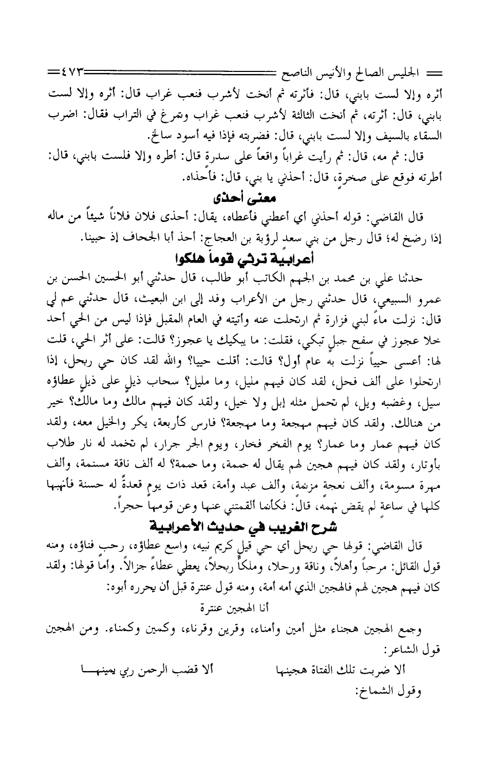 حَدثنَا عَليّ بْن مُحَمَّد بْن الجهم الْكَاتِب أَبُو طَالب، قَالَ حَدَّثَنِي أَبُو الْحُسَيْن الْحسن بْن عَمْرو السبيعِي، قَالَ حَدَّثَنِي رجل من الْأَعْرَاب وَفد إِلَى ابْن البعيث، قَالَ حَدَّثَنِي عَم لي قَالَ: نزلت مَاء لبني فَزَارَة ثُمَّ ارتحلت عَنْهُ وأتيته فِي الْعَام الْمقبل فَإِذا لَيْسَ من الْحَيّ أحد خلا عَجُوز فِي سفح جبلٍ تبْكي، فَقلت: مَا يبكيك يَا عَجُوز؟ قَالَت: على أثر الْحَيّ، قلت لَهَا: أعسى حييًا نزلت بِهِ عَام أول؟ قَالَت: أقلت حييًا؟ وَالله لقد كَانَ حَيّ ربحل، إِذا ارتحلوا على ألف فَحل، لقد كَانَ فيهم مليل، وَمَا مليل؟ سَحَاب ذيلٍ على ذيلٍ عطاؤه سيل، وغضبه ويل، لم تحمل مثله إبل وَلَا خيل، وَلَقَد كَانَ فيهم مَالك وَمَا مَالك؟ خير من هُنَالك. وَلَقَد كَانَ فيهم مهجعة وَمَا مهجعة؟ فَارس كأربعة، يكر وَالْخَيْل مَعَه، وَلَقَد كَانَ فيهم عمار وَمَا عمار؟ يَوْم الْفَخر فخار، وَيَوْم الْجَرّ جرار، لم تخمد لَهُ نَار طلاب بأوتار، وَلَقَد كَانَ فيهم هجين لَهُم يُقَال لَهُ حممة، وَمَا حممة؟ لَهُ ألف نَاقَة مسنمة، وَألف مهرَة مسومة، وَألف نعجةٍ مزنمةٍ، وَألف عبد وَأمة، قعد ذَات يومٍ قعدة لَهُ حَسَنَة فأنهبها كلهَا فِي ساعةٍ لم يقْض نهمه، قَالَ: فَكَأَنَّمَا ألقمتني عَنْهَا وَعَن قَومهَا حجرا.
