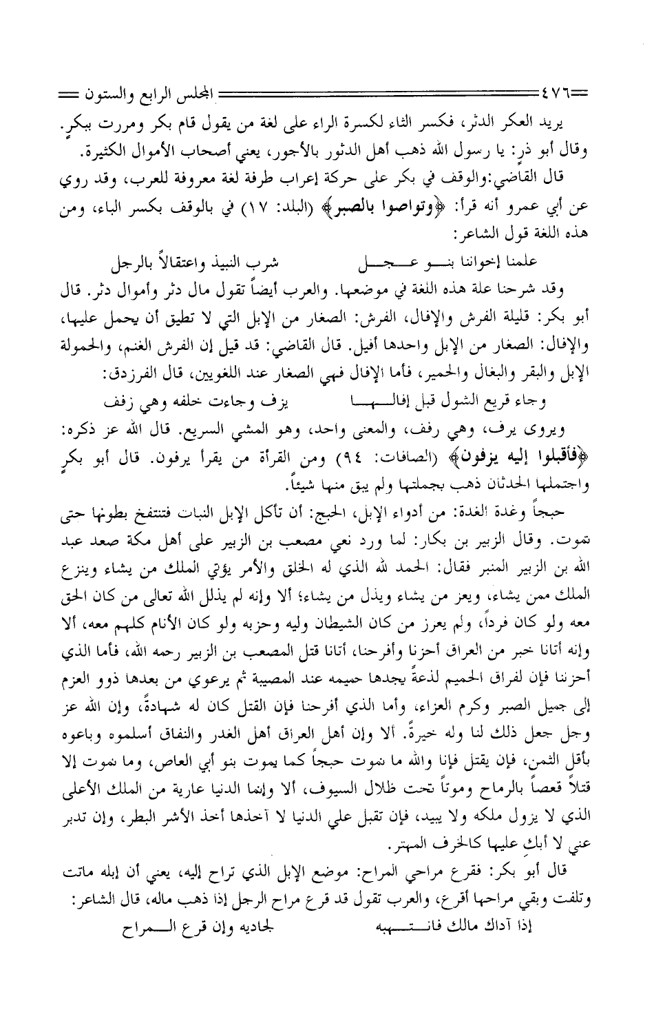 قَالَ القَاضِي: وَالْوَقْف فِي بكر على حَرَكَة إِعْرَاب طرفه لُغَة مَعْرُوفَة للْعَرَب، وَقد روى عَنْ أبي عَمْرو أَنَّهُ قَرَأَ: " وَتَوَاصَوْا بِالصَّبْرِ " الْبَلَد: 17 فِي بِالْوَقْفِ بِكَسْر الْبَاء، وَمن هَذِه اللُّغَة قَول الشَّاعِر: