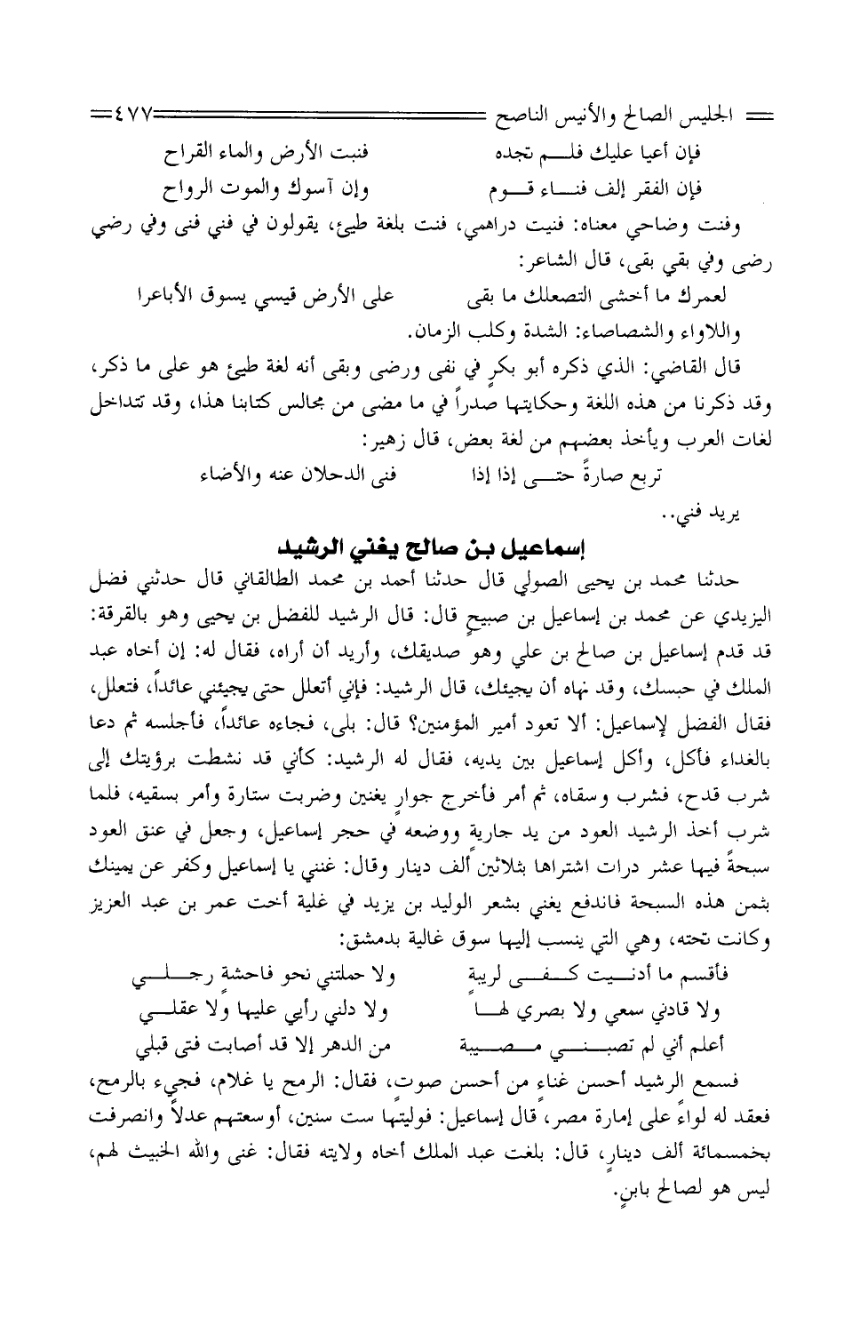 إِسْمَاعِيل بْن صَالح يُغني الرشيد حَدثنَا مُحَمَّد بْن يحيى الصولي قَالَ حَدَّثَنَا أَحْمَد بْن مُحَمَّد الطَّالقَانِي قَالَ حَدَّثَنِي فضل اليزيدي عَن مُحَمَّد بْن إِسْمَاعِيل بْن صبيحٍ قَالَ: قَالَ الرشيد للفضل بن يحيى وَهُوَ بالقرقة: قد قدم إِسْمَاعِيل بْن صَالح بْن عَليّ وَهُوَ صديقك، وَأُرِيد أَن أرَاهُ، فَقَالَ لَهُ: إِن أَخَاهُ عبد الْملك فِي حَبسك، وَقد نَهَاهُ أَن يجيئك، قَالَ الرشيد: فَإِنِّي أتعلل حَتَّى يجيئني عَائِدًا، فتعلل، فَقَالَ الْفضل لإسماعيل: أَلا تعود أَمِير الْمُؤمنِينَ؟ قَالَ: بلَى، فَجَاءَهُ عَائِدًا، فأجلسه ثُمَّ دَعَا بالغداء فَأكل، وَأكل إِسْمَاعِيل بَين يَدَيْهِ، فَقَالَ لَهُ الرشيد: كَأَنِّي قد نشطت برؤيتك إِلَى شرب قدح، فَشرب وسقاه، ثُمَّ أَمر فَأخْرج جوارٍ يغنين وَضربت ستارة وَأمر بسقيه، فَلَمَّا شرب أَخذ الرشيد الْعود من يَد جاريةٍ وَوَضعه فِي حجر إِسْمَاعِيل، وَجعل فِي عنق الْعود سبْحَة فِيهَا عشر درات اشْتَرَاهَا بِثَلَاثِينَ ألف دِينَار وَقَالَ: غنني يَا إِسْمَاعِيل وَكفر عَن يَمِينك بِثمن هَذِه السبحة فَانْدفع يُغني بِشعر الْوَلِيد بن يزِيد فِي غلية أُخْت عمر بْن عبد الْعَزِيز وَكَانَت تَحْتَهُ، وَهِي الَّتِي ينْسب إِلَيْهَا سوق غَالِيَة بِدِمَشْق: