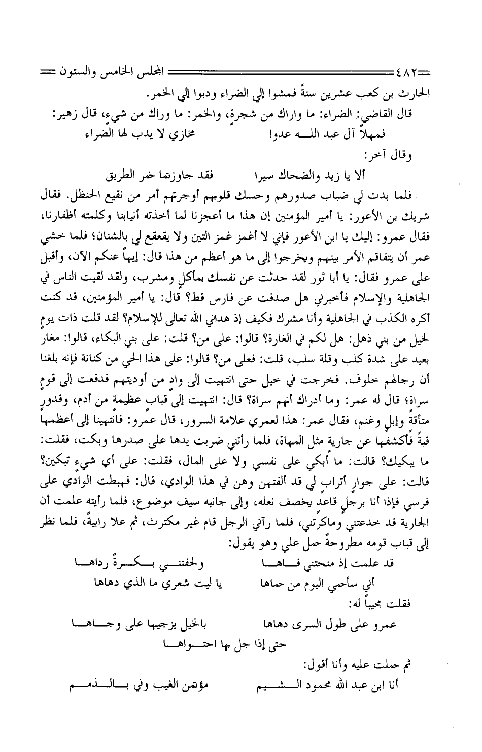 فَلَمَّا بَدَتْ لِي ضِبَابُ صُدُورِهِمْ وحسك قُلُوبهم أَو جرتهم أَمَرَّ مِنْ نَقِيعِ الْحَنْظَلِ. فَقَالَ شَرِيكُ بْنُ الأَعْوَرِ: يَا أَمِيرَ الْمُؤْمِنِينَ إِنَّ هَذَا مَا أَعَجْزَنَا لِمَا أَخَذَتْهُ أَنْيَابُنَا وَكَلَمَتْهُ أَظْفَارُنَا، فَقَالَ عَمْرو: إِلَيْك يَا ابْن الأَعْوَرِ فَإِنِّي لَا أُغْمَزُ غَمْزَ التِّينِ وَلا يُقَعْقَعُ لِي بِالشِّنَانِ؛ فَلَمَّا خَشِيَ عُمَرُ أَنْ يَتَفَاقَمَ الأَمْرُ بَيْنَهُمْ وَيَخْرُجُوا إِلَى مَا هُوَ أَعْظَمُ مِنْ هَذَا قَالَ: إِيهًا عَنْكُمُ الآنَ، وَأَقْبَلَ عَلَى عمروٍ فَقَالَ: يَا أَبَا ثَوْرٍ لَقَدْ حَدَّثْتَ عَنْ نَفْسِكَ بمأكلٍ ومشرب، وَلَقَد لَقِيتَ النَّاسَ فِي الْجَاهِلِيَّةِ وَالإِسْلامِ فَأَخْبِرْنِي هَلْ صَدَفْتَ عَنْ فَارِسٍ قَطُّ؟ قَالَ: يَا أَمِيرَ الْمُؤْمِنِينَ، قَدْ كُنْتُ أَكْرَهُ الْكَذِبَ فِي الْجَاهِلِيَّةِ وَأَنَا مُشْرِكٌ فَكَيْفَ إِذْ هَدَانِيَ اللَّهُ تَعَالَى لِلإِسْلامِ؟ لَقَدْ قُلْتُ ذَاتَ يومٍ لِخَيْلٍ مِنْ بَنِي ذُهْلٍ: هَلْ لَكُمْ فِي الْغَارَةِ؟ قَالُوا: عَلَى مَنْ؟ قُلْتُ: عَلَى بَنِي الْبَكَّاءِ، قَالُوا: مَغَارٌ بَعِيدٌ عَلَى شِدَّةِ كَلْبٍ وَقِلَّةِ سَلْبٍ، قُلْتُ: فَعَلَى مَنْ؟ قَالُوا: عَلَى هَذَا الْحَيِّ مِنْ كِنَانَةَ فَإِنَّهُ بَلَغَنَا أَنَّ رِجَالَهُمْ خُلُوفٌ. فَخَرَجْتُ فِي خَيْلٍ حَتَّى انْتَهَيْتُ إِلَى وادٍ مِنْ أَوْدِيَتِهِمْ فَدَفَعْتُ إِلَى قومٍ سراةٍ؛ قَالَ لَهُ عُمَرُ: وَمَا أَدْرَاكَ أَنَّهُمْ سَرَاةٌ؟ قَالَ: انْتَهَيْتُ إِلَى قبابٍ عظيمةٍ من أَدَم، وقدورٍ متأقةٍ وإبلٍ وَغَنَمٍ، فَقَالَ عُمَرُ: هَذَا لعمري عَلامَة السرُور، قَالَ عَمْرٌو: فَانْتَهَيْنَا إِلَى أَعْظَمِهَا قُبَّةً فَأَكْشِفُهَا عَنْ جاريةٍ مِثْلِ الْمَهَاةِ، فَلَمَّا رَأَتْنِي ضَرَبَتْ يَدَهَا عَلَى صَدْرِهَا وَبَكَتْ، فَقُلْتُ: مَا يُبْكِيكِ؟ قَالَتْ: مَا أَبْكِي عَلَى نَفْسِي وَلا عَلَى الْمَالِ، فَقُلْتُ: عَلَى أَيِّ شيءٍ تَبْكِينَ؟ قَالَتْ: عَلَى جوارٍ أترابٍ لِي قَدْ أَلِفْتُهُنَّ وَهُنَّ فِي هَذَا الْوَادِي، قَالَ: فَهَبَطْتُ الْوَادِي عَلَى فَرَسِي فَإِذَا أَنَا برجلٍ قاعدٍ يَخْصِفُ نَعْلَهُ، وَإِلَى جَانِبِهِ سَيْفٌ مَوْضُوعٌ، فَلَمَّا رَأَيْتُهُ عَلِمْتُ أَنَّ الْجَارِيَةَ قد خدعتني وَمَا كرتني، فَلَمَّا رَآنِي الرَّجُلُ قَامَ غَيْرَ مُكْتَرِثٍ، ثُمَّ عَلا رَابِيَةً، فَلَمَّا نَظَرَ إِلَى قِبَابِ قَوْمِهِ مَطْرُوحَةٍ حَمَلَ عَلَيَّ وَهُوَ يَقُولُ: