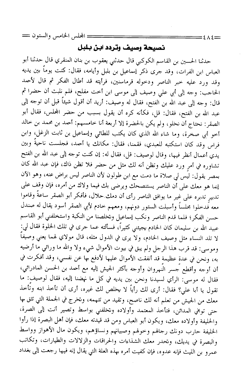 حَدَّثَنَا الْحُسَيْنُ بْنُ الْقَاسِمِ الْكَوْكَبِيُّ قَالَ حَدَّثَنِي يَعْقُوب بْن بنان الْمنْقري قَالَ حَدَّثَنَا أَبُو الْعَبَّاس ابْن الْفُرَات، وَقد جرى ذكر إِسْمَاعِيل بْن بلبل وأيامه، فَقَالَ: كنت يَوْمًا بَين يَدَيْهِ وَقد ورد عَلَيْهِ خبر النَّاصِر ودخوله قرماسنين، فرأيته قد أَطَالَ الْفِكر ثُمَّ قَالَ لِأَحْمَد الْحَاجِب: وَجه إِلَى أبي عَليّ وصيف إِلَى مُوسَى ابْن أُخْت مُفْلِح، فَلم نَلْبَث أَن حضرا ثُمَّ قَالَ: وَجه إِلَى عَبد اللَّه بْن الْفَتْح، فَقَالَ لَهُ وصيف: أُرِيد أَن أَقُول شَيْئا قبل أَن توجه إِلَى عَبد اللَّه بْن الْفَتْح، فَقَالَ لَهُ وصيف: أُرِيد أَن أَقُول شَيْئا قبل أَن توجه إِلَى عَبد اللَّه بْن الْفَتْح، فَقَالَ: قل، فَكَأَنَّهُ كره أَن يَقُول بِسَبَب من حضر الْمجْلس، فَقَالَ أَبُو الصَّقْر: نحتاج أَن نخلو، وَلم يكن بالحضرة إِلَّا أَرْبَعَة أَنا خاسمهم: أَحْمَد بْن مُحَمَّد بْن خَالِد أَخُو أَبِي صَخْرَة، وَمَا شَاءَ الله الَّذِي كَانَ يكْتب للطائي وَإِسْمَاعِيل بْن ثَابت الزغل، وَابْن فراس وَقد كَانَ اسْتَكْتَبَهُ للعبدي، فقمنا، فَقَالَ: مَكَانك يَا أَحْمَد، فَجَلَست نَاحيَة وَبَين يَدي أَعمال أنظر فِيهَا، وَقَالَ لوصيف: قل، فَقَالَ لَهُ: إِن كنت توجه إِلَى عَبد اللَّه بْن الْفَتْح تشاوره فِي أمرٍ ورد عَلَيْك وتظن أَنه لَك مثل من حضر فَلَا تظن ذَاك، فَإِن عَبد اللَّه كَانَ بِمصْر يَقُول: لَيْسَ لي صَلَاة مَا دمت مَعَ ابْن طولون لِأَن النَّاصِر لَيْسَ براض عَنْهُ، وَهُوَ الْآن إِنَّمَا هُوَ مَعَك على أَن النَّاصِر يستنصحك ويرضى بك فِيمَا ولاك من أمره، فَإِن وقف على تدبيرٍ تدتبره على غير مَا يُوَافق النَّاصِر رأى أَن دمك حَلَال، فأفكر أَبُو الصَّقْر سَاعَة وَقَامُوا مَعَه فَدَخَلُوا مَجْلِسا وأسبلت الستور دونهم، وَمَعَهُمْ خَادِم لأبي الصَّقْر أسود يُقَال لَهُ صندل حسن الْفِكر؛ فَلَمَّا قدم النَّاصِر ونكب إِسْمَاعِيل وتخلصنا من النكبة واستخلفني أَبُو الْقَاسِم عُبَيْد اللَّهِ بْن سُلَيْمَان كَانَ الْخَادِم يجيئني كثيرا، فَسَأَلته عماجرى فِي تِلْكَ الْخلْوَة فَقَالَ لي: لَا تَلد النِّسَاء مثل وصيف الْخَادِم، وَلَا يرى فِي الدول مثله، قَالَ مولَايَ لَهما يعين يوصيفاً ومُوسَى: قد قرب هَذَا الرجل وَلم يبْق فِي بيُوت الْأَمْوَال شَيْء وَلَا وَالله مَا ورائي مَا أرضيه بِهِ، وَنحن فِي عدةٍ عظيمةٍ قد أنفقت الْأَمْوَال عَلَيْهَا لأدفع بهَا عَن نَفسِي، وَقد أفكرت فِي أَن أوجه وأقطع جسر النهروان وأوجه بِأَكْثَرَ الْجَيْش إِلَيْهِ مَعَ أَحْمَد بْن الْحسن المادرائي، فَقَالَ لَهُ مُوسَى: الرَّأْي لسيدنا وَنحن بَين يَدَيْهِ فِي كل مَا نهضنا إِلَيْهِ، فَقَالَ لوصيفٍ: مَا تَقول يَا أَبَا عَليّ؟ فَقَالَ: أرى لَك رَأيا لَا يخلص لَك غَيره، أرى أَن تَأْخُذ ابْنه وَتَأْخُذ مَعَك من الْجَيْش من تعلم أَنه لَك نَاصح، وتقيد من تتهمه، وَتخرج فِي الْجُمْلَة الَّتِي تثق بهَا حَتَّى توافي الْمَدَائِن، فتأخذ الْمُعْتَمد وَأَوْلَاده وتخلفني بواسط وَتصير أَنْت إِلَى الصرة، والخليفة وَأَوْلَاده مَعَك، وَيكون أَبُو الْعَبَّاس وَمن قد قيدته مَعَك، فَإِن أهل الْبَصْرَة إِذا رَأَوْا الْخَلِيفَة حَارب دُونك رِجَالهمْ وخولهم وصبيانهم وَنِسَاؤُهُمْ، وَيكون مَا ل الأهواز وواسط وَالْبَصْرَة فِي يَديك، وتحدر مَعَك الشذاءات والحراقات والزلالات والطيارات، وتكاتب عَمْرو بْن اللَّيْث فَإِنَّهُ عدوه، فَإِن كفيت أمره بِهَذِهِ الْعلَّة الَّتِي يُقَال إِنَّه فِيهَا رجعت إِلَى بَغْدَاد