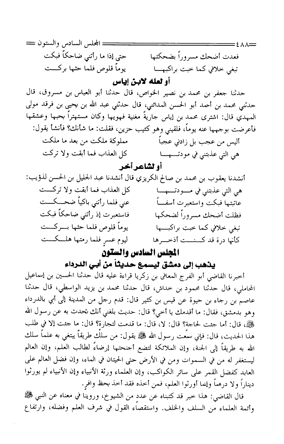 أَخْبَرَنَا الْقَاضِي أَبُو الْفَرَجِ الْمُعَافَى بْنُ زَكَرِيَّا قِرَاءَةً عَلَيْهِ قَالَ حَدَّثَنَا الْحُسَيْنُ بْن إِسْمَاعِيل الْمحَامِلِي، قَالَ حَدَّثَنَا مَحْمُودُ بْنُ خِدَاشٍ، قَالَ حَدَّثَنَا مُحَمَّدُ بْنُ يَزِيدَ الْوَاسِطِيُّ، قَالَ حَدَّثَنَا عَاصِمُ بْنُ رَجَاءِ بْنِ حَيْوَةَ عَنْ قَيْسِ بْنِ كَثِيرٍ قَالَ: قَدِمَ رَجُلٌ مِنَ الْمَدِينَةِ إِلَى أبي بالدرداء وَهُوَ بِدِمَشْقَ، فَقَالَ: مَا أَقْدَمَكَ يَا أَخِي؟ قَالَ: حَدِيثٌ بَلَغَنِي أَنَّكَ تُحَدِّثُ بِهِ عَنْ رَسُولِ اللَّهِ صَلَّى اللَّهُ عَلَيْهِ وَسَلَّمَ، قَالَ: أَمَا جِئْتَ لحاجةٍ؟ قَالَ: لَا، قَالَ: مَا قَدِمْتَ لتجارةٍ؟ قَالَ: مَا جِئْتُ إِلا فِي طَلَبِ هَذَا الْحَدِيثِ، قَالَ: فَإِنِّي سَمِعت رَسُول صَلَّى اللَّهُ عَلَيْهِ وَسَلَّمَ يَقُولُ: مَنْ سَلَكَ طَرِيقًا يَبْتَغِي بِهِ عِلْمًا سَلَكَ اللَّهُ بِهِ طَرِيقًا إِلَى الْجَنَّةِ، وَإِنَّ الْمَلائِكَةَ لَتَضَعُ أَجْنِحَتَهَا إِرْضَاءً لِطَالِبِ الْعِلْمِ، وَإِنَّ الْعَالِمَ لَيَسْتَغْفِرُ لَهُ مَنْ فِي السَّمَوَاتِ وَمَنْ فِي الأَرْضِ حَتَّى الْحِيتَانُ فِي الْمَاءِ، وَإِنَّ فَضْلَ الْعَالِمِ عَلَى الْعَابِدِ كَفَضْلِ الْقَمَرِ عَلَى سَائِرِ الْكَوَاكِبِ، وَإِنَّ الْعُلَمَاءَ وَرَثَةُ الأَنْبِيَاءِ وَإِنَّ الأَنْبِيَاءَ لَمْ يُوَرِّثُوا دِينَارًا وَلا دِرْهَمًا وَإِنَّمَا أروثوا الْعِلْمَ، فَمَنْ أَخَذَهُ فَقَدْ أَخَذَ بِحَظٍّ وافرٍ.