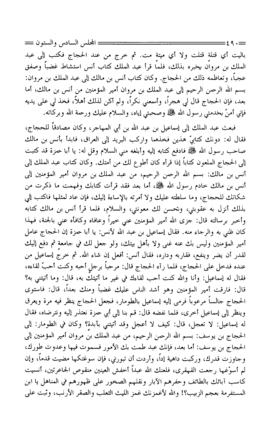 فَبَعَثَ عَبْدُ الْمَلِكِ إِلَى إِسْمَاعِيلَ بْنِ عَبْدِ اللَّهِ بْنِ أَبِي الْمُهَاجِرِ، وَكَانَ مُصَادِقًا لِلْحَجَّاجِ، فَقَالَ لَهُ: دُونَكَ كِتَابِي هَذَيْنِ فَخُذْهُمَا وَارْكَبِ الْبَرِيدَ إِلَى الْعِرَاقِ، فَابْدَأْ بِأَنَسِ بْنِ مَالِكٍ صَاحِبِ رَسُولِ اللَّهِ صَلَّى اللَّهُ عَلَيْهِ وَسَلَّمَ فَادْفَعْ كِتَابَهُ إِلَيْهِ وَأَبْلِغْهُ مِنِّي السَّلامَ وَقُلْ لَهُ: يَا أَبَا حَمْزَةَ قَدْ كَتَبْتُ إِلَى الْحَجَّاجِ الْمَلْعُونِ كِتَابًا إِذَا قَرَأَهُ كَانَ أَطْوَعَ لَكَ مِنْ أَمَتِكَ. وَكَانَ كِتَابُ عَبْدِ الْمَلِكِ إِلَى أَنَسِ بْنِ مَالِكٍ: بِسْمِ اللَّهِ الرَّحْمَنِ الرَّحِيمِ، مِنْ عَبْدِ الْمَلِكِ بْنِ مَرْوَانَ أَمِيرِ الْمُؤْمِنِينَ إِلَى أَنَسِ بْنِ مَالِكٍ خَادِمِ رَسُولِ اللَّهِ صَلَّى اللَّهُ عَلَيْهِ وَسَلَّمَ، أَمَّا بَعْدُ فَقَدْ قَرَأْتُ كِتَابَكَ وَفَهِمْتُ مَا ذَكَرْتَ مِنْ شَكَاتِكَ لِلْحَجَّاجِ، وَمَا سَلَّطْتُهُ عَلَيْكَ وَلا أَمَرْتُهُ بِالإِسَاءَةِ إِلَيْكَ، فَإِنْ عَادَ لِمِثْلِهَا فَاكْتُبْ إِلَيَّ بِذَلِكَ أُنْزِلْ بِهِ عُقُوبَتِي، وَتَحْسُنْ لَكَ مَعُونَتِي، وَالسَّلامُ، فَلَمَّا قَرَأَ أَنَسُ بْنُ مَالِكٍ كِتَابَهُ وَأُخْبِرَ بِرِسَالَتِهِ قَالَ: جَزَى اللَّهُ أَمِيرَ الْمُؤْمِنِينَ عَنِّي خَيْرًا وَعَافَاهُ وَكَافَأَهُ عَنِّي بِالْجَنَّةِ، فَهَذَا كَانَ ظَنِّي بِهِ وَالرَّجَاءَ مِنْهُ. فَقَالَ إِسْمَاعِيلُ بْنُ عَبْدِ اللَّهِ لأَنَسٍ: يَا أَبَا حَمْزَةَ إِنَّ الْحَجَّاجَ عَامِلُ أَمِيرِ الْمُؤْمِنِينَ وَلَيْسَ بِكَ عَنْهُ غِنًى وَلا بِأَهْلِ بَيْتِكَ، وَلَوْ جُعِلَ لَكَ فِي جامعةٍ ثُمَّ دُفِعَ إِلَيْكَ لِقَدَرٍ أَنْ يَضُرَّ وَيَنْفَعَ، فَقَارِبْهُ وَدَارَهُ، فَقَالَ أَنَسٌ: أَفْعَلُ إِنْ شَاءَ اللَّهُ. ثُمَّ خَرَجَ إِسْمَاعِيلُ مِنْ عِنْدِهِ فَدَخَلَ عَلَى الْحَجَّاجِ، فَلَمَّا رَآهُ الْحَجَّاجُ قَالَ: مَرْحَبًا برجلٍ أُحِبُّهُ وَكُنْتُ أحبلقاءه، فَقَالَ لَهُ إِسْمَاعِيلُ: وَأَنَا وَاللَّهِ كُنْتُ أُحِبُّ لِقَاءَكَ فِي غَيْرِ مَا أَتَيْتُكَ بِهِ، قَالَ: وَمَا أَتَيْتَنِي بِهِ؟ قَالَ: فَارَقْتُ أَمِيرَ الْمُؤْمِنِينَ وَهُوَ أَشَدُّ النَّاسِ عَلَيْكَ غَضَبًا وَمِنْكَ بُعْدًا، قَالَ: فَاسْتَوَى الْحَجَّاجُ جَالِسًا مَرْعُوبًا فَرَمَى إِلَيْهِ إِسْمَاعِيلُ بِالطُّومَارِ، فَجَعَلَ الْحَجَّاجُ يَنْظُرُ فِيهِ مَرَّةً وَيَعْرِقُ وَيَنْظُرُ إِلَى إِسْمَاعِيلَ أُخْرَى، فَلَمَّا نَفَضَهُ قَالَ: قُمْ بِنَا إِلَى أَبِي حَمْزَةَ نَعْتَذِرُ إِلَيْهِ وَنَتَرَضَّاهُ، فَقَالَ لَهُ إِسْمَاعِيلُ: لَا تَعْجَلْ، قَالَ: كَيْفَ لَا أَعْجَلُ وَقَدْ أَتَيْتَنِي بآبدةٍ؟ وَكَانَ فِي الطُّومَارِ: إِلَى الْحَجَّاجِ بْنِ يُوسُفَ: بِسْمِ اللَّهِ الرَّحْمَنِ الرَّحِيمِ، مِنْ عَبْدِ الْمَلِكِ بْنِ مَرْوَانَ أَمِيرِ الْمُؤْمِنِينَ إِلَى الْحَجَّاجِ بْنِ يُوسُفَ: أَمَّا بَعْدُ، فَإِنَّكَ عَبْدٌ طَمَتْ بِكَ الأُمُورُ فَسَمَوْتَ فِيهَا وَعَدَوْتَ طَوْرَكَ، وَجَاوَزْتَ قَدْرَكَ، وَرَكِبْتَ دَاهِيَةً إِدًّا، وَأَرَدْتَ أَنْ تَبُورَنِي، فَإِنْ سَوَّغْتَكَهَا مَضَيْتَ قُدُمًا، وَإِن لم أسوغها رَجَعْتَ الْقَهْقَرَى، فَلَعَنَكَ اللَّهُ عَبْدًا أَخْفَشَ الْعَيْنَيْنِ مَنْقُوصَ الْجَاعِرَتَيْنِ، أَنَسِيتَ كاسب آبَائِكَ بِالطَّائِفِ وَحَفْرَهُمُ الآبَارِ وَنَقْلَهُمُ الصُّخُورِ عَلَى ظُهُورِهِمْ فِي الْمَنَاهِلِ يَا ابْن المستفرمة بعجم الزَّبِيب؟! وَاللَّهِ لأَغْمِزَنَّكَ غَمْزَ اللَّيْثِ الثَّعْلَبِ وَالصَّقْرِ الأَرْنَبِ، وَثَبْتَ عَلَى