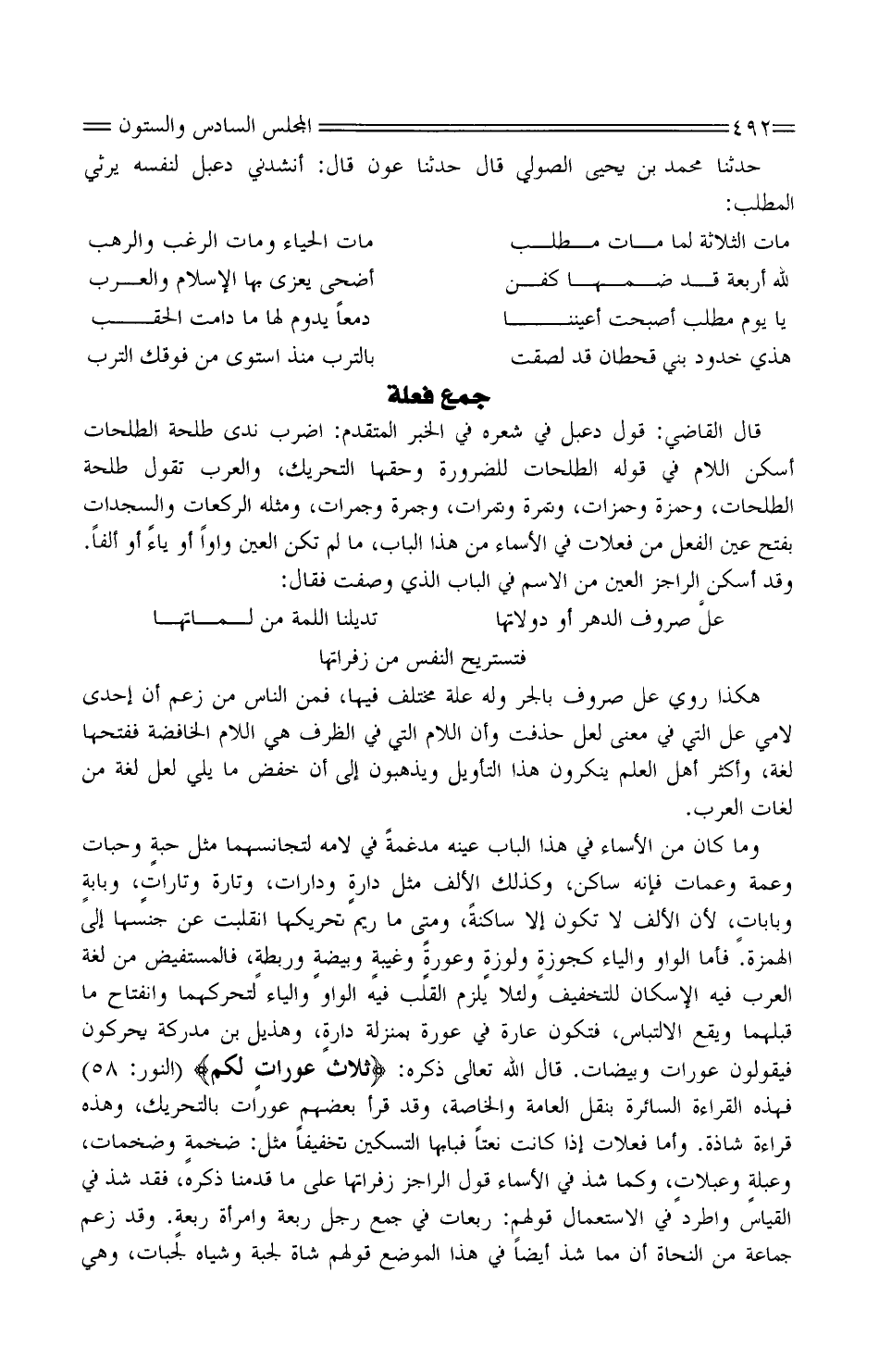 قَالَ القَاضِي: قَول دعبل فِي شعره فِي الْخَبَر الْمُتَقَدّم: اضْرِب ندى طَلْحَة الطلحات أسكن اللَّام فِي قَوْله الطلحات للضَّرُورَة وحقها التحريك، وَالْعرب تَقول طَلْحَة الطلحات، وَحَمْزَة وحمزات، وَتَمْرَة وتمرات، وجمرة وجمرات، وَمثله الرَّكْعَات والسجدات بِفَتْح عين الْفِعْل من فعلات فِي الْأَسْمَاء من هَذَا الْبَاب، مالم تكن الْعين واوا أَو يَاء أَو ألفا. وَقد أسكن الراجز الْعين من الِاسْم فِي الْبَاب الَّذِي وصفت فَقَالَ: