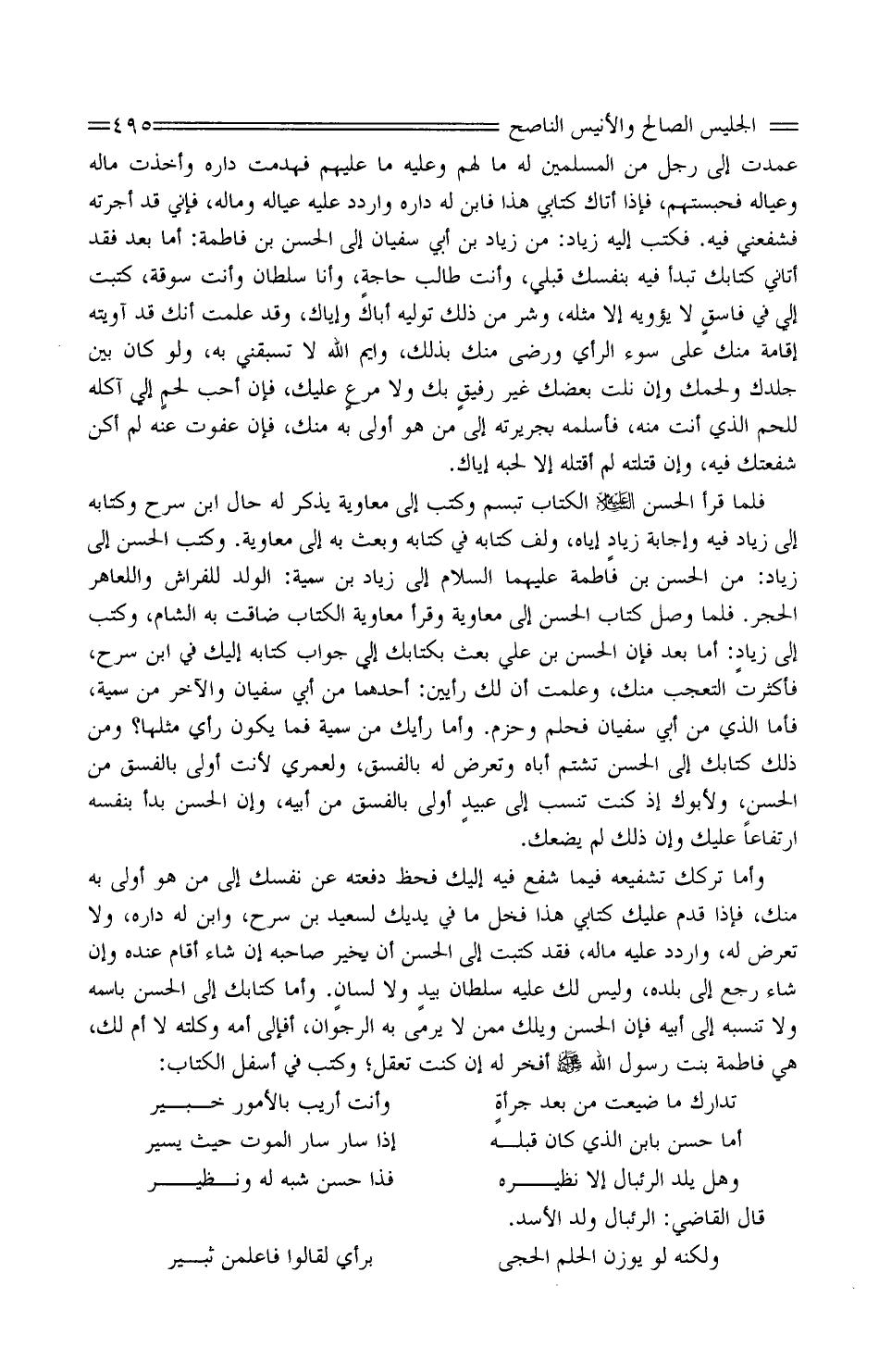 عَمَدْتَ إِلَى رَجُلٍ مِنَ الْمُسْلِمِينَ لَهُ مَالهم وَعَلَيْهِ مَا عَلَيْهِمْ فَهَدَمْتَ دَارَهُ وَأَخَذْتَ مَالَهُ وَعِيَالَهُ فَحَبَسْتَهُمْ، فَإِذَا أَتَاكَ كِتَابِي هَذَا فَابْنِ لَهُ دَارَهُ وَارْدُدْ عَلَيْهِ عِيَالَهُ وَمَالَهُ، فَإِنِّي قَدْ أَجَرْتُهُ فَشَفِّعْنِي فِيهِ. فَكَتَبَ إِلَيْهِ زِيَادٌ: مِنْ زِيَادِ بْنِ أَبِي سُفْيَانَ إِلَى الْحَسَنِ بن فَاطِمَةَ: أَمَّا بَعْدُ فَقَدْ أَتَانِي كِتَابُكَ تَبْدَأُ فِيهِ بِنَفْسِكَ قَبْلِي، وَأَنْتَ طَالِبُ حاجةٍ، وَأَنَا سُلْطَانٌ وَأَنت سوقة، كَتَبْتَ إِلَيَّ فِي فاسقٍ لَا يُؤْوِيهِ إِلا مِثْلُهُ، وَشَرٌّ مِنْ ذَلِكَ تُوَلِّيهِ أَبَاكَ وَإِيَّاكَ، وَقَدْ عَلِمْتُ أَنَّكَ قَدْ أَوَيْتَهُ إِقَامَةً مِنْكَ عَلَى سُوءِ الرَّأْيِ وَرِضًى مِنْكَ بِذَلِكَ، وَايْمُ اللَّهِ لَا تَسْبِقُنِي بِهِ، وَلَوْ كَانَ بَيْنَ جِلْدِكَ وَلَحْمِكَ وَإِنْ نِلْتَ بَعْضَكَ غَيْرَ رفيقٍ بِكَ وَلا مرعٍ عَلَيْكَ، فَإِنَّ أَحَبَّ لحمٍ إِلَيَّ آكُلُهُ لَلَحْمُ الَّذِي أَنْتَ مِنْهُ، فَأَسْلِمْهُ بِجَرِيرَتِهِ إِلَى مَنْ هُوَ أَوْلَى بِهِ مِنْكَ، فَإِنْ عَفَوْتُ عَنْهُ لَمْ أَكُنْ شَفَّعْتُكَ فِيهِ، وَإِنْ قَتَلْتُهُ لَمْ أَقْتُلْهُ إِلا لِحُبِّهِ إِيَّاكَ.