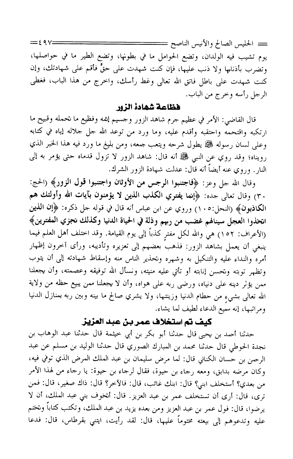 وَقَالَ الله جلّ وَعز: " فَاجْتَنِبُوا الرِّجْسَ مِنَ الأَوْثَانِ وَاجْتَنِبُوا قَوْلَ الزُّورِ " الْحَج:30 وَقَالَ تَعَالَى جده: " إِنَّمَا يَفْتَرِي الْكَذِبَ الَّذِينَ لَا يُؤْمِنُونَ بِآيَاتِ اللَّهِ وَأُولَئِكَ هُمُ الْكَاذِبُونَ " النَّحْل:105 وَرُوِيَ عَن ابْن عَبَّاس أَنه قَالَ فِي قَوْله جلّ ذكره: " إِنَّ الَّذِينَ اتَّخَذُوا الْعِجْلَ سَيَنَالُهُمْ غَضَبٌ مِنْ رَبِّهِمْ وَذِلَّةٌ فِي الْحَيَاةِ الدُّنْيَا وَكَذَلِكَ نَجْزِي الْمُفْتَرِينَ " الْأَعْرَاف: 152 هِيَ وَالله لكل مفترٍ كذبا إِلَى يَوْم الْقِيَامَة. وَقد اخْتلف أهل الْعلم فِيمَا يَنْبَغِي أَن يعْمل بِشَاهِد الزُّور: فَذهب بَعضهم إِلَى تعزيره وتأديبه، وَرَأى آخَرُونَ إِظْهَار أمره والنداء عَلَيْهِ والتنكيل بِهِ وشهره وتحذير النَّاس مِنْهُ وَإِسْقَاط شَهَادَته إِلَى أَن يَتُوب وَتظهر تَوْبَته وتحسن إنابته أَو تَأتي عَلَيْهِ منيته، ونسال الله توفيقه وعصمته، وَأَن يجعلنا مِمَّن يُؤثر دينه على دُنْيَاهُ، ورضى ربه على هَوَاهُ، وَأَن لَا يجعلنا مِمَّن يَبِيع حَظه من ولَايَة الله تَعَالَى بشيءٍ من حطام الدُّنْيَا وَزينتهَا، وَلَا يشري صَالح مَا بَينه وَبَين ربه بمنازل الدُّنْيَا ومراتبها، إِنَّه سميع الدُّعَاء لطيف لما يَشَاء.