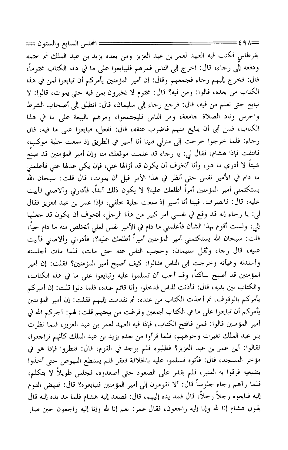 بقرطاسٍ فَكتب فِيهِ الْعَهْد لعمر بن عبد الْعَزِيز وَمن عَبده يزِيد بْن عبد الْملك ثُمَّ خَتمه وَدفعه إِلَى رَجَاء، قَالَ: اخْرُج إِلَى النَّاس فمرهم فليبايعوا على مَا فِي هَذَا الْكتاب مَخْتُومًا، قَالَ: فَخرج إِلَيْهِم رَجَاء فَجَمعهُمْ وَقَالَ: إِن أَمِير الْمُؤمنِينَ يَأْمُركُمْ أَن تبايعوا لمن فِي هَذَا الْكتاب من بعده، قَالُوا: وَمن فِيهِ؟ قَالَ: مختوم لَا تخبرون بِمن فِيهِ حَتَّى يَمُوت، قَالُوا: لَا نُبَايِع حَتَّى نعلم من فِيهِ، قَالَ: فَرجع رَجَاء إِلَى سُلَيْمَان، قَالَ: انْطلق إِلَى أَصْحَاب الشَّرْط والحرس وناد الصَّلَاة جَامِعَة، وَمر النَّاس فليجتمعوا، ومرهم بالبيعة على مَا فِي هَذَا الْكتاب، فَمن أَبِي أَن يُبَايع مِنْهُم فَاضْرب عُنُقه، قَالَ: فَفعل، فَبَايعُوا على مَا فِيهِ، قَالَ رحاء: فَلَمَّا خَرجُوا خرجت إِلَى منزلي فَبينا أَنا أَسِير فِي الطَّرِيق إِذْ مسعت جلبة موكبٍ، فَالْتَفت فَإِذا هِشَام، فَقَالَ لي: يَا رَجَاء قد علمت موقعك منا وَإِن أَمِير الْمُؤمنِينَ قد صنع شيئاًِ لَا أَدْرِي مَا هُوَ، وَأَنا أَتَخَوَّف أَن يكون قد أزالها عني، فَإِن يكن عدلها عني فَأَعْلمنِي مَا دَامَ فِي الْأَمِير نفس حَتَّى أنظر فِي هَذَا الْأَمر قبل أَن يَمُوت، قَالَ قلت: سُبْحَانَ الله يستكتمني أَمِير الْمُؤمنِينَ أمرا أطلعك عَلَيْهِ؟ لَا يكون ذَلِك أبدا، فأدارني وَألا صني فأبيت عَلَيْهِ، قَالَ: فَانْصَرف. فَبينا أَنا أَسِير إِذْ سَمِعت جلبة خَلْفي، فَإِذا عمر بْن عبد الْعَزِيز فَقَالَ لي: يَا رَجَاء إِنَّه قد وَقع فِي نَفسِي أَمر كَبِير من هَذَا الرجل، أَتَخَوَّف أَن يكون قد جعلهَا إِلَيّ، وَلست أقوم بِهَذَا الشَّأْن فَأَعْلمنِي مَا دَامَ فِي الْأَمِير نفس لعَلي أتخلص مِنْهُ مَا دَامَ حَيا، قلت: سُبْحَانَ الله يستكتمني أَمِير الْمُؤمنِينَ أَمِيرا أطلعك عَلَيْهِ؟، فأدراني وَألا صني فأبيت عَلَيْهِ، قَالَ رَجَاء وَثقل سُلَيْمَان، وحجب النَّاس عَنْهُ حَتَّى مَاتَ، فَلَمَّا مَاتَ أجلسته وأسندته وهيأته وَخرجت إِلَى النَّاس فَقَالُوا: كَيفَ أصبح أَمِير الْمُؤمنِينَ؟ فَقلت: إِن أَمِير الْمُؤمنِينَ قد أصبح سَاكِنا، وَقد أحب أَن تسلموا عَلَيْهِ وتبايعوا على مَا فِي هَذَا الْكتاب، وَالْكتاب بَين يَدَيْهِ، قَالَ: فَأَذنت للنَّاس فَدَخَلُوا وَأَنا قَائِم عِنْده، فَلَمَّا دنوا قلت: إِن أميركم يَأْمُركُمْ بِالْوُقُوفِ، ثُمَّ أخذت الْكتاب من عِنْده، ثُمَّ تقدّمت إِلَيْهِم فَقلت: إِن أَمِير الْمُؤمنِينَ يَأْمُركُمْ أَن تبايعوا على مَا فِي الْكتاب أَجْمَعِينَ وفرغت من بيعتهم قلت: لَهُم: آجركم الله فِي أَمِير الْمُؤمنِينَ قَالُوا: فَمن فافتح الْكتاب، فَإِذا فِيهِ الْعَهْد لعمر بْن عبد الْعَزِيز، فَلَمَّا نظرت بَنو عبد الْملك تَغَيَّرت وُجُوههم، فَلَمَّا قرأوا من بعده يزِيد بْن عبد الْملك كَأَنَّهُمْ تراجعوا، فَقَالُوا: أَيْن عمر بْن عبد الْعَزِيز؟ فطلبوه فَلم يُوجد فِي الْقَوْم، قَالَ: فنظروا فَإِذا هُوَ فِي مُؤخر الْمَسْجِد، قَالَ: فَأتوهُ فَسَلمُوا عَلَيْهِ بالخلافة فعقر فَلم يسْتَطع النهوض حَتَّى أخذُوا بضبعيه فرقوا بِهِ الْمِنْبَر، فَلم يقدر على الصعُود حَتَّى أصعدوه، فَجَلَسَ طَويلا لَا يتَكَلَّم، فَلَمَّا رَآهُمْ رَجَاء جُلُوسًا قَالَ: أَلا تقومون إِلَى أَمِير الْمُؤمنِينَ فتبايعوه؟ قَالَ: فَنَهَضَ الْقَوْم إِلَيْهِ فَبَايعُوهُ رجلا رجلا، قَالَ فَمد يَده إِلَيْهِم، قَالَ: فَصَعدَ إِلَيْهِ هِشَام فَلَمَّا مد يَده إِلَيْهِ قَالَ يَقُول هِشَام إِنَّا لله وَإِنَّا إِلَيْهِ رَاجِعُون، فَقَالَ عمر: نعم إِنَّا لله وَإِنَّا إِلَيْهِ رَاجِعُون حِين صَار