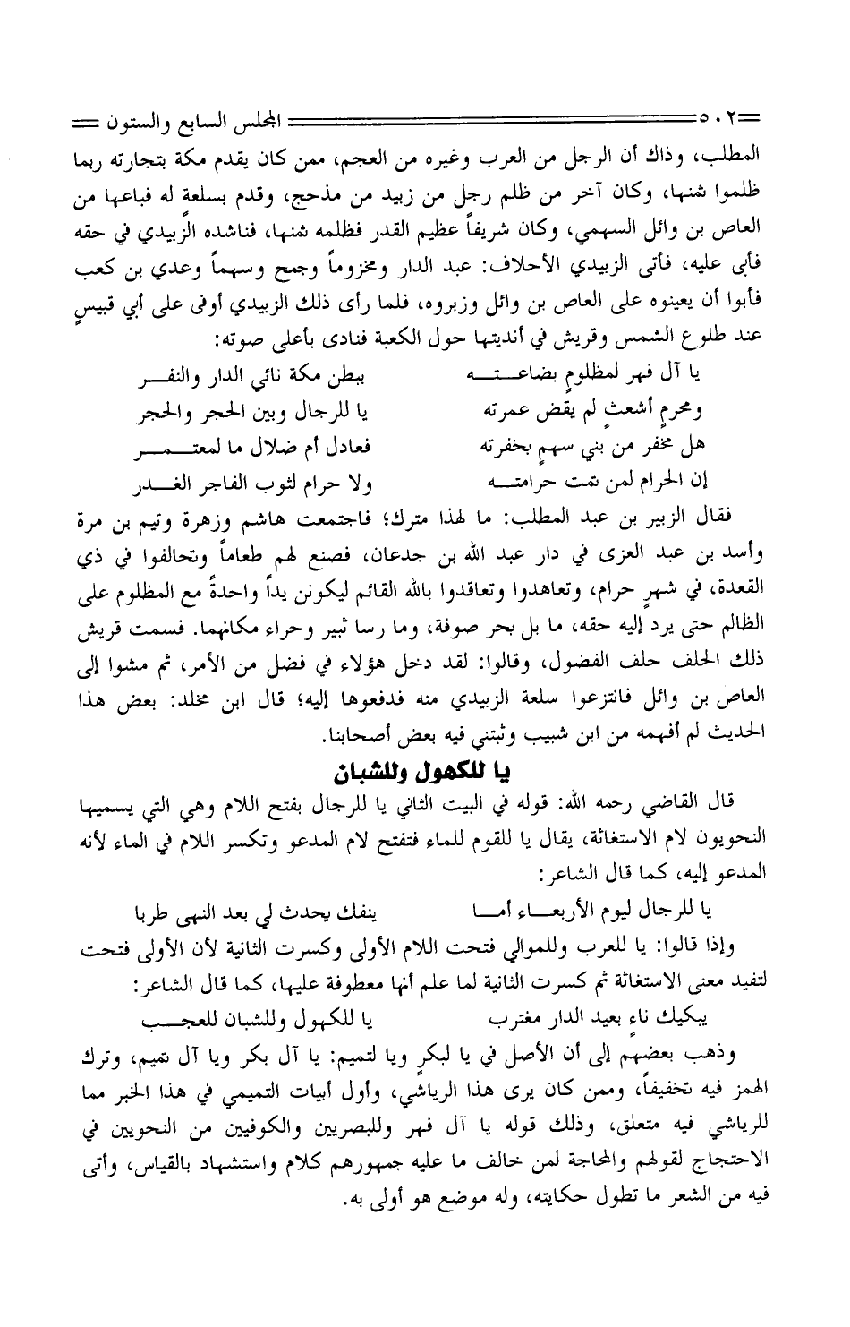 قَالَ القَاضِي رَحمَه الله: قَوْله فِي الْبَيْت الثَّانِي يَا للرِّجَال بِفَتْح اللَّام وَهِي التييسميها النحويون لَام الاستغاثة، يُقَال يَا للْقَوْم للْمَاء فتفتح لَام الْمَدْعُو وتكسر اللَّام فِي المَاء لِأَنَّهُ الْمَدْعُو إِلَيْهِ، كَمَا قَالَ الشَّاعِر: