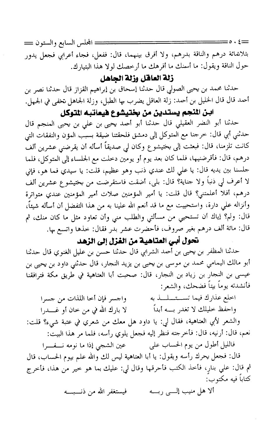 حَدَّثَنَا أَبُو النَّضْر الْعُقَيْليّ قَالَ حَدَّثَنَا أَبُو أَحْمَد يحيى بْن عَليّ بْن يحيى المنجم، قَالَ حَدَّثَنِي أَبِي قَالَ: خرجنَا مَعَ المتَوَكل إِلَى دمشق فلحقتنا ضيقَة بِسَبَب الْمُؤَن والنفقات الَّتِي كَانَت تلزمنا، قَالَ: فَبعثت إِلَى بختيشوع وَكَانَ لي صديقا أسأله أَن يقرضني عشْرين ألف دِرْهَم، قَالَ: فأقرضنيها، فَلَمَّا كَانَ بعد يَوْم أَو يَوْمَيْنِ دخلت مَعَ الجلساء إِلَى المتَوَكل، فَلَمَّا فأقرضنيها، فَلَمَّا كَانَ بعد يَوْم أَو يَوْمَيْنِ دخلت مَعَ الجلساء إِلَى المتَوَكل، فَلَمَّا جلسنا بَين يَدَيْهِ قَالَ: يَا عَليّ لَك عِنْدِي ذَنْب وَهُوَ عَظِيم، قلت: يَا سَيِّدي فَمَا هُوَ، فَإِنِّي لَا أعرف لي ذَنبا وَلَا جِنَايَة؟ قَالَ: بلَى، أضقت فاستقرضت من بختيشوع عشْرين ألف دِرْهَم، أَفلا أعلمتني؟ قَالَ قلت: يَا أَمِير الْمُؤمنِينَ صلات أَمِير الْمُؤمنِينَ عِنْدِي متواترة وأنزاله على دَاره، وَاسْتَحْيَيْت مَعَ مَا قد أنعم الله علينا بِهِ من هَذَا التفضل أَن أسأله شَيْئا، قَالَ: وَلم؟ إياك أَن تستحيي من مَسْأَلَتي والطلب مني وَأَن تعاود مثل مَا كَانَ مِنْك، ثُمَّ قَالَ: مائَة ألف دِرْهَم بِغَيْر صروف، فأحضرت عشر بدر فَقَالَ: خُذْهَا واتسع بهَا.