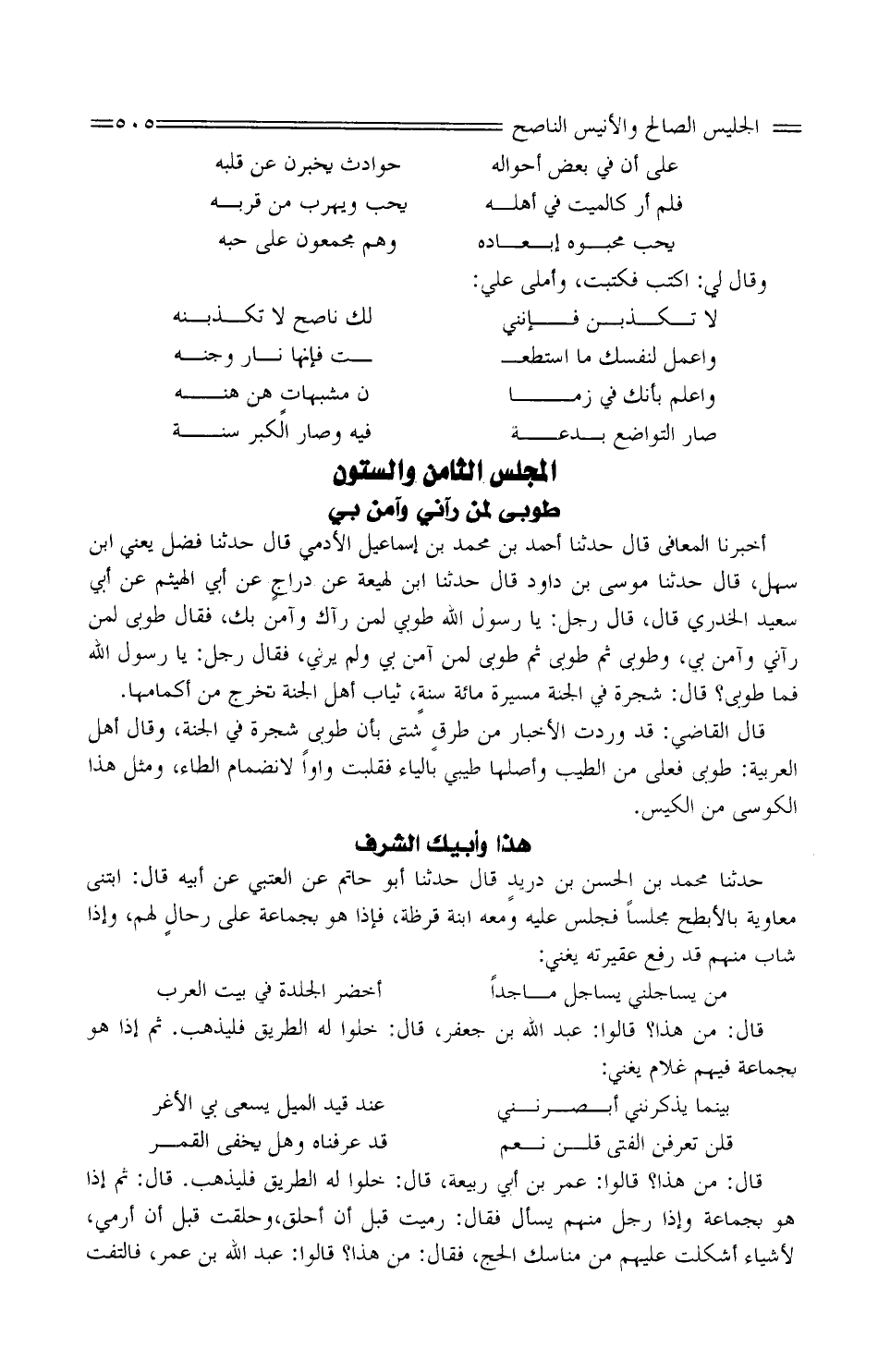 أَخْبَرَنَا الْمُعَافَى قَالَ حَدَّثَنَا أَحْمَد بْن مُحَمَّد بْنِ إِسْمَاعِيلَ الأَدَمِيُّ قَالَ حَدَّثَنَا فَضْلٌ يَعْنِي ابْنَ سَهْلٍ، قَالَ حَدَّثَنَا مُوسَى بْنُ دَاوُدَ قَالَ حَدثنَا ابْن لَهِيعَة عَن دراجٍ عَنْ أَبِي الْهَيْثَمِ عَنْ أَبِي سَعِيدٍ الْخُدْرِيِّ قَالَ، قَالَ رَجُلٌ: يَا رَسُولَ اللَّهِ طُوبَى لِمَنْ رَآكَ وَآمَنَ بِكَ، فَقَالَ طُوبَى لِمَنْ رَآنِي وَآمَنَ بِي، وَطُوبَى ثُمَّ طُوبَى ثُمَّ طُوبَى لِمَنْ آمَنَ بِي وَلَمْ يَرَنِي، فَقَالَ رَجُلٌ: يَا رَسُولَ اللَّهِ فَمَا طُوبَى؟ قَالَ: شَجَرَةٌ فِي الْجَنَّةِ مَسِيرَةَ مِائَةِ سنةٍ، ثِيَابُ أَهْلِ الْجَنَّةِ تَخْرُجُ مِنْ أَكْمَامِهَا.