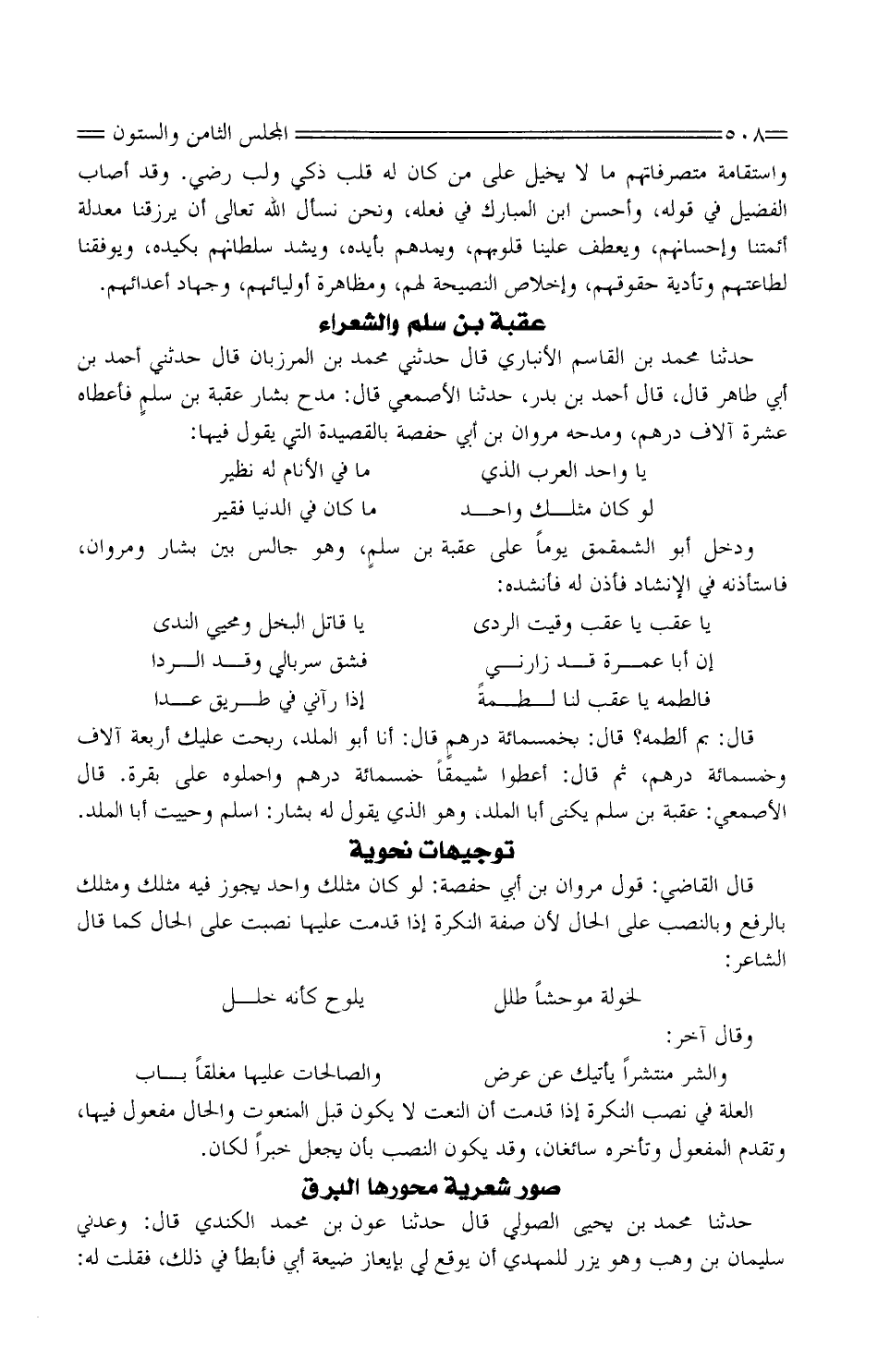 حَدَّثَنَا مُحَمَّد بْن القَاسِم الأنبَاريّ قَالَ حَدَّثَنِي مُحَمَّد بْن الْمَرْزُبَان قَالَ حَدَّثَنِي أَحْمَد بْن أبي طَاهِر قَالَ، قَالَ أَحْمَد بْن بدر، حَدَّثَنَا الْأَصْمَعِي قَالَ: مدح بشار عقبَة بن سلمٍ فَأعْطَاهُ عشرَة آلَاف دِرْهَم، ومدحه مَرْوَان بْن أَبِي حَفْصَة بالقصيدة الَّتِي يَقُول فِيهَا: