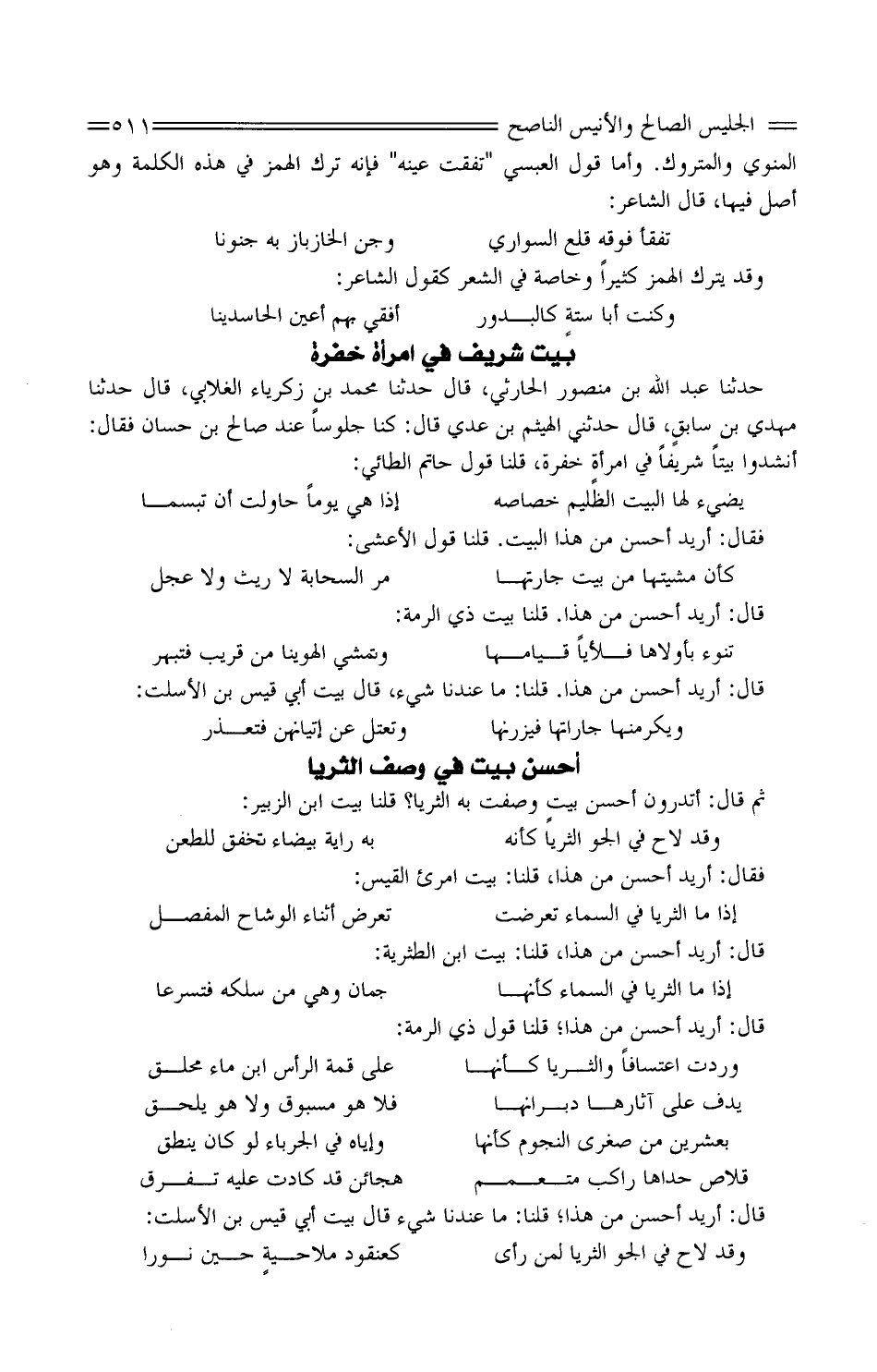 ثمَّ قَالَ: أَتَدْرُونَ أحسن بيتٍ وصفت بِهِ الثريا؟ قُلْنَا بَيت ابْن الزُّبَيْر: