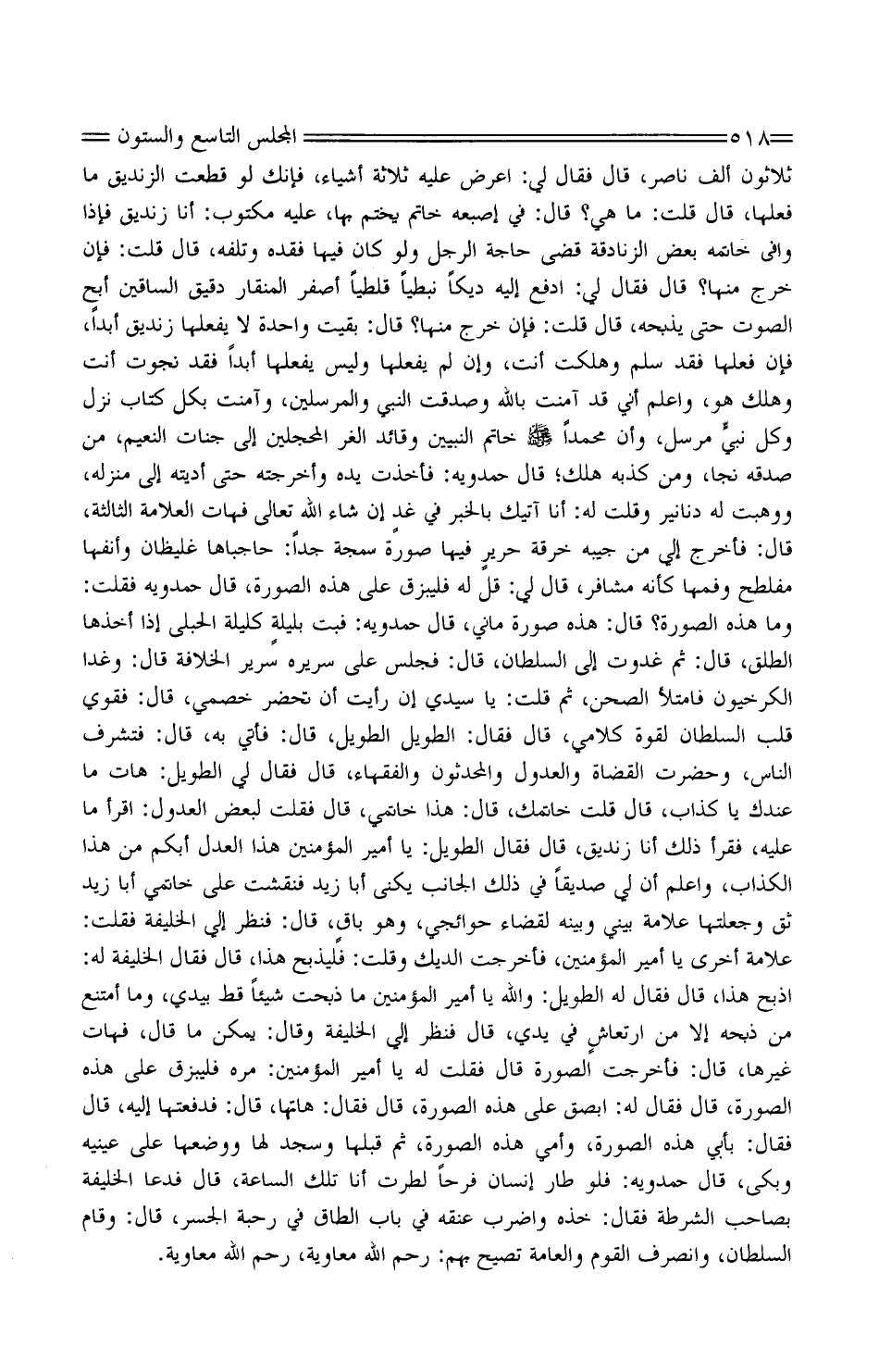 ثَلَاثُونَ ألف نَاصِر، قَالَ فَقَالَ لي: أعرض عَلَيْهِ ثَلَاثَة أَشْيَاء، فَإنَّك لَو قطعت الزنديق مَا فعلهَا، قَالَ قلت: مَا هِيَ؟ قَالَ: فِي إصبعه خَاتم يخْتم بهَا، عَلَيْهِ مَكْتُوب: أَنا زنديق فَإِذا وافى خَاتمه بعض الزَّنَادِقَة قضى حَاجَة الرجل وَلَو كَانَ فِيهَا فَقده وتلفه، قَالَ قلت: فَإِن خرج مِنْهَا؟ قَالَ فَقَالَ لي: ادْفَعْ إِلَيْهِ ديكًا نبطيًا قلطيًا أصفر المنقار دَقِيق السَّاقَيْن أبح الصَّوْت حَتَّى يذبحه، قَالَ قلت: فَإِن خرج مِنْهَا؟ قَالَ: بقيت وَاحِدَة لَا يَفْعَلهَا زنديق أبدا، فَإِن فعلهَا فقد سلم وَهَلَكت أَنْت، وَإِن لم يَفْعَلهَا وَلَيْسَ يَفْعَلهَا أبدا فقد نجوت أَنْت وَهلك هُوَ، وَأعلم أَنِّي قد آمَنت بِاللَّه وصدقت النَّبِي وَالْمُرْسلِينَ، وَآمَنت بِكُل كتاب نزل وكل نبيٍ مُرْسل، وَأَن مُحَمَّدًا صَلَّى اللَّهُ عَلَيْهِ وَسَلَّمَ خَاتم النَّبِيين وقائد الغر المحجلين إِلَى جنَّات النَّعيم، من صدقه نجا، وَمن كذبه هلك؛ قَالَ حَمْدَوَيْه: فَأخذت يَده وأخرجته حَتَّى أديته إِلَى منزله، ووهبت لَهُ دَنَانِير وَقلت لَهُ: أَنا آتِيك بالْخبر فِي غدٍ إِن شَاءَ الله تَعَالَى فهات الْعَلامَة الثَّالِثَة، قَالَ: فَأخْرج إِلَيّ من جيبه خرقَة حريرٍ فِيهَا صُورَة سمجة جدا: حاجباها غليظان وأنفها مفلطح وفمها كَأَنَّهُ مشافر، قَالَ لي: قل لَهُ فليبزق على هَذِه الصُّورَة، قَالَ حَمْدَوَيْه فَقلت: وَمَا هَذِه الصُّورَة؟ قَالَ: هَذِه صُورَة ماني، قَالَ حَمْدَوَيْه: فَبت بليلةٍ كليلة الحبلى إِذا أَخذهَا الطلق، قَالَ: ثُمَّ غَدَوْت إِلَى السُّلْطَان، قَالَ: فَجَلَسَ على سَرِيره سَرِير الْخلَافَة قَالَ: وَغدا الكرخيون فَامْتَلَأَ الصحن، ثُمَّ قلت: يَا سَيِّدي إِن رَأَيْت أَن تحضر خصمي، قَالَ: فقوي قلب السُّلْطَان لقُوَّة كَلَامي، قَالَ فَقَالَ: الطَّوِيل الطَّوِيل، قَالَ: فَأتي بِهِ، قَالَ: فتشرف النَّاس، وَحَضَرت الْقُضَاة والعدول والمحدثون وَالْفُقَهَاء، قَالَ فَقَالَ لي الطَّوِيل: هَات مَا عنْدك يَا كَذَّاب، قَالَ قلت خاتمك، قَالَ: هَذَا خَاتمِي، قَالَ فَقلت لبَعض الْعُدُول: اقْرَأ مَا عَلَيْهِ، فَقَرَأَ ذَلِك أَنا ونديق، قَالَ فَقَالَ الطَّوِيل: يَا أَمِير الْمُؤمنِينَ هَذَا الْعدْل أبكم من هَذَا الْكذَّاب، وَأعلم أَن لي صديقا فِي ذَلِك الْجَانِب يكني أَبَا زيد فنقشت على خَاتمِي أَبَا زيد ثق وجعلتها عَلامَة بيني وَبَينه لقَضَاء حوائجي، وَهُوَ باقٍ، قَالَ: فَنظر إِلَى الْخَلِيفَة فَقلت: عَلامَة أُخْرَى يَا أَمِير الْمُؤمنِينَ، فأخرجت الديك وَقلت: فليذبح هَذَا، قَالَ فَقَالَ الْخَلِيفَة لَهُ: اذْبَحْ هَذَا، قَالَ فَقَالَ لَهُ الطَّوِيل: وَالله يَا أَمِير الْمُؤمنِينَ مَا ذبحت شَيْئا قطّ بيَدي، وَمَا أمتنع من ذبحه إِلَّا من ارتعاشٍ فِي يَدي، قَالَ فَنظر إِلَى الْخَلِيفَة فَقلت: عَلامَة أُخْرَى يَا أَمِير الْمُؤمنِينَ، فأخرجت الديك وَقلت: فليذبح هَذَا، قَالَ فَقَالَ الْخَلِيفَة لَهُ: اذْبَحْ هَذَا، قَالَ فَقَالَ لَهُ الطَّوِيل: وَالله يَا أَمِير الْمُؤمنِينَ مَا ذبحت شَيْئا قطّ بيَدي، وَمَا أمتنع من ذبحه إِلَّا من ارتعاشٍ فِي يَدي، قَالَ فَنظر إِلَيّ الْخَلِيفَة وَقَالَ: يُمكن مَا قَالَ، فهات غَيرهَا، قَالَ: فأخرجت الصُّورَة قَالَ فَقلت لَهُ يَا أَمِير الْمُؤمنِينَ: مره فليبزق على هَذِه الصُّورَة، قَالَ فَقَالَ لَهُ: أبصق على هَذِه الصُّورَة، قَالَ فَقَالَ: هَاتِهَا، قَالَ: فدفعتها إِلَيْهِ، قَالَ فَقَالَ: بِأبي هَذِه الصُّورَة، وَأمي هَذِه الصُّورَة، ثمَّ قبلهَا وَسجد لَهَا ووضعها على عَيْنَيْهِ وَبكى، قَالَ حَمْدَوَيْه: فَلَو طَار إِنْسَان فَرحا لطرت أَنا تِلْكَ السَّاعَة، قَالَ فَدَعَا الْخَلِيفَة بِصَاحِب الشرطة فَقَالَ: خُذْهُ وَاضْرِبْ عُنُقه فِي بَاب الطاق فِي رحبة الجسر، قَالَ: وَقَامَ السُّ
