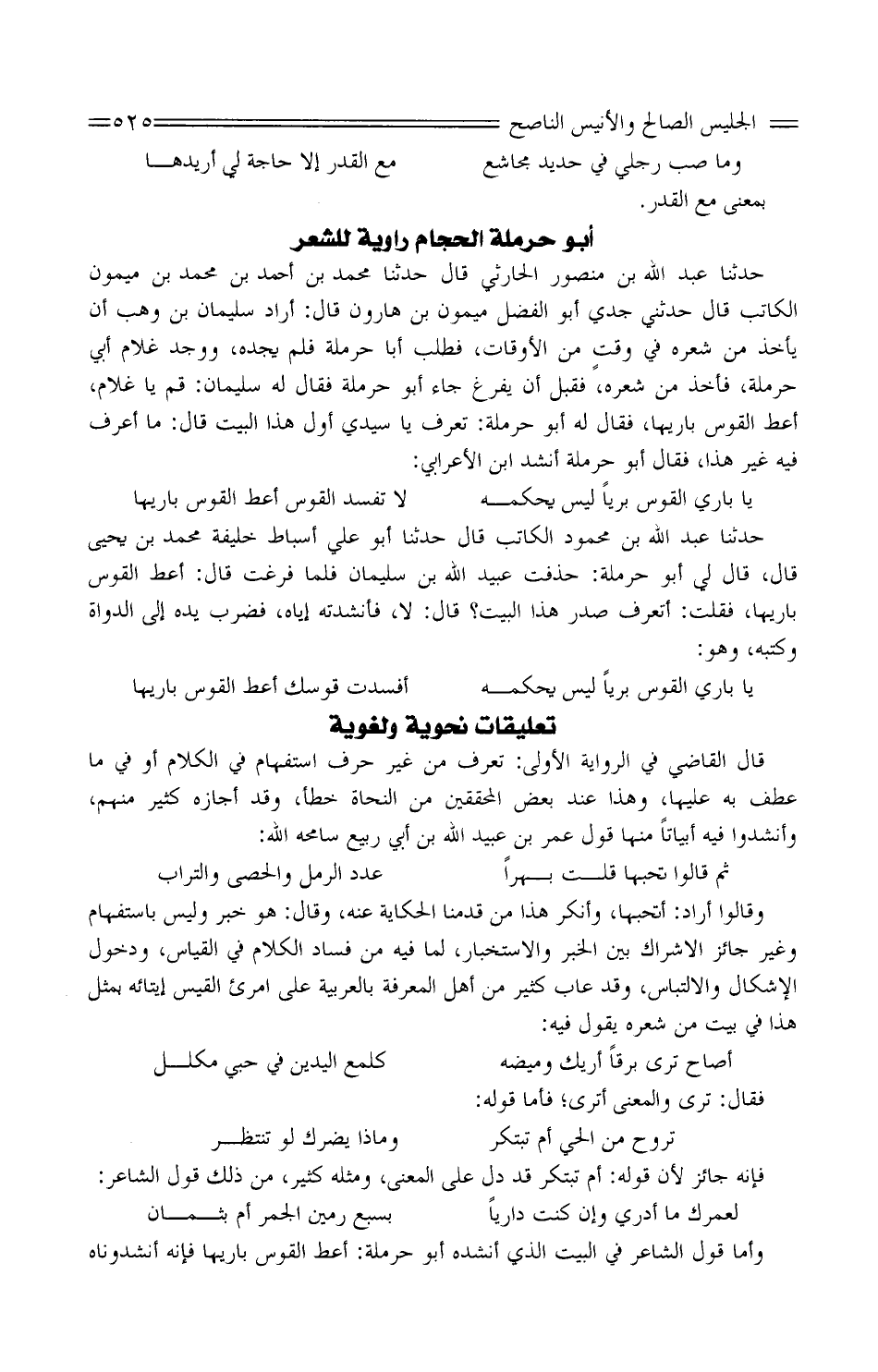 حَدَّثَنَا عَبْد اللَّه بْن مَنْصُور الْحَارِثِيّ قَالَ حَدَّثَنَا مُحَمَّد بْن أَحْمَد بْن مُحَمَّد بْن مَيْمُون الْكَاتِب قَالَ حَدَّثَنِي جدي أَبُو الْفضل مَيْمُون بْن هَارُون قَالَ: أَرَادَ سُلَيْمَان بْن وهب أَن يَأْخُذ من شعره فِي وقتٍ من الْأَوْقَات، فَطلب أَبَا حَرْمَلَة فَلم يجده، وَوجد غُلَام أَبِي حَرْمَلَة، فَأخذ من شعره، فَقبل أَن يفرغ جَاءَ أَبُو حَرْمَلَة فَقَالَ لَهُ سُلَيْمَان: قُم يَا غُلَام، أعْط الْقوس باريها، فَقَالَ لَهُ أَبُو حَرْمَلَة: تعرف يَا سَيِّدي أول هَذَا الْبَيْت قَالَ: مَا أعرف فِيهِ غير هَذَا، فَقَالَ أَبُو حَرْمَلَة أنْشد ابْن الْأَعرَابِي: