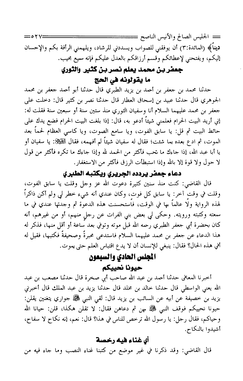 حَدثنَا مُحَمَّد بْن جَعْفَر بْن أَحْمَد بْن يزِيد الطَّبَرِيّ قَالَ حَدَّثَنَا أَبُو أَحْمَد جَعْفَر بْن مُحَمَّد الْجَوْهَرِي قَالَ حَدَّثَنَا عبيد بْن إِسْحَاق الْعَطَّار قَالَ حَدَّثَنَا نصر بْن كثير قَالَ: دخلت على جَعْفَر بْن مُحَمَّد عَلَيْهِمَا السَّلَام أَنا وسُفْيَان الثَّوْريّ مُنْذُ سِتِّينَ سنة أَو سبعين سنة فَقلت لَهُ: إِنِّي أُرِيد الْبَيْت الْحَرَام فعلمني شَيْئا أَدْعُو بِهِ، قَالَ: إِذا بلغت الْبَيْت الْحَرَام فضع يدك على حَائِط الْبَيْت ثُمَّ قل: يَا سَابق الْفَوْت، وَيَا سامع الصَّوْت، وَيَا كاسي الْعِظَام لَحْمًا بعد الْمَوْت، ثُمَّ ادْع بعده با شِئْت؛ فَقَالَ لَهُ سُفْيَان شَيْئا لم أفهمهُ، فَقَالَ عَلَيْهِ السَّلَام: يَا سُفْيَان أَو يَا أَبَا عَبد اللَّه، إِذا جَاءَك مَا تحب فَأكْثر من الْحَمد لله وَإِذا جَاءَك مَا تكره فَأكْثر مِنْ قَوْلِ لَا حَوْلَ وَلا قُوَّة إِلَّا بِاللَّه وَإِذا اسْتَبْطَأَتْ الرزق فَأكْثر من الاسْتِغْفَار.