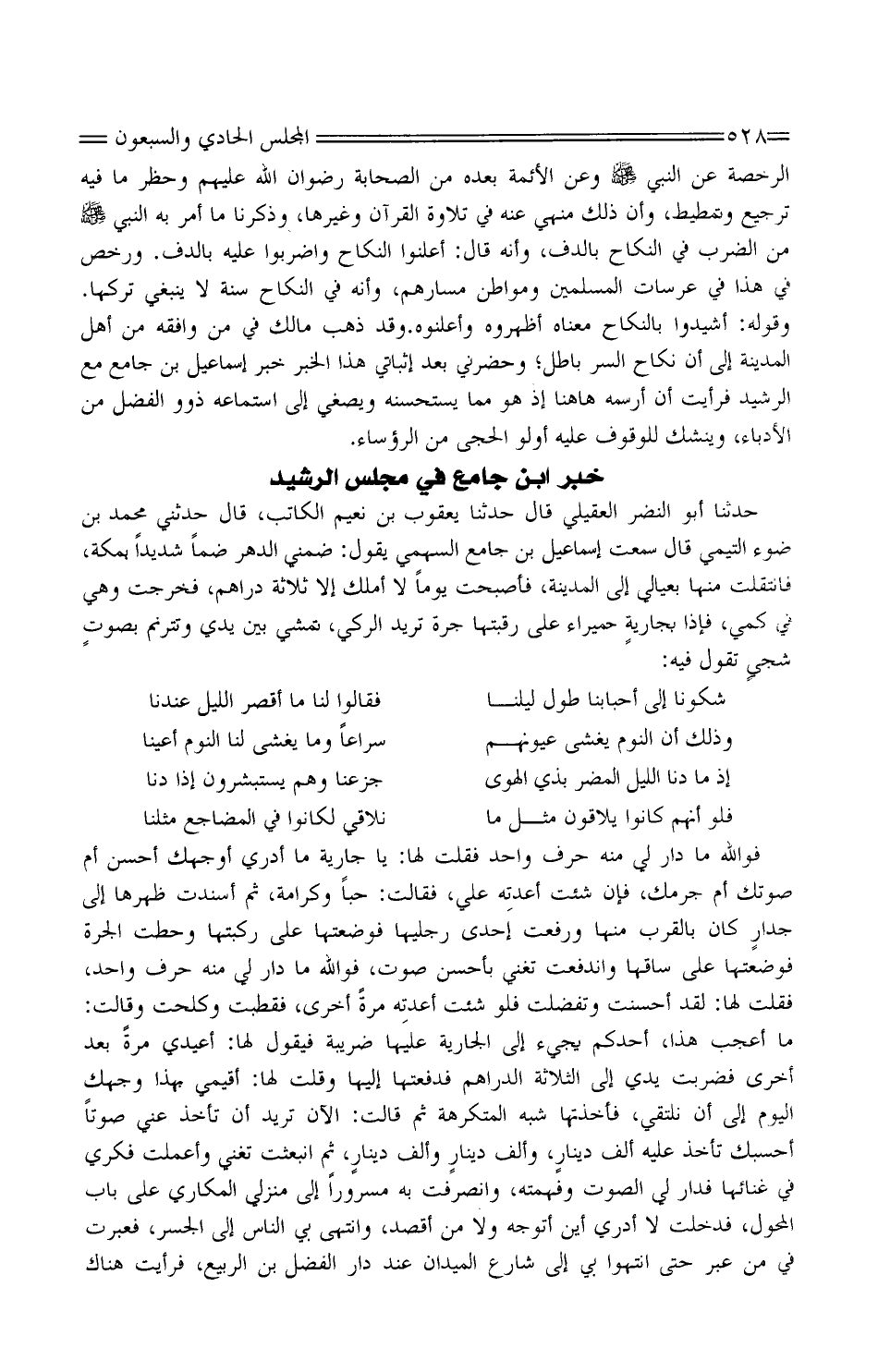 الرُّخْصَة عَن النَّبِي صَلَّى اللَّهُ عَلَيْهِ وَسَلَّمَ وَعَن الْأَئِمَّة بعده من الصَّحَابَة رضوَان الله عَلَيْهِم وحظر مَا فِيهِ تَرْجِيع وتمطيط، وَإِن ذَلِك مَنْهِيّ عَنْهُ فِي تِلَاوَة الْقُرْآن وَغَيرهَا، وَذكرنَا مَا أَمر بِهِ النَّبِي صَلَّى اللَّهُ عَلَيْهِ وَسَلَّمَ من الضَّرْب فِي النِّكَاح بالدف، وَأَنه قَالَ: أعْلنُوا النِّكَاح واضربوا عَلَيْهِ بالدف. وَرخّص فِي هَذَا فِي عرسات الْمُسلمين ومواطن مسارهم، وَأَنه فِي النِّكَاح سنة لَا يَنْبَغِي تَركهَا. وَقَوله: أشيدوا بِالنِّكَاحِ مَعْنَاهُ أظهروه وأعلنوه. وَقد ذهب مَالك فِي من وَافقه من أهل الْمَدِينَة إِلَى أَن نِكَاح السِّرّ بَاطِل؛ وحضرني بعد إثباتي هَذَا الْخَبَر خبر إِسْمَاعِيل بْن جَامع مَعَ الرشيد فرايت أَن أرسمه هَاهُنَا إِذْ هُوَ مِمَّا يستحسنه ويصغي إِلَى استماعه ذَوُو الْفضل من الأدباء، وينشك للوقوف عَلَيْهِ أولو الحجى من الرؤساء.
