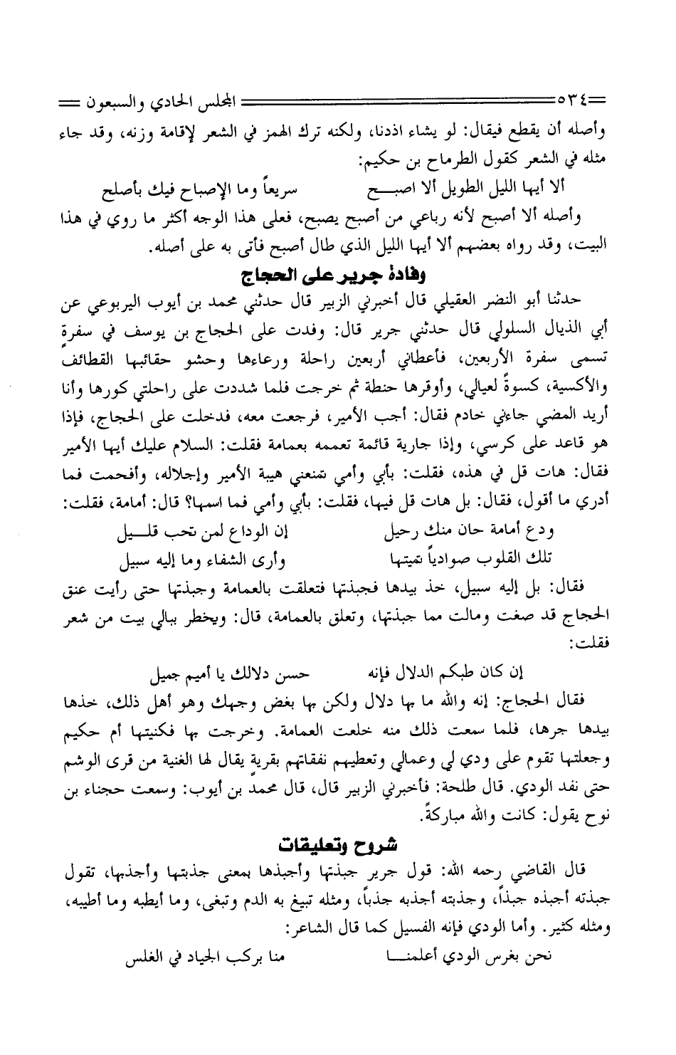 حَدثنَا أَبُو النَّضر الْعقيلِيّ قَالَ أَخْبرنِي الزُّبَيْر قَالَ حَدَّثَنِي مُحَمَّد بْن أَيُّوب الْيَرْبُوعي عَن أَبِي الذَّيَّال السَّلُولي قَالَ حَدَّثَنِي جرير قَالَ: وفدت على الْحجَّاج بْن يُوسُف فِي سفرةٍ تسمى سفرة الْأَرْبَعين، فَأَعْطَانِي أَرْبَعِينَ رَاحِلَة ورعاءها وحشو حقائبها القطائف والأكسية، كسْوَة لِعِيَالِي، وأوقرها حِنْطَة ثُمَّ خرجت فَلَمَّا شددت على رَاحِلَتي كورها وَأَنا أُرِيد الْمُضِيّ جائني خَادِم فَقَالَ: أجب الْأَمِير، فَرَجَعت مَعَه، فَدخلت على الْحجَّاج، فَإِذا هُوَ قَاعد على كرْسِي، وَإِذا جَارِيَة قَائِمَة تعممه بعمامة فَقلت: السَّلَام عَلَيْك أَيهَا الْأَمِير فَقَالَ: هَات قل فِي هَذِه، فَقلت: بِأبي وَأمي تمنعني هَيْبَة الْأَمِير وإجلاله، وأفحمت فَمَا أَدْرِي مَا أَقُول، فَقَالَ: بل هَات قل فِيهَا، فَقلت: بِأبي وَأمي فَمَا اسْمهَا؟ قَالَ: أُمَامَة، فَلَمَّا أُمَامَة فتح عَليّ فَقلت:
