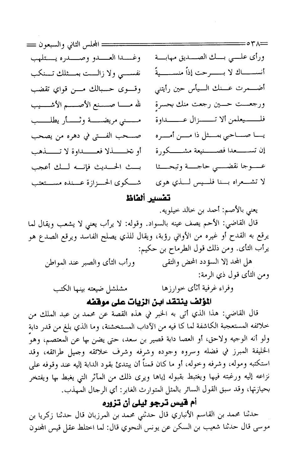 حَدَّثَنَا مُحَمَّد بْن القَاسِم الأنبَاريّ قَالَ حَدَّثَنِي مُحَمَّد بْن الْمَرْزُبَان قَالَ حَدَّثَنَا زَكَرِيّا بْن مُوسَى قَالَ حَدَّثَنَا شُعَيْب بْن السكن عَنْ يُونُس النَّحْويّ قَالَ: لما اخْتَلَط عقل قَيْس الْمَجْنُون