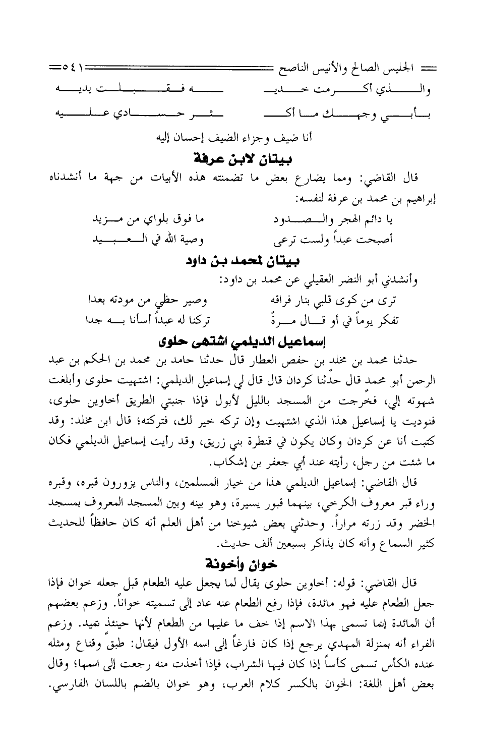 حَدَّثَنَا مُحَمَّدُ بْنُ مخلدٍ بْنِ حَفْص الْعَطَّار قَالَ حَدَّثَنَا حَامِد بْن مُحَمَّد بْن الحكم بْن عبد الرَّحْمَن أَبُو محمدٍ قَالَ حَدثنَا كردان قَالَ قَالَ لي إسماعي الديلمي: اشْتهيت حلوى وأبلغت شَهْوَته إِلَيّ، فَخرجت من الْمَسْجِد بِاللَّيْلِ لأبول فَإِذا جنبتي الطَّرِيق أخاوين حلوى، فنوديت يَا إِسْمَاعِيل هَذَا الَّذِي اشْتهيت وَإِن تَركه خير لَك، فتركته؛ قَالَ ابْن مخلد: وَقد كتبت أَنا عَن كردان وَكَانَ يكون فِي قنطرة بني زُرَيْق، وَقد رَأَيْت إِسْمَاعِيل الديلمي فَكَانَ مَا شِئْت من رجل، رَأَيْته عِنْد أَبِي جَعْفَر بْن إشكاب.