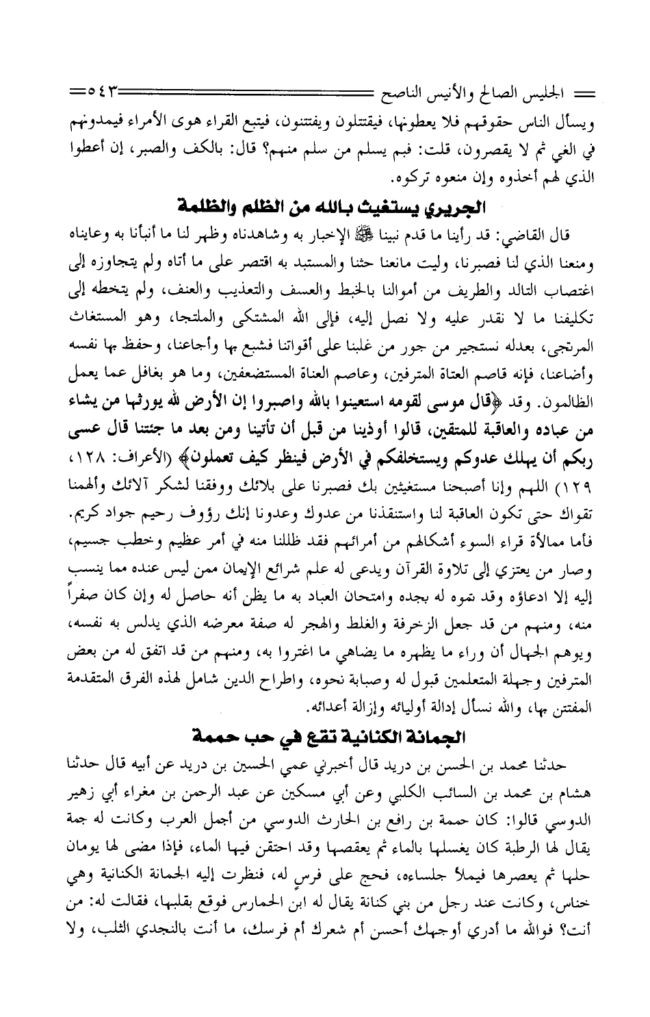 قَالَ القَاضِي: قد رَأينَا مَا قدم نَبينَا صَلَّى اللَّهُ عَلَيْهِ وَسلم الْإِخْبَار بِهِ وشاهدناه وَظهر لنا مَا أَنبأَنَا بِهِ وعايناه ومنعنا الَّذِي لنا فصبرنا، وليت مَا نعنا حثنا والمستبد بِهِ اقْتصر على مَا أَتَاهُ وَلم يتجاوزه إِلَى اغتصاب التالد والطريف من أَمْوَالنَا بالخبط والعسف والتعذيب والعنف، وَلم يتخطه إِلَى تكليفنا مَا لَا نقدر عَلَيْهِ وَلَا نصل إِلَيْهِ، فَإلَى الله المشتكى والملتجأ، وَهُوَ المستغاث المرتجى، بعدله نستجير من جور من غلبنا على أقواتنا فشبع بهَا وأجاعنا، وَحفظ بهَا نَفسه وأضاعنا، فَإِنَّهُ قاصم العتاة المترفين، وَعَاصِم العناة الْمُسْتَضْعَفِينَ، وَمَا هُوَ بغافل عَمَّا يعْمل الظَّالِمُونَ. وَقد " قَالَ مُوسَى لِقَوْمِهِ اسْتَعِينُوا بِاللَّهِ وَاصْبِرُوا إِنَّ الأَرْضَ لِلَّهِ يُورِثُهَا من يَشَاء من باده وَالْعَاقِبَةُ لِلْمُتَّقِينَ، قَالُوا أُوذِينَا مِنْ قَبْلِ أَنْ تَأْتِيَنَا وَمِنْ بَعْدِ مَا جِئْتَنَا قَالَ عَسَى رَبُّكُمْ أَنْ يُهْلِكَ عَدُوَّكُمْ وَيَسْتَخْلِفَكُمْ فِي الأَرْضِ فَيَنْظُرَ كَيْفَ تَعْمَلُونَ " الْأَعْرَاف: 128129 اللَّهُمَّ وَإِنَّا أَصْبَحْنَا مستغيثني بك فصبرنا على بلائك ووفقنا لشكر آلَائِكَ وألهمنا تقواك حَتَّى تكون الْعَاقِبَة لنا واستنقذنا من عَدوك وعدونا إِنَّك رؤوف رَحِيم جواد كريم. فَأَما ممالأة قراء السوء أشكالهم من أمرائهم فقد ظللنا مِنْهُ فِي أَمر عَظِيم وخطب جسيم، وَصَارَ من يعتزي إِلَى تِلَاوَة الْقُرْآن ويدعى لَهُ علم شرائع الْإِيمَان مِمَّن لَيْسَ عِنْده مِمَّا ينْسب إِلَيْهِ إِلَّا ادعاؤه وَقد تموه لَهُ بجده وامتحان الْعباد بِهِ مَا يظنّ أَنه حَاصِل لَهُ وَإِن كَانَ صفرًا مِنْهُ، وَمِنْهُم من قد جعل الزخرفة والغلط والهجر لَهُ صفة معرضة الَّذِي يُدَلس بِهِ نَفسه، ويوهم الْجُهَّال أَن وَرَاء مَا يظهره مَا يضاهي مَا اغتروا بِهِ، وَمِنْهُم من قد اتّفق لَهُ من بعض المترفين وجهله المتعلمين قبُول لَهُ وصبابة نَحوه، واطراح الدَّين شَامِل لهَذِهِ الْفرق الْمُتَقَدّمَة المفتتن بهَا، وَالله نسْأَل إدالة أوليائه وَإِزَالَة أعدائه.