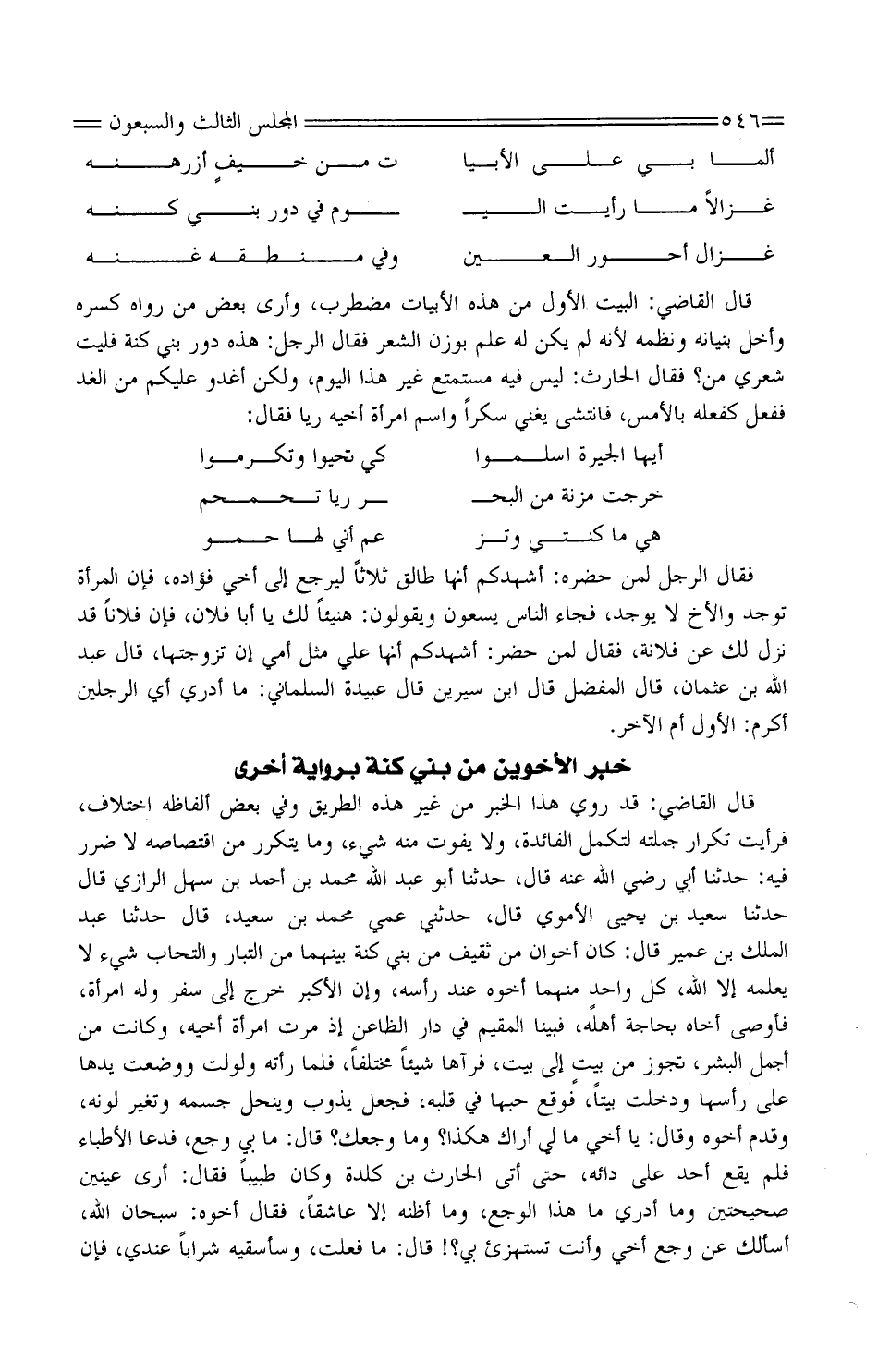 قَالَ القَاضِي: قد رُوِيَ هَذَا الْخَبَر من غير هَذِه الطَّرِيق وَفِي بعض أَلْفَاظه اخْتِلَاف، فَرَأَيْت تكْرَار جملَته لتكمل الْفَائِدَة، وَلَا يفوت مِنْهُ شَيْء، وَمَا يتَكَرَّر من اقتصاصه لَا ضَرَر فِيهِ: حَدَّثَنَا أبي رَضِيَ اللَّه عَنْهُ قَالَ، حَدَّثَنَا أَبُو عَبْد اللَّه مُحَمَّد بْن أَحْمَد بْن سهل الرَّازِيّ قَالَ حَدَّثَنَا سعيد بْن يحيى الْأمَوِي قَالَ، حَدَّثَنِي عمي مُحَمَّد بْنُ سَعِيدٍ، قَالَ حَدَّثَنَا عَبْدُ الْملك بن عيمر قَالَ: كَانَ أَخَوان من ثَقِيف من بني كنة بَينهمَا من التبار والتحاب شَيْء لَا يُعلمهُ إِلَّا الله، كل واحدٍ مِنْهُمَا أَخُوهُ عِنْد رَأسه، وَإِن الْأَكْبَر خرج إِلَى سفر وَله امْرَأَة، فأوصى أَخَاهُ بحاجة أَهله، فَبينا الْمُقِيم فِي دَار الظاعن إِذْ مرت امْرَأَة أَخِيه، وَكَانَت من أجمل الْبشر، تجوز من بيتٍ إِلَى بَيت، فرآها فأى شَيْئا مُخْتَلفا، فَلَمَّا رَأَتْهُ ولولت وَوضعت يَدهَا على رَأسهَا وَدخلت بَيْتا، فَوَقع حبها فِي قلبه، فَجعل يذوب وينحل جِسْمه وَتغَير لَونه، وَقدم أَخُوهُ وَقَالَ: يَا أخي مَالِي أَرَاك هَكَذَا؟ وَمَا وجعك:؟ قَالَ: مَا بِي وجع، فَدَعَا الْأَطِبَّاء فَلم يَقع أحد على دائه، حَتَّى أُتِي الْحَارِث بن كلدة وَكَانَ طَبِيبا فَقَالَ: أرى عينين صحيحتين وَمَا أَدْرِي مَا هَذَا الوجع، وَمَا أَظُنهُ إِلَّا عَاشِقًا، فَقَالَ أَخُوهُ: سُبْحَانَ الله، أَسَالَك عَن وجع أخي وَأَنت تستهزئ بِي؟! قَالَ: مَا فعلت، وسأسقيه شرابًا عِنْدِي، فَإِن