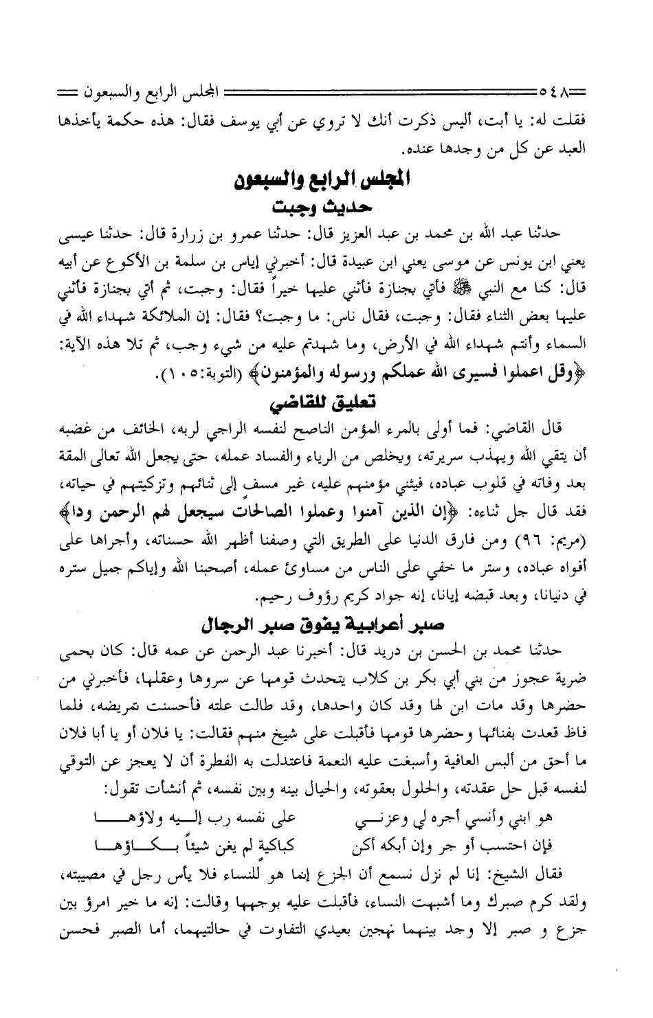 فَقَالَ الشَّيْخ: إِنَّا لم نزل نسْمع أَن الْجزع إِنَّمَا هُوَ للنِّسَاء فَلَا يأس رجل فِي مصيبته، وَلَقَد كرم صبرك وَمَا أشبهت النِّسَاء، فَأَقْبَلت عَلَيْهِ بوجهها وَقَالَت: إِنَّه مَا خير امْرُؤ بَين جزع وصَبر إِلَّا وجد بَينهمَا نهجين بعيدي التَّفَاوُت فِي حاليتهما، أما الصَّبْر فَحسن