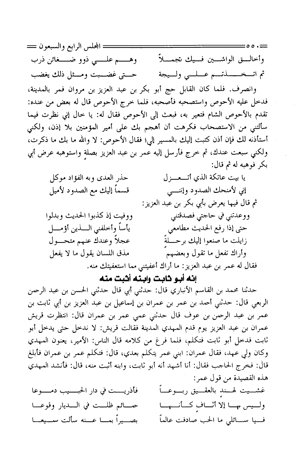 حَدثنَا مُحَمَّد بْن القَاسِم الأنبَاريّ قَالَ: حَدَّثَنِي أبي قَالَ حَدَّثَنِي الْحَسَن بْن عَبْد الرَّحْمَن الربعِي قَالَ: حَدَّثَنِي أَحْمَد بْن عمر بْن عمرَان بْن إِسْمَاعِيل بْن عبد الْعَزِيز بْن أَبِي ثَابت بْن عمر بْن عَبْد الرَّحْمَن بْن عَوْف قَالَ حَدَّثَنِي عمي عمر بْن عمرَان قَالَ: انتظرت قُرَيْش عمرَان بْن عبد الْعَزِيز يَوْم قدم الْمهْدي الْمَدِينَة فَقَالَت قُرَيْش: لَا ندخل حَتَّى يدْخل أَبُو ثَابت فَدخل أَبُو ثَابت فَتكلم، فَلَمَّا فرغ من كَلَامه قَالَ النَّاس: الْأَمِير، يعنون المهدين وَكَانَ ولي عهد، فَقَالَ عمرَان: انبي عمر يتَكَلَّم بعدِي، قَالَ: فَتكلم عمر بْن عمرَان فأبلغ قَالَ: فَخرج الْحَاجِب فَقَالَ: أَنا أشهد إِنَّه أَبُو ثَابت، وَابْنه أثبت مِنْهُ، قَالَ: فَأَنْشد الْمهْدي هَذِه القصيدة من قَول عمر: