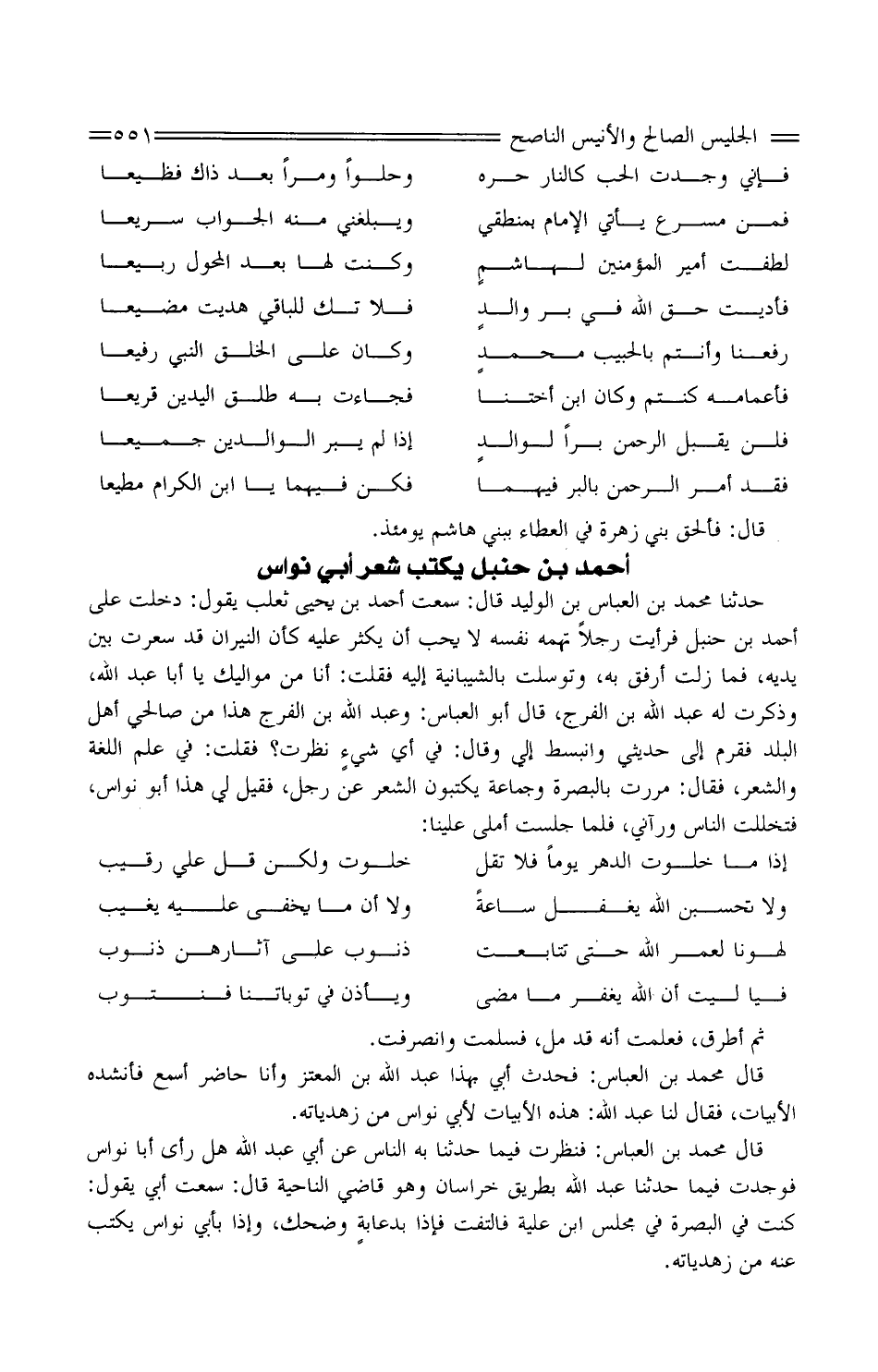 حَدَّثَنَا مُحَمَّدُ بْنُ الْعَبَّاسِ بْنِ الْوَلِيد قَالَ: سَمِعت أَحْمَد بْن يحيى ثَعْلَب يَقُول: دخلت على أَحْمَد بْن حَنْبَل فَرَأَيْت رجلا تهمه نَفسه لَا يحب أَن يكثر عَلَيْهِ كَأَن النيرَان قد سعرت بَين يَدَيْهِ، فَمَا زلت أرْفق بِهِ، وتوسلت بالشيبانية إِلَيْهِ فَقلت: أَنا من مواليك يَا أَبَا عَبد اللَّه، وَذكرت لَهُ عَبد اللَّه بْن الْفرج، قَالَ أَبُو الْعَبَّاس: وَعبد الله بْن الْفرج هَذَا من صالحي أهل الْبَلَد فقرم إِلَى حَدِيثي وانبسط إِلَيّ وَقَالَ: فِي أَي شيءٍ نظرت؟ فَقلت: فِي علم اللُّغَة وَالشعر، فَقَالَ: مَرَرْت بِالْبَصْرَةِ وَجَمَاعَة يَكْتُبُونَ الشّعْر عَن رجل، فَقيل لي هَذَا أَبُو نواس، فتخللت النَّاس ورآني، فَلَمَّا جَلَست أمل علينا:
