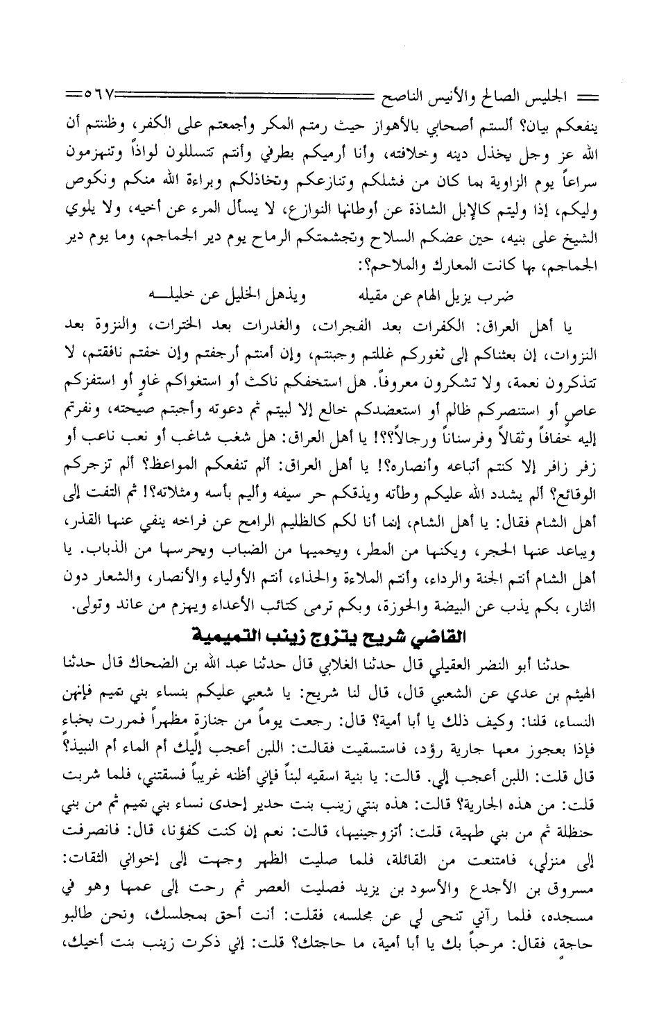 حَدثنَا أَبُو النَّضر الْعقيلِيّ قَالَ حَدَّثَنَا الْغلابِي قَالَ حَدَّثَنَا عَبْدُ اللَّهِ بْنُ الضَّحَّاك قَالَ حَدَّثَنَا الْهَيْثَم بْن عدي عَن الشّعبِيّ قَالَ، قَالَ لنا شُرَيْح: يَا شعبي عَلَيْكُم بنساء بني تَمِيم فَإِنَّهُنَّ النِّسَاء، قُلْنَا: وَكَيف ذَلِك يَا أَبَا أُميَّة؟ قَالَ: رجعت يَوْمًا من جنازةٍ مظْهرا فمررت بخباءٍ فَإِذا بِعَجُوزٍ مَعهَا جَارِيَة رؤد، فاستسقيت فَقَالَت: اللَّبن أعجب إِلَيْك أم المَاء أم النَّبِيذ؟ قَالَ قلت: اللَّبن أعجب إِلَيّ. قَالَت: يَا بنية اسقيه لَبَنًا فَإِنِّي أَظُنهُ غَرِيبا، فسقتني، فَلَمَّا شربت قلت: من هَذِه الْجَارِيَة؟ قَالَت: هَذِه بِنْتي زَيْنَب بنت حدير إِحْدَى نسَاء بني تَمِيم ثُمَّ من بني حَنْظَلَة ثُمَّ من بني طهية، قلت: أتزوجينيها، قَالَت: نعم إِن كنت كفؤنا، قَالَ: فَانْصَرَفت إِلَيّ منزلي، فامتنعت من القائلة، فَلَمَّا صليت الظّهْر وجهت إِلَى إخْوَانِي الثِّقَات: مَسْرُوق بْن الأجدع وَالْأسود بْن يزِيد فَصليت الْعَصْر ثُمَّ رحت إِلَى عَمها وَهُوَ فِي مَسْجده، فَلَمَّا رَآنِي تنحى لي عَن مَجْلِسه، فَقلت: أَنْت أَحَق بمجلسك، وَنحن طالبو حاجةٍ، فَقَالَ: مرْحَبًا بك يَا أَبَا أُميَّة، مَا حَاجَتك؟ قلت: إِنِّي ذكرت زَيْنَب بنت أَخِيك،