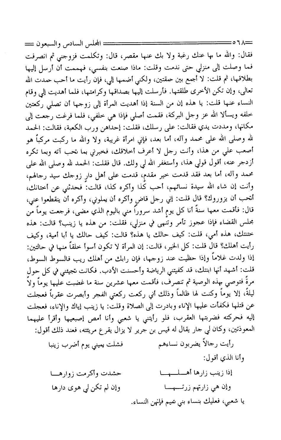 فَقَالَ: وَالله مَا بهَا عَنْك رَغْبَة وَلَا بك عَنْهَا مقصر، قَالَ: وتكلمت فَزَوجنِي ثُمَّ انصرفت فَمَا وصلت إِلَى منزلي حَتَّى نَدِمت وَقلت: مَاذَا صنعت بنفسي، فهممت أَن أرسل إِلَيْهَا بِطَلَاقِهَا، ثُمّ قلت: لَا أجمع بَين حمقتين، وَلَكِنِّي أضمها إِلَيّ، فَإِن رَأَيْت مَا أحب حمدت الله تَعَالَى، وَإِن تكن الْأُخْرَى طَلقتهَا. فَأرْسلت إِلَيْهَا بصداقها وكرامتها، فَلَمَّا أهديت إِلَيّ وَقَامَ النِّسَاء عَنْهَا قلت: يَا هَذِه إِن من السّنة إِذا أهديت الْمَرْأَة إِلَى زَوجهَا أَن تصلي رَكْعَتَيْنِ خَلفه ويسألا الله عز وَجل الْبركَة، فَقُمْت أُصَلِّي فَإِذا هِيَ خَلْفي، فَلَمَّا فرغت رجعت إِلَى مَكَانهَا، ومددت يَدي فَقَالَت: على رسلك، فَقلت: إِحْدَاهُنَّ وَرب الْكَعْبَة، فَقَالَت: الْحَمد لله وَصلى الله على مُحَمَّد وَآله، أما بعد، فَإِنِّي امْرَأَة غَرِيبَة، وَلَا وَالله مَا ركبت مركبا هُوَ أصعب عَليّ من هَذَا، وَأَنت رجل لَا أعرف أخلاقك، فخبرني بِمَا تحب آته وَبِمَا تكره أزدجر عَنْهُ، أَقُول قولي هَذَا، واستغفر الله لي وَلَك. قَالَ فَقلت: الْحَمد لله وَصلى الله على مُحَمَّد وَآله، أما بعد فقد قدمت خير مقدمٍ، قدمت على أهل دارٍ زَوجك سيد رِجَالهمْ، وَأَنت إِن شَاءَ الله سيدة نِسَائِهِم، أحب كَذَا وأكره كَذَا، قَالَت: فَحَدثني عَن أختانك، أَتُحِبُّ أَن يزوروك؟ قَالَ قلت: إِنِّي رجل قاضٍ وأكره أَن يملوني، وأكره أَن ينقطعوا عني، قَالَ: فأقمت مَعهَا سنة أَنا كل يومٍ اشد سُرُورًا مني بِالْيَوْمِ الَّذِي مضى، فَرَجَعت يَوْمًا من مجْلِس الْقَضَاء فَإِذا عَجُوز تَأمر وتنهي فِي منزلي، فَقلت: من هَذِه يَا زَيْنَب؟ قَالَت: هَذِه ختنتك، هَذِه أُمِّي، قلت: كَيفَ حالك يَا هَذِه؟ قَالَت: كَيفَ حالك يَا أَبَا أُميَّة، وَكَيف رَأَيْت أهلك؟ قَالَ قلت: كل الْخَيْر، قَالَت: إِن الْمَرْأَة لَا تكون أَسْوَأ خلقا مِنْهَا فِي حالتين: إِذا ولدت غُلَاما وَإِذا حظيت عِنْد زَوجهَا، فَإِن رَابَك من أهلك ريب فالسوط السَّوْط، قلت: أشهد أَنَّهَا ابْنَتك، قد كفيتني الرياضة وأحسنت الْأَدَب. فَكَانَت تجيئني فِي كل حولٍ مرّة فتوصي بِهَذِهِ الْوَصِيَّة ثُمَّ تَنْصَرِف، فاقمت مَعهَا عشْرين سنة مَا غضِبت عَلَيْهَا يَوْمًا وَلَا لَيْلَة، إِلَّا يَوْمًا وَكنت لَهَا ظَالِما وَذَلِكَ أَنِّي ركعت رَكْعَتي الْفجْر وأبصرت عقربًا فعجلت عَن قَتلهَا فكفأت عَلَيْهَا الْإِنَاء وبادرت إِلَى الصَّلَاة وَقلت: يَا زَيْنَب إياك والإناء، فعجلت إِلَيْهِ فحركته فضربتها الْعَقْرَب، فَلَو رَأَيْتنِي يَا شعبي وَأَنا أمص إصبعيها وأقرأ عَلَيْهِمَا المعوذتين، وَكَانَ لي جَار يُقَال لَهُ قيس بْن جرير لَا يزَال يقرع مريئته، فَعِنْدَ ذَلِك أَقُول:
