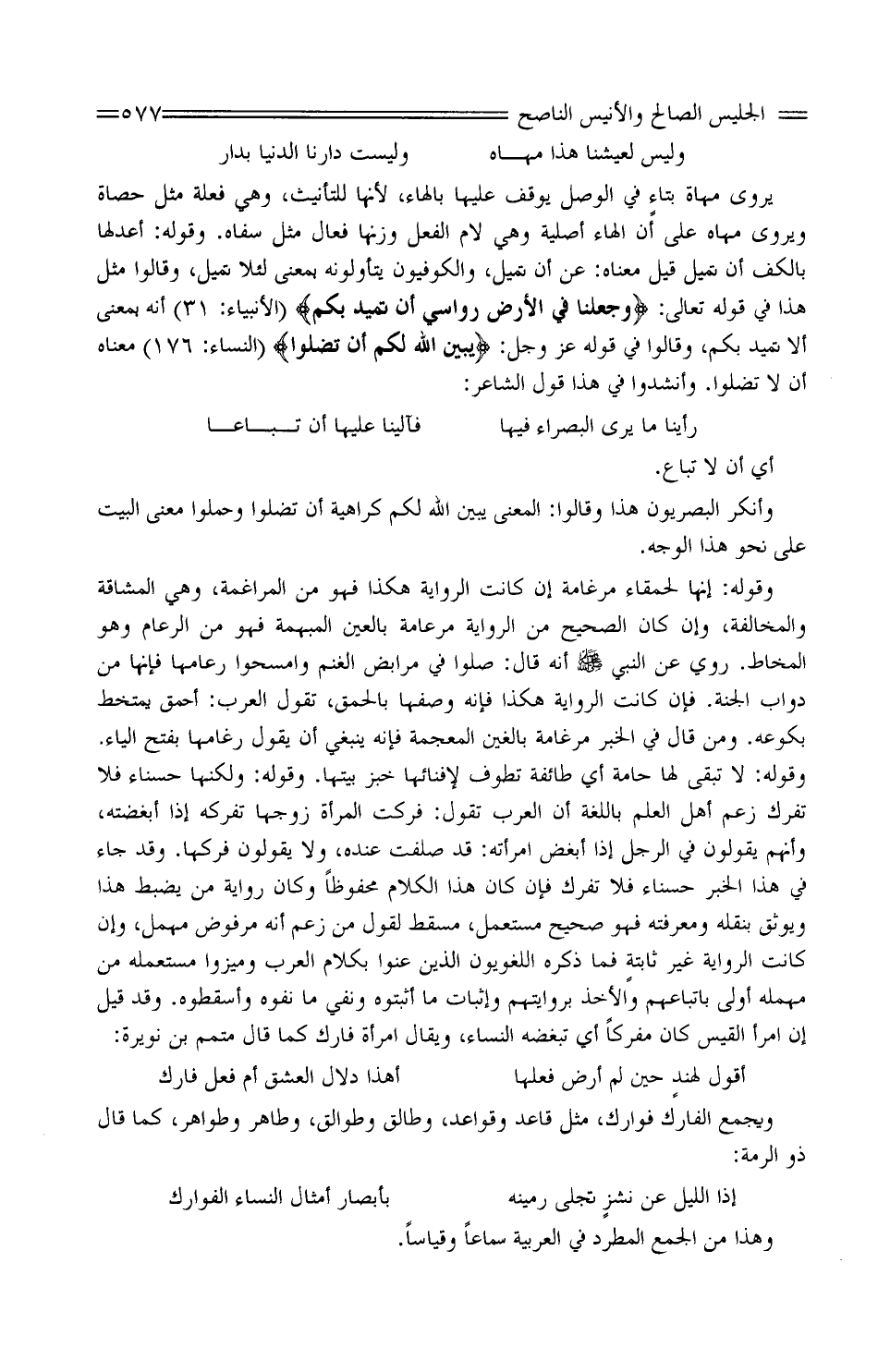 يرْوى مهاة بتاءٍ فِي الْوَصْل يُوقف عَلَيْهَا بِالْهَاءِ، لِأَنَّهَا للتأنيث، وَهِي فعلة مثل حَصَاة ويروى مهاة على أَن الْهَاء أَصْلِيَّة وَهِي لَام الْفِعْل وَزنهَا فعال مثل سفاه. وَقَوله: أعدلها بالكف أَن تميلا قيل مَعْنَاهُ: عَن أَن تميل، والكوفيون يتأولونه بِمَعْنى لِئَلَّا تميل، وَقَالُوا مثل هَذَا فِي قَوْله تَعَالَى: " وَجَعَلْنَا فِي الأَرْض رواسي أَن تميد بكم " الْأَنْبِيَاء:31 أَنه بِمَعْنى أَلا تميد بكم، وَقَالُوا فِي قَوْله عز وَجل: " يُبَيِّنُ اللَّهُ لَكُمْ أَنْ تَضِلُّوا النِّسَاء: 176 مَعْنَاهُ أَن لَا تضلوا. وأنشدوا فِي هَذَا قَول الشَّاعِر: