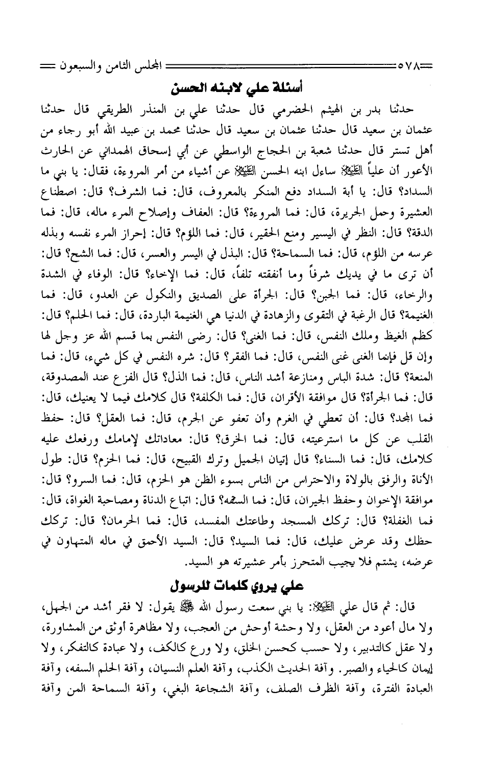 حَدَّثَنَا بَدْرُ بْنُ الْهَيْثَمِ الْحَضْرَمِيُّ قَالَ حَدَّثَنَا عَلِيُّ بْنُ الْمُنْذِرِ الطَّرِيقِيُّ قَالَ حَدَّثَنَا عُثْمَانُ بْنُ سَعِيدٍ قَالَ حَدَّثَنَا عُثْمَانُ بْنُ سَعِيدٍ قَالَ حَدثنَا مُحَمَّد بن عَبدِي اللَّهِ أَبُو رَجَاءٍ مِنْ أَهْلِ تُسْتَرَ قَالَ حَدَّثَنَا شُعْبَةُ بْنُ الْحَجَّاجِ الْوَاسِطِيُّ عَنْ أَبِي إِسْحَاقَ الْهَمْدَانِيِّ عَنِ الْحَارِثِ الأَعْوَرِ أَنَّ عليا عَلَيْهِ السَّلَام ساءل ابْنَهُ الْحَسَنَ عَلَيْهِ السَّلامُ عَنْ أَشْيَاءَ مِنْ أَمْرِ الْمُرُوءَةِ، فَقَالَ: يَا بَنِيَّ مَا السَّدَادُ؟ قَالَ: يَا أَبَةِ السَّدَادُ دَفْعُ الْمُنْكَرِ بِالْمَعْرُوفِ، قَالَ: فَمَا الشَّرَفُ؟ قَالَ: اصْطِنَاعُ الْعَشِيرَةِ وَحَمْلُ الْجَرِيرَةِ، قَالَ: فَمَا الْمُرُوءَةُ؟ قَالَ: الْعَفَافُ وَإِصْلاحُ الْمَرْءِ مَالَهُ، قَالَ: فَمَا الدِّقَّةُ؟ قَالَ: النَّظَرُ فِي الْيَسِيرِ وَمَنْعُ الْحَقِيرِ، قَالَ: فَمَا اللُّؤْمُ؟ قَالَ: إِحْرَازُ الْمَرْءِ نَفْسِهِ وَبَذْلَهُ عُرْسِهِ مِنَ اللُّؤْمِ، قَالَ: فَمَا السَّمَاحَةُ؟ قَالَ: الْبَذْلُ فِي الْيُسْرِ وَالْعُسْرِ، قَالَ: فَمَا الشُّحُّ؟ قَالَ: أَنْ تَرَى مَا فِي يَدَيْكَ شَرَفًا وَمَا أَنْفَقْتُهُ تَلَفًا، قَالَ: فَمَا الإِخَاءُ؟ قَالَ: الْوَفَاءُ فِي الشِّدَّةِ وَالرَّخَاءِ، قَالَ: فَمَا الْجُبْنُ؟ قَالَ: الْجُرْأَةُ عَلَى الصَّدِيقِ وَالنُّكُولُ عَنِ الْعَدُوِّ، قَالَ: فَمَا الْغَنِيمَةُ؟ قَالَ الرَّغْبَةُ فِي التَّقْوَى وَالزَّهَادَةُ فِي الدُّنْيَا هِيَ الْغَنِيمَةُ الْبَارِدَةُ، قَالَ: فَمَا الْحِلْمُ؟ قَالَ: كَظْمُ الْغَيْظِ وَمَلْكُ النَّفْسِ، قَالَ: فَمَا الْغِنَى؟ قَالَ: رِضَى النَّفْسِ بِمَا قَسَمَ اللَّهُ عَزَّ وَجَلَّ لَهَا وَإِنْ قَلَّ فَإِنَّمَا الْغِنَى غِنَى النَّفْسِ، قَالَ: فَمَا الْفَقْرُ؟ قَالَ: شَرَهُ النَّفْسِ فِي كُلِّ شَيْءٍ، قَالَ: فَمَا الْمَنَعَةُ؟ قَالَ: شِدَّةُ الْبَاسِ وَمُنَازَعَةُ أَشَدِّ النَّاسِ، قَالَ: فَمَا الذُّلُّ؟ قَالَ الْفَزَعُ عِنْدَ الْمَصْدُوقَةِ، قَالَ: فَمَا الْجُرْأَةُ؟ قَالَ مُوَافَقَةُ الأَقْرَانِ، قَالَ: فَمَا الْكُلْفَةُ؟ قَالَ كَلامُكَ فِيمَا لَا يَعْنِيكَ، قَالَ: فَمَا الْمَجْدُ؟ قَالَ: أَنْ تُعْطِيَ فِي الْغُرْمِ وَأَنْ تَعْفُوَ عَنِ الْجُرْمِ، قَالَ: فَمَا الْعَقْلُ؟ قَالَ: حِفْظُ الْقَلْبِ عَنْ كُلِّ مَا اسْتَرْعَيْتَهُ، قَالَ: فَمَا الْخُرْقُ؟ قَالَ: مُعَادَاتُكَ لإِمَامِكَ وَرَفْعُكَ عَلَيْهِ كَلامَكَ، قَالَ: فَمَا السناء؟ قَالَ إيتان الْجَمِيلِ وَتَرْكُ الْقَبِيحِ، قَالَ: فَمَا الْحَزْمُ؟ قَالَ: طُولُ الأَنَاةِ وَالرِّفْقُ بِالْوُلاةِ وَالاحْتِرَاسُ مِنَ النَّاسِ بِسُوءِ الظَّنِّ هُوَ الْحَزْمُ، قَالَ: فَمَا السَّرْوُ؟ قَالَ: مُوَافَقَةُ الإِخْوَانِ وَحِفْظُ الْجِيرَانِ، قَالَ: فَمَا السَّفَهُ؟ قَالَ: اتِّبَاعُ الدَّنَاةِ وَمُصَاحَبَةُ الْغُوَاةِ، قَالَ: فَمَا الْغَفْلَةُ؟ قَالَ: تَرْكُكَ الْمَسْجِدَ وَطَاعَتُكَ الْمُفْسِدَ، قَالَ: فَمَا الْحِرْمَانُ؟ قَالَ: تَرْكُكَ حَظِّكَ وَقَدْ عُرِضَ عَلَيْكَ، قَالَ: فَمَا السَّيِّدُ؟ قَالَ: السَّيِّدُ الأَحْمَقُ فِي مَالِهِ الْمُتَهَاوِنُ فِي عِرْضِهِ، يَشْتُمُ فَلا يُجِيبُ الْمُتَحَرِّزُ بِأَمْرِ عَشِيرَتِهِ هُوَ السَّيِّدُ.