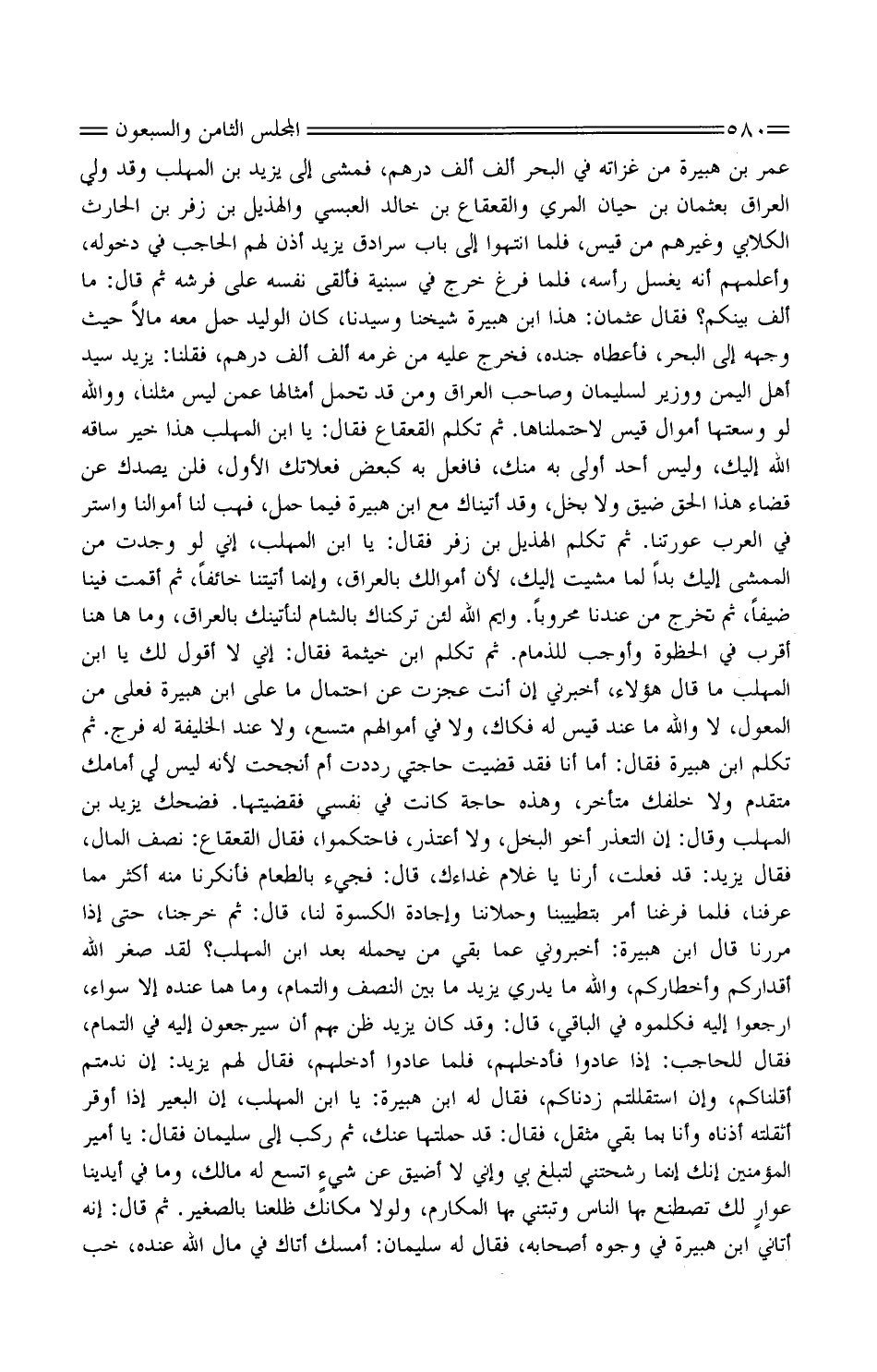 عمر بْن هُبَيْرَة من غزاته فِي الْبَحْر ألف ألف دِرْهَم، فَمشى إِلَى يزِيد بْن الْمُهلب وَقد ولي الْعرَاق بعثمان بْن حَيَّان المري والقعقاع ابْن خَالِد الْعَبْسِي والهذيل بْن زفر بْن الْحَارِث الْكلابِي وَغَيرهم من قيس، فَلَمَّا انْتَهوا إِلَى بَاب سرادق يزِيد أذن لَهُم الْحَاجِب فِي دُخُوله، وأعلمهم أَنه يغسل رَأسه، فَلَمَّا فرغ خرج فِي سبنية فَألْقى نَفسه على فرشه ثُمَّ قَالَ: مَا ألف بَيْنكُم؟ فَقَالَ عُثْمَان: هَذَا ابْن هُبَيْرَة شَيخنَا وَسَيِّدنَا، كَانَ الْوَلِيد حمل مَعَه مَالا حَيْثُ وَجهه إِلَى الْبَحْر، فَأعْطَاهُ جنده، فَخرج عَلَيْهِ من غرمه ألف ألف دِرْهَم، فَقُلْنَا: يزِيد سيد أهل الْيمن ووزير لِسُلَيْمَان وَصَاحب الْعرَاق وَمن قد تحمل أَمْثَالهَا عَمَّن لَيْسَ مثلنَا، وَوَاللَّه لَو وسعتها أَمْوَال قيس لاحتملناها. ثُمَّ تكلم الْقَعْقَاع فَقَالَ: يَا ابْن الْمُهلب هَذَا خير سَاقه الله إِلَيْك، وَلَيْسَ أحد أولى بِهِ مِنْك، فافعل بِهِ كبعض فعلاتك الأول، فَلَنْ يصدك عَن قَضَاء هَذَا الْحق ضيق وَلَا بخل، وَقد أَتَيْنَاك مَعَ ابْن هُبَيْرَة فِيمَا حمل، فَهَب لنا أَمْوَالنَا واستر فِي الْعَرَب عورتنا. ثُمَّ تكلم الْهُذيْل بْن زفر فَقَالَ: يَا ابْن الْمُهلب، إِنِّي لَو وجدت من الممشى إِلَيْك بدا لما مشيت إِلَيْك، لِأَن أموالك بالعراق، وَإِنَّمَا أَتَيْتنَا خَائفًا، ثُمَّ أَقمت فِينَا ضيفًا، ثُمَّ تخرج من عندنَا محروبًا. وَايْم الله لَئِن تركناك بِالشَّام لنأتينك بالعراق، وَمَا هَا هُنَا أقرب فِي الحظوة وَأوجب للذمام. ثُمَّ تكلم ابْن خَيْثَمَة فَقَالَ: إِنِّي لَا أَقُول لَك يَا ابْن الْمُهلب مَا قَالَ هَؤُلَاءِ، أَخْبرنِي إِن أَنْت عجزت عَن احْتِمَال مَا عَليّ ابْن هُبَيْرَة فعلى من الْمعول، لَا وَالله ماعند قيس لَهُ فكاك، وَلَا فِي أَمْوَالهم متسع، وَلَا عِنْد الْخَلِيفَة لَهُ فرج. ثُمَّ تكلم ابْن هُبَيْرَة فَقَالَ: أما أَنا فقد قضيت حَاجَتي رددت أم أنجحت لِأَنَّهُ لَيْسَ لي أمامك مُتَقَدم وَلَا خَلفك مُتَأَخّر، وَهَذِه حَاجَة كَانَت فِي نَفسِي فقضيتها. فَضَحِك يزِيد بْن الْمُهلب وَقَالَ: إِن التَّعَذُّر أَخُو الْبُخْل، وَلَا أعْتَذر، فاحتكموا، فَقَالَ الْقَعْقَاع: نصف المَال، فَقَالَ يزِيد: قد فعلت، أرنا يَا غُلَام غداءك، قَالَ: فجيء بِالطَّعَامِ فأنكرنا مِنْهُ أَكثر مِمَّا عرفنَا، فَلَمَّا فَرغْنَا أَمر بتطييبنا وحملاننا وإجادة الْكسْوَة لنا، قَالَ: ثُمَّ خرجنَا، حَتَّى إِذا مَرَرْنَا قَالَ ابْن هُبَيْرَة: أخبروني عَمَّا بَقِي من يحملهُ بعد ابْن الْمُهلب؟ لقد صغر الله أقداركم وأخطاركم، وَالله مَا يدْرِي يزِيد مَا بَين النّصْف والتمام، وَمَا هما عِنْده إِلَّا سَوَاء، ارْجعُوا إِلَيْهِ فكلموه فِي الْبَاقِي، قَالَ: وَقد كَانَ يزِيد ظن بهم أَن سيرجعون إِلَيْهِ فِي التَّمام، فَقَالَ للحاجب: إِذا عَادوا فأدخلهم، فَلَمَّا عَادوا أدخلهم، فَقَالَ لَهُم يزِيد: إِن ندمتم أقلناكم، وَإِن استقللتم زدناكم، فَقَالَ لَهُ ابْن هُبَيْرَة: يَا ابْن الْمُهلب، إِن الْبَعِير إِذا أوقر أثقلته أذنَاهُ وَأَنا بِمَا بَقِي مثقل، فَقَالَ: قد حملتها عَنْك، ثُمَّ ركب إِلَى سُلَيْمَان فَقَالَ: يَا أَمِير الْمُؤمنِينَ إِنَّك إِنَّمَا رشحتني لتبلغ بَين وَإِنِّي لَا أضيق عَن شيءٍ اتَّسع لَهُ مَالك، وَمَا فِي أَيْدِينَا عوارٍ لَك تصطنع بهَا النَّاس وتبتني بهَا المكارم، وَلَوْلَا مَكَانك ظلعنا بالصغير. ثُمَّ قَالَ: إِنَّه أَتَانِي ابْن هُبَيْرَة فِي وُجُوه أَصْحَابه، فَقَالَ لَهُ سُلَيْمَان: أمسك أَتَاك فِي مَال الله عِنْده، خب