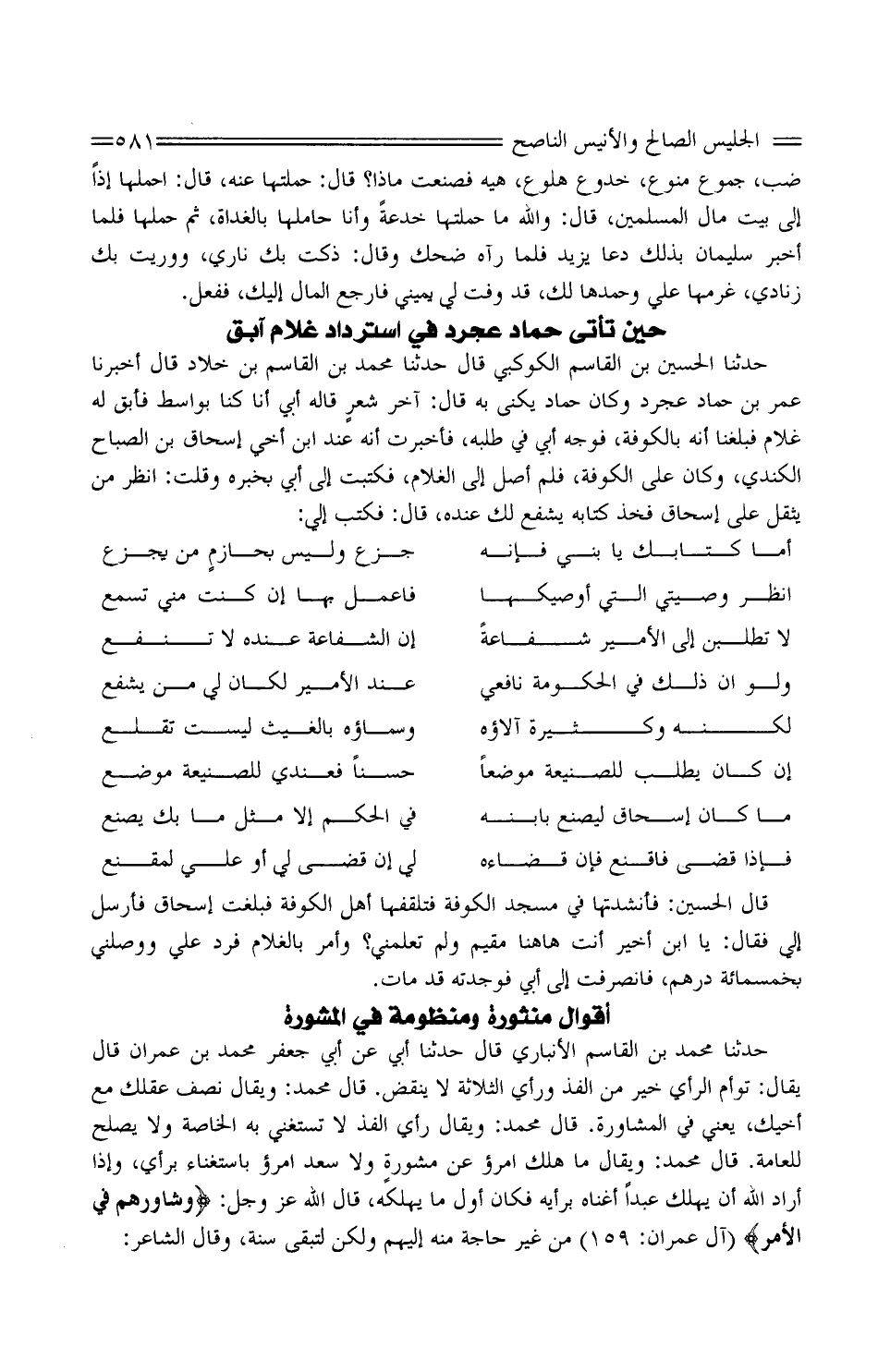 حَدثنَا الْحُسَيْنُ بْنُ الْقَاسِمِ الْكَوْكَبِيُّ قَالَ حَدَّثَنَا مُحَمَّد بْن القَاسِم بْن خَلاد قَالَ أَخْبَرَنَا عمر بْن حَمَّاد عجرد وَكَانَ حَمَّاد يكنى بِهِ قَالَ: آخر شعرٍ قَالَه أَبِي أَنا كُنَّا بواسط فأبق لَهُ غُلَام فَبَلغنَا أَنه بِالْكُوفَةِ، فَوجه أَبِي فِي طلبه، فَأخْبرت أَنه عِنْد ابْن أخي إِسْحَاق بْن الصَّباح الْكِنْدِيّ، وَكَانَ على الْكُوفَة، فَلم أصل إِلَى الْغُلَام، فَكتبت إِلَى أَبِي بِخَبَرِهِ وَقلت: أنظر من يثقل على إِسْحَاق فَخذ كِتَابه يشفع لَك عِنْده، قَالَ: فَكتب إِلَيّ: